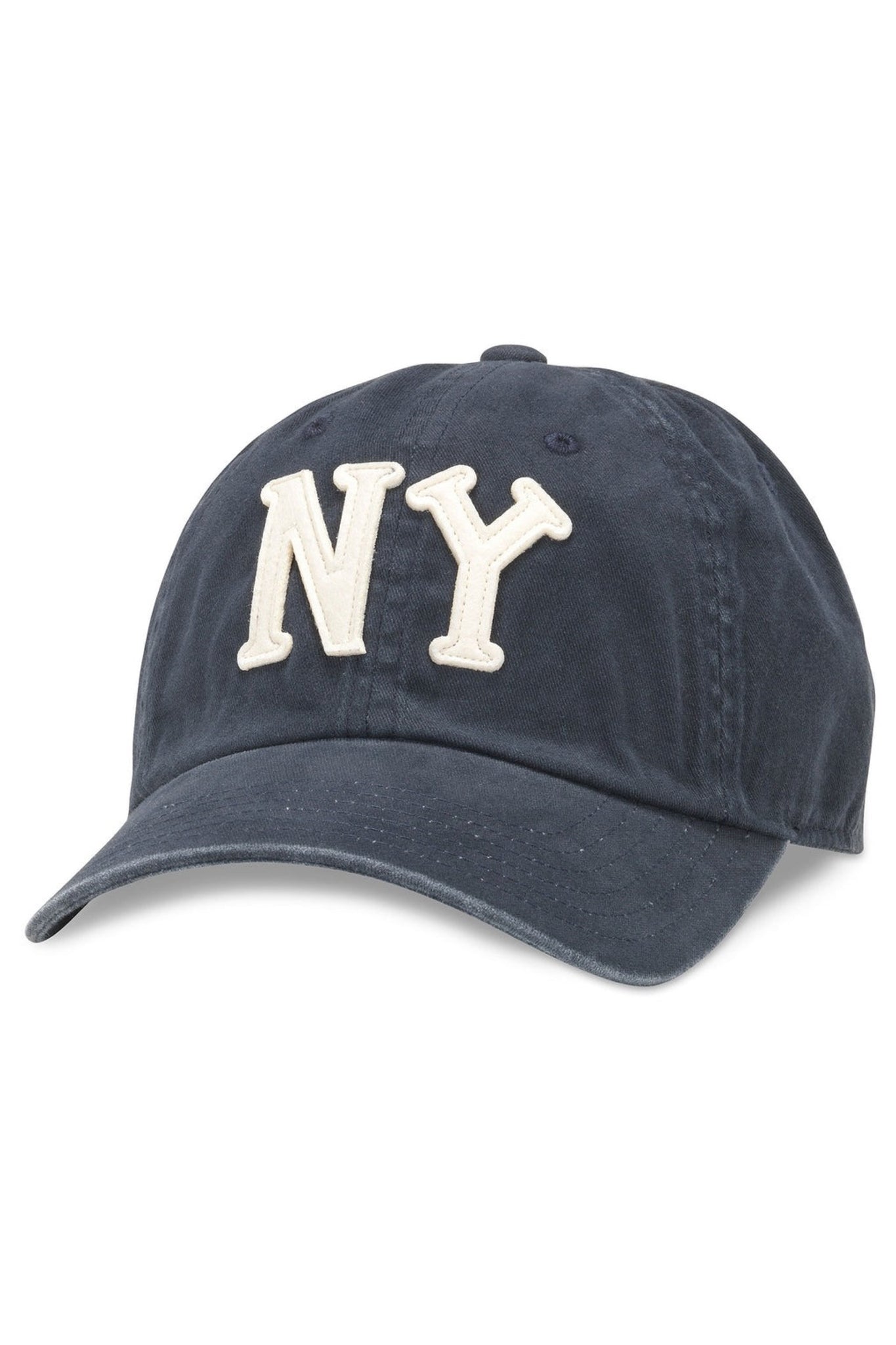Vintage washed cap featuring a retro New York die cut logo and an adjustable back strap with a vintage brass buckle.
