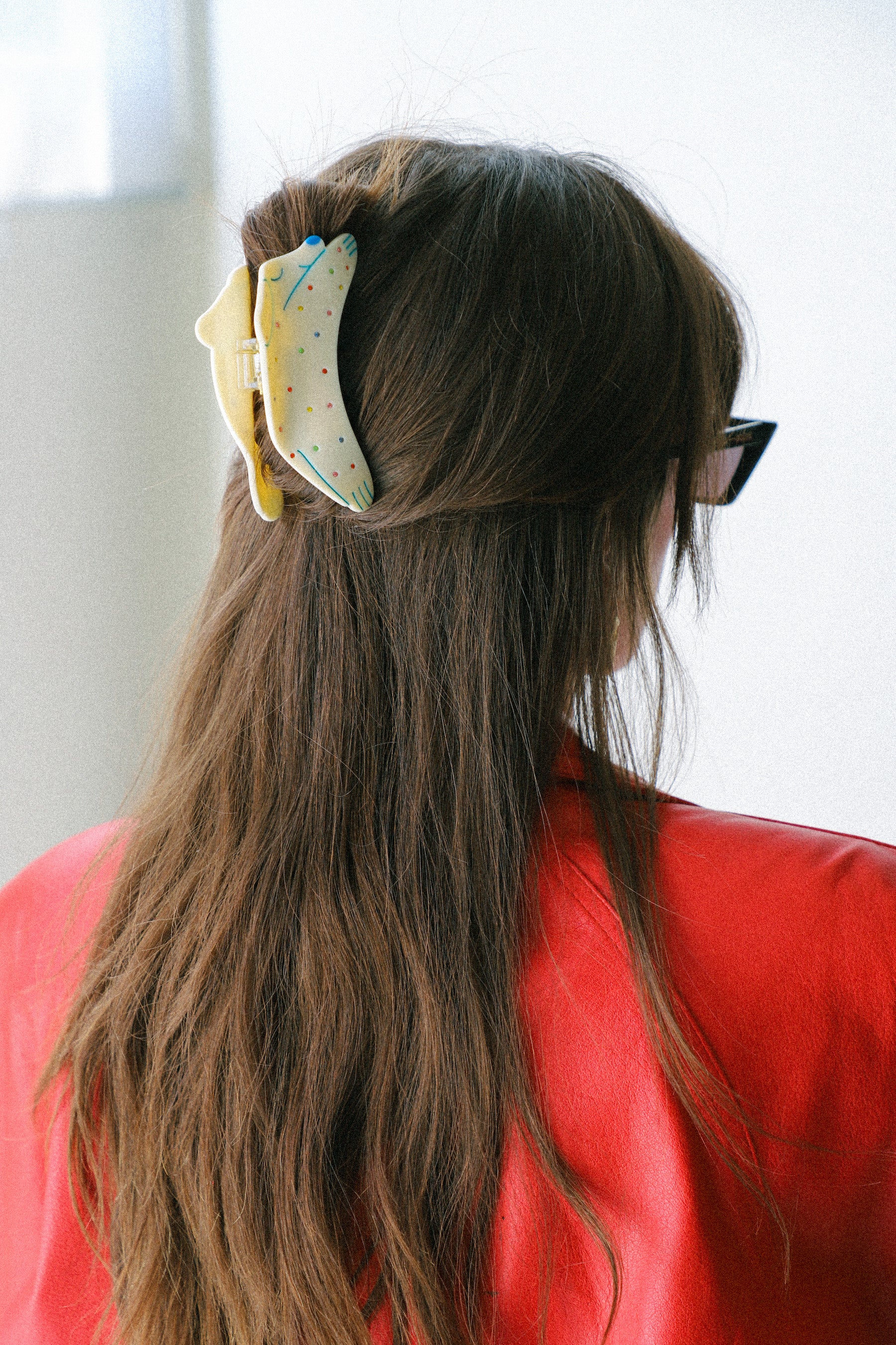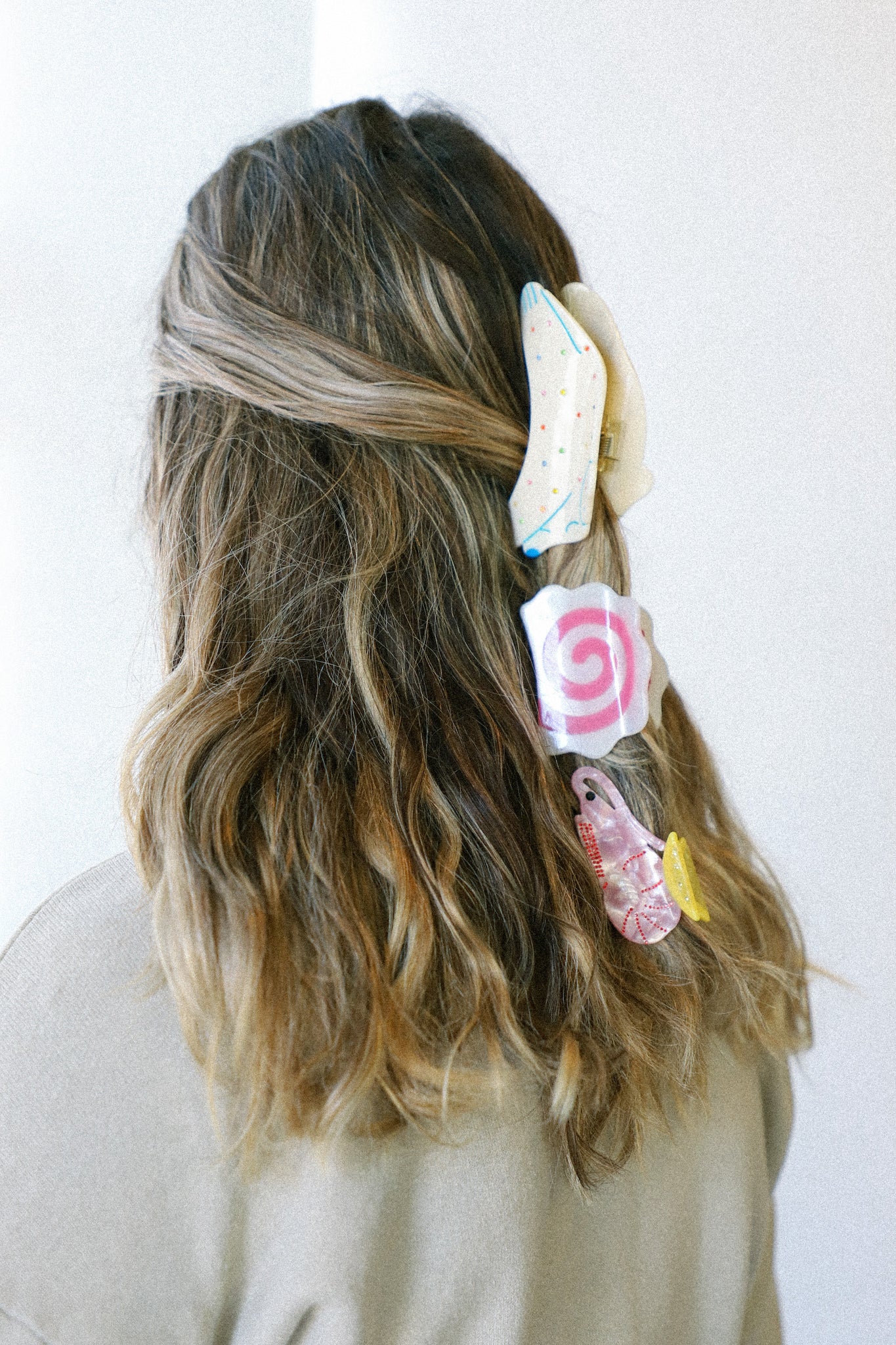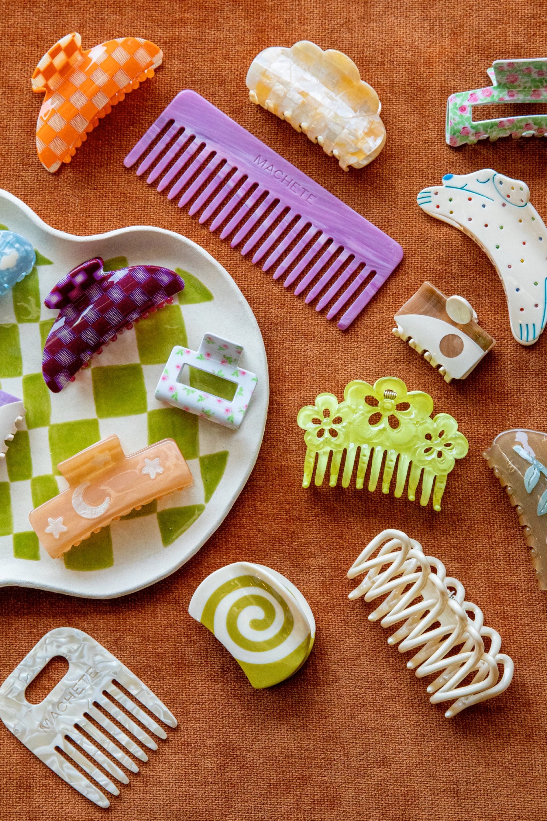 This hair claw looks elegant on its own and creates an iridescent bouquet in your hair.