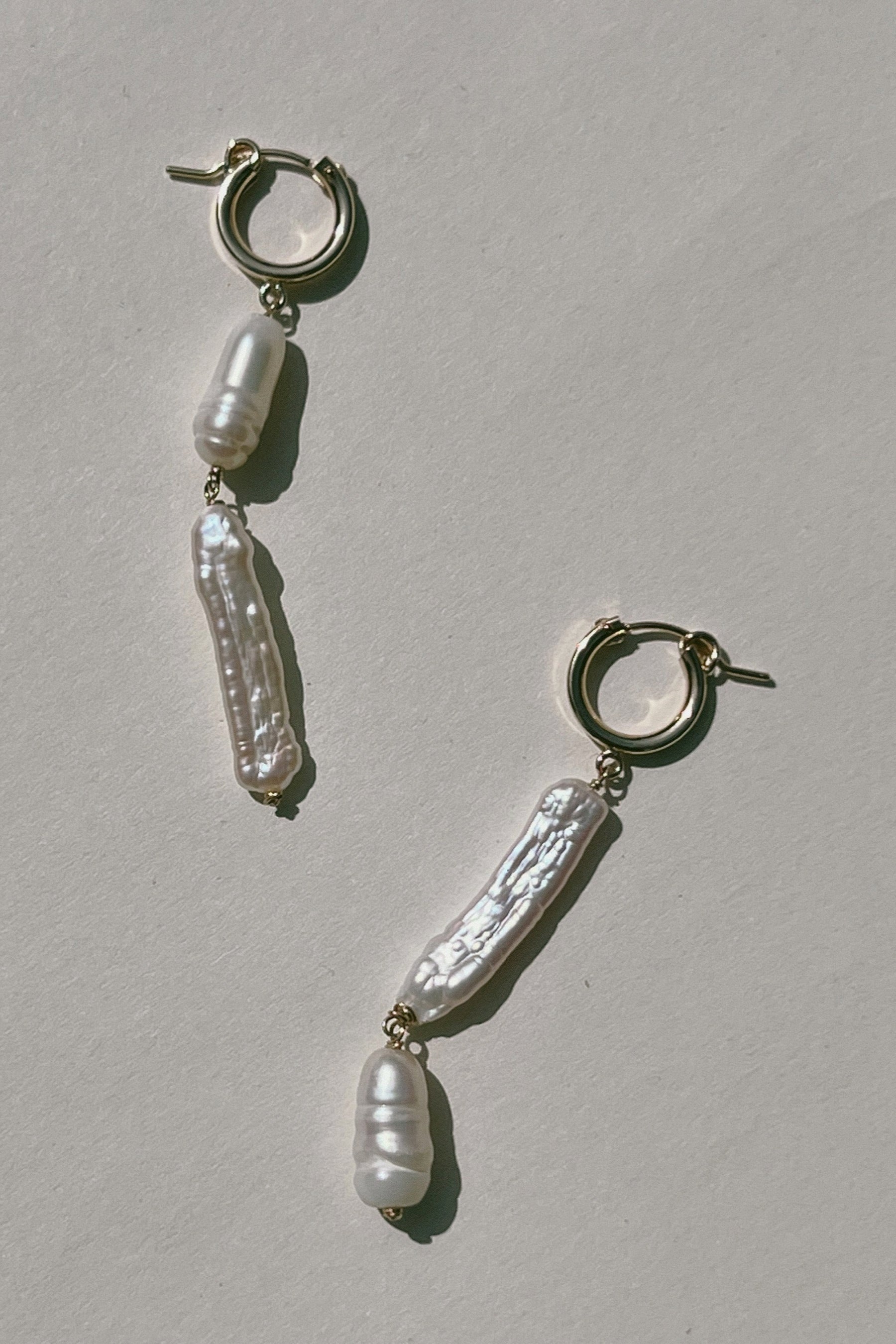 An asymmetric hoop featuring freshwater and Keshi pearls.