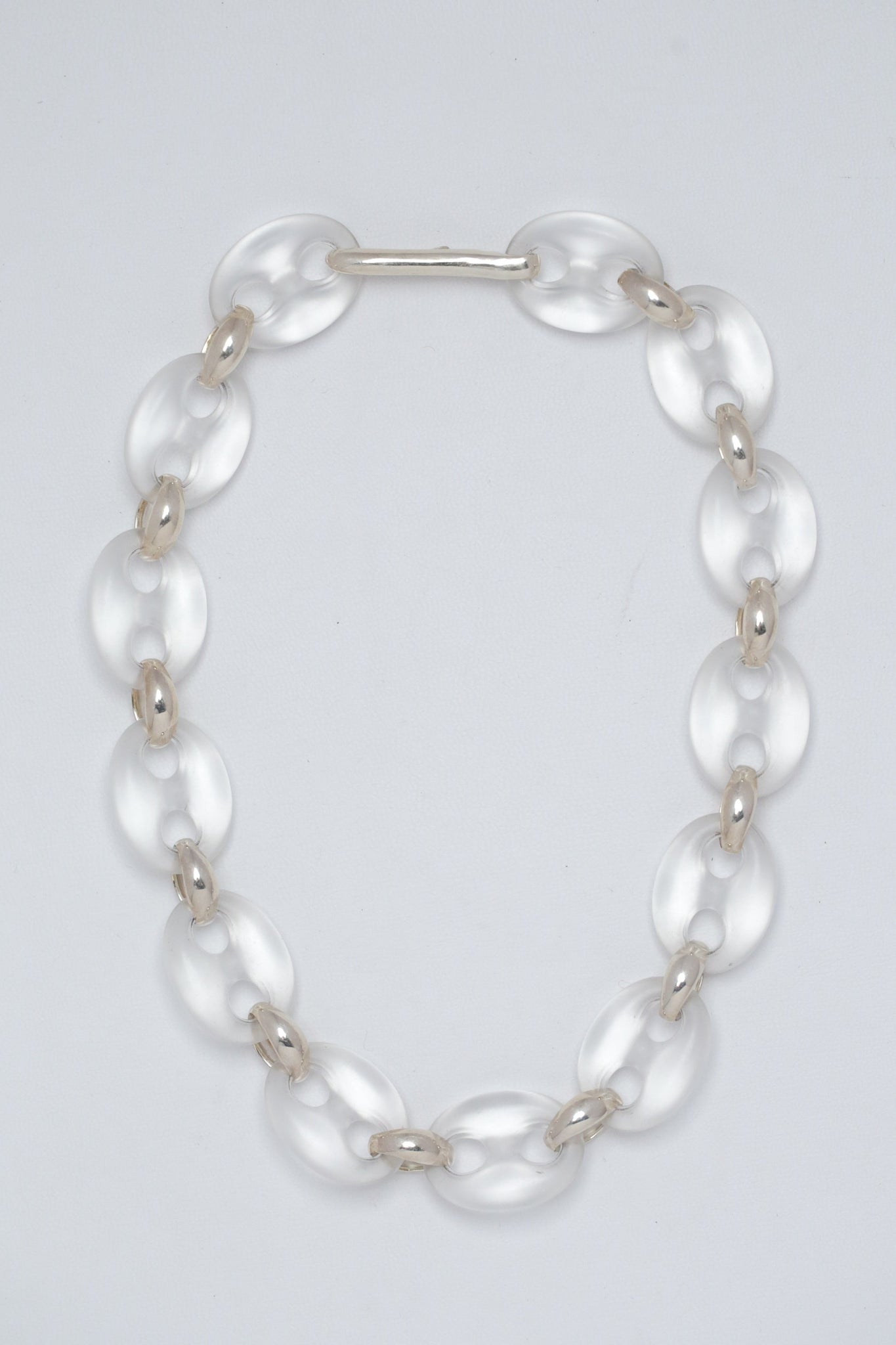 The Soet Necklace is an original 67 design. Clear resin beads hooked together by sterling silver jump rings and a hook clasp.
