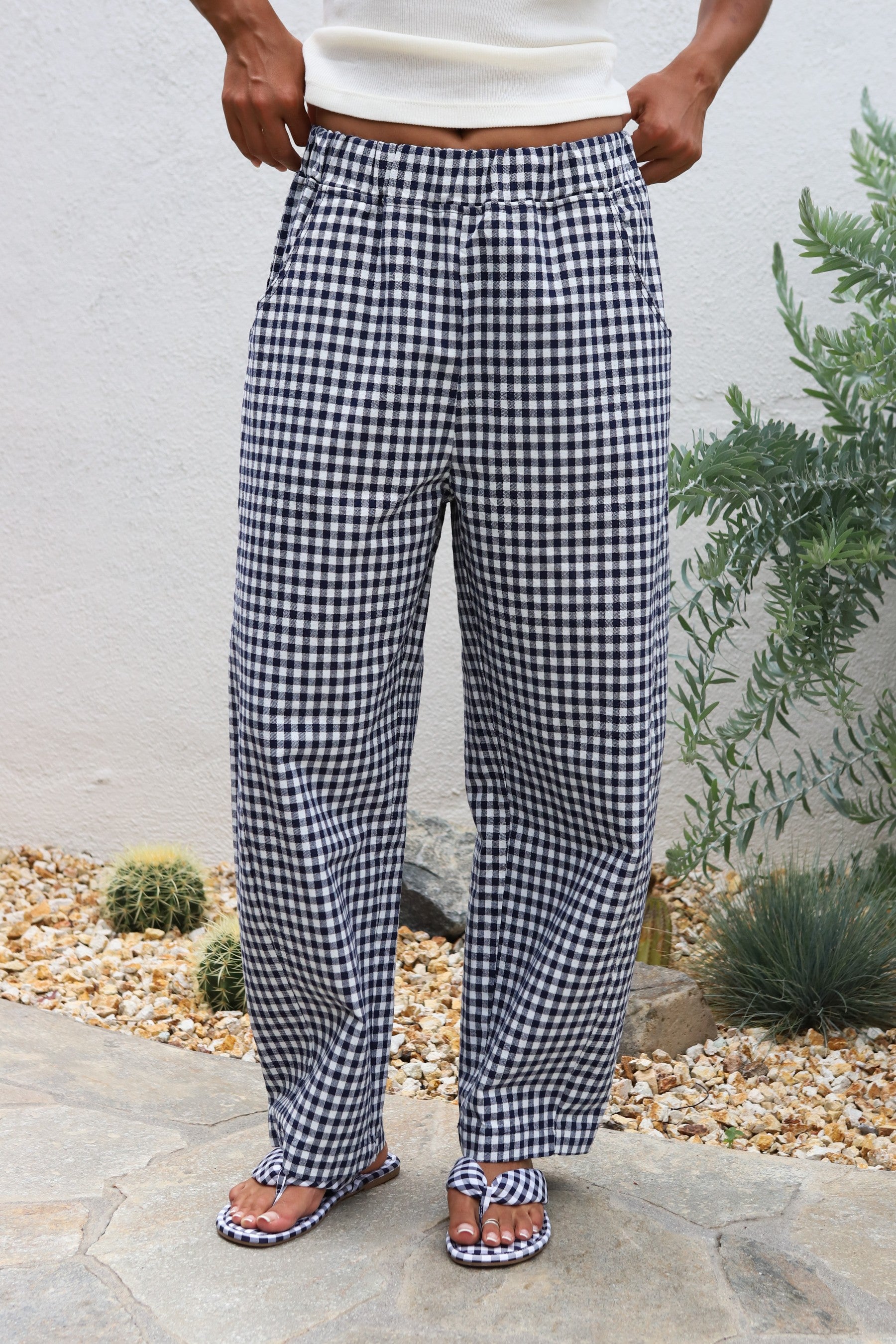 A timeless design featuring an elastic waist tops a slightly curved leg with a unique arced side seam and panels, along with side pockets.