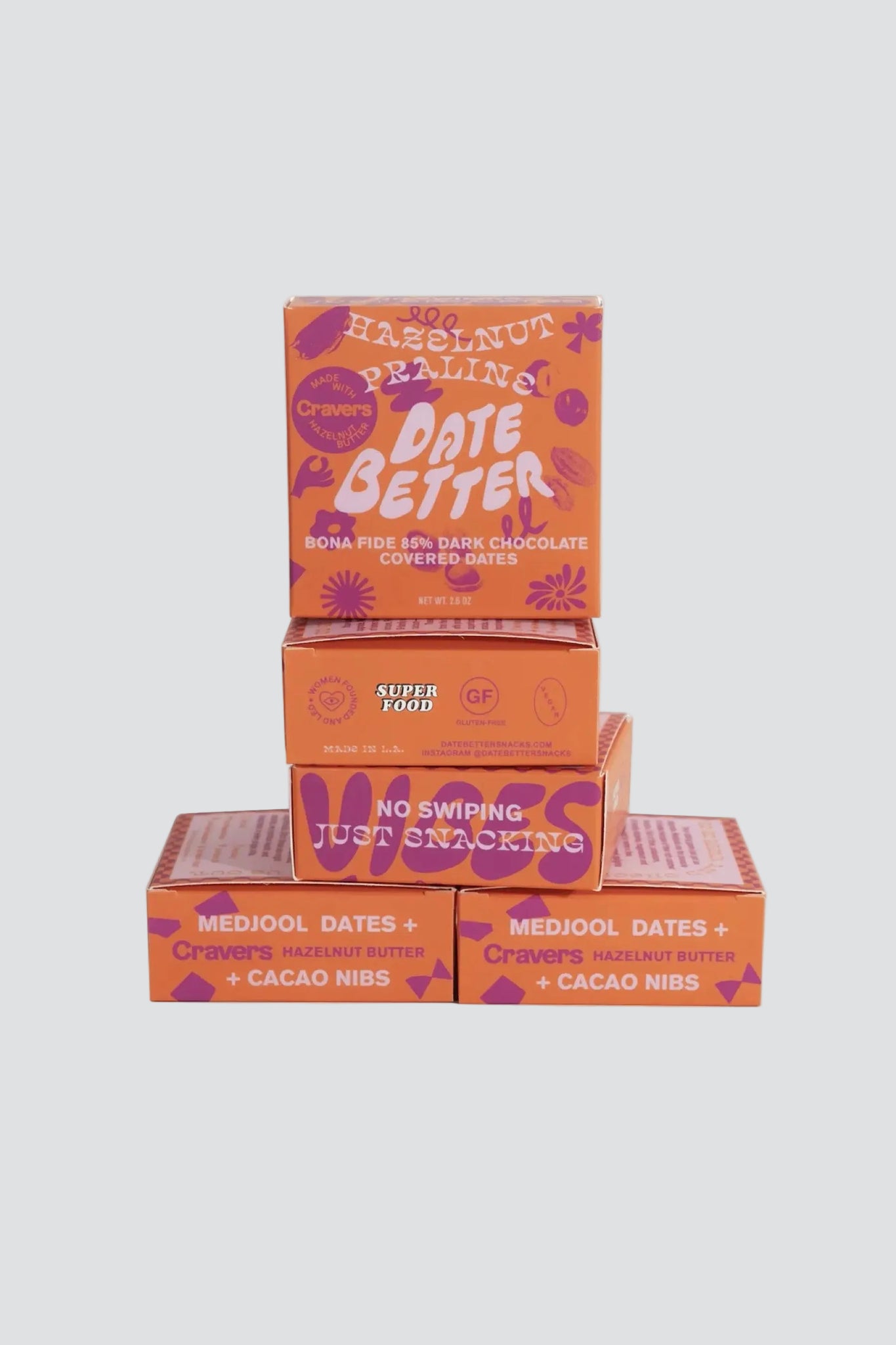 Date Better has teamed up with Cravers to create a limited-edition flavor. Chewy Medjool dates are stuffed with Cravers creamy hazelnut filling speckled with crunchy cacao nibs. These dates are enrobed in organic, fair trade 85% dark chocolate that is free from any soy or emulsifiers. Contains two chocolate covered dates.