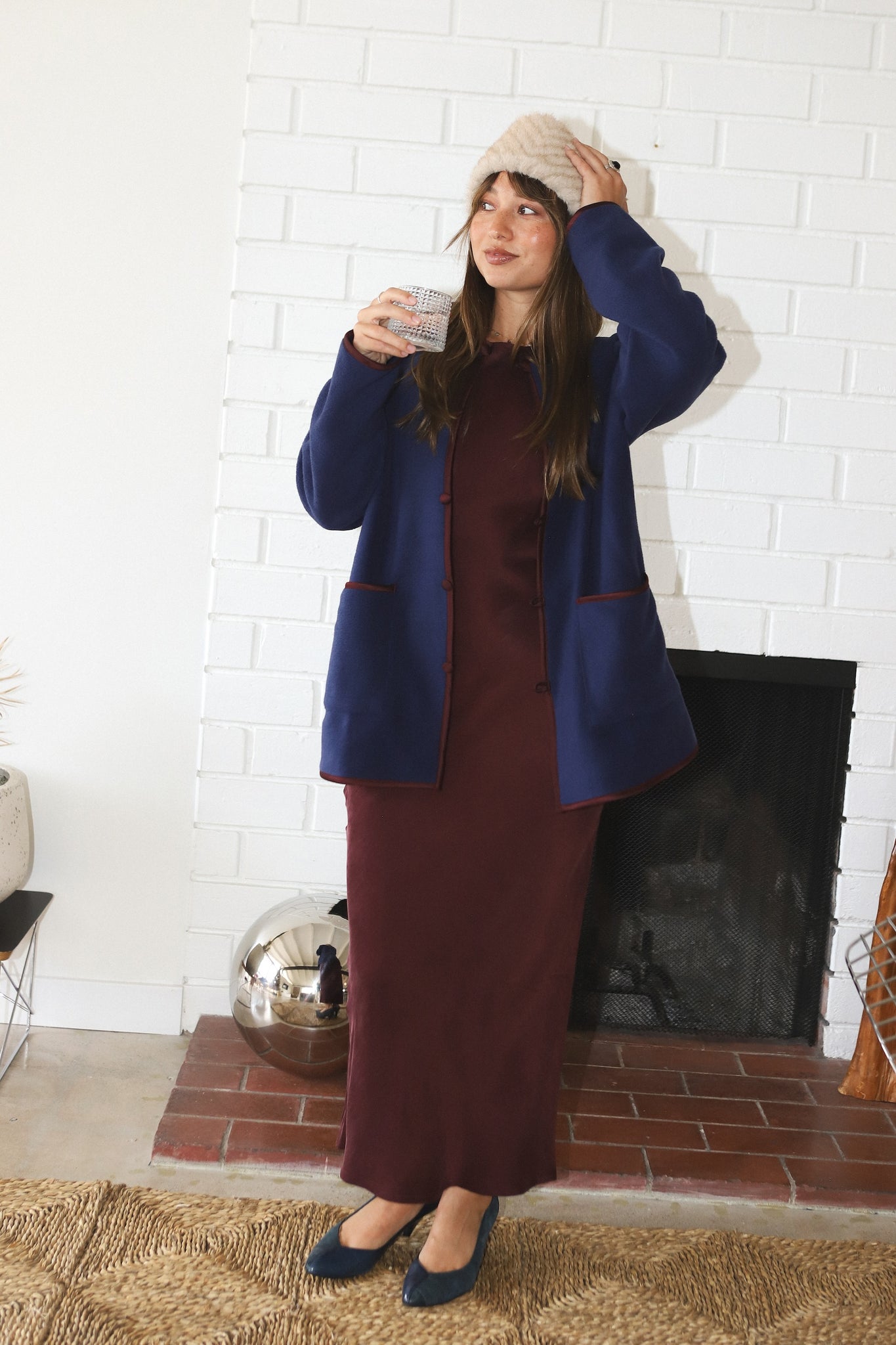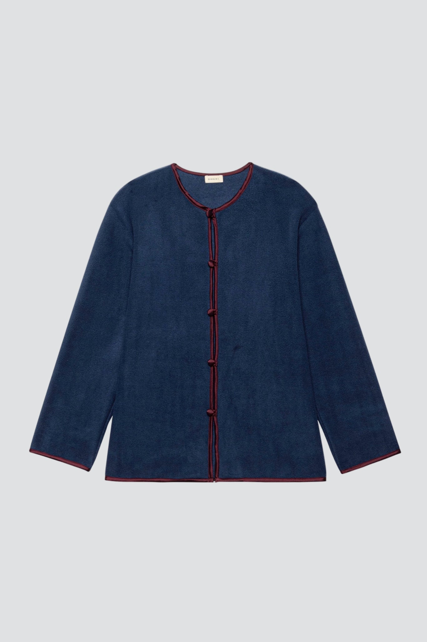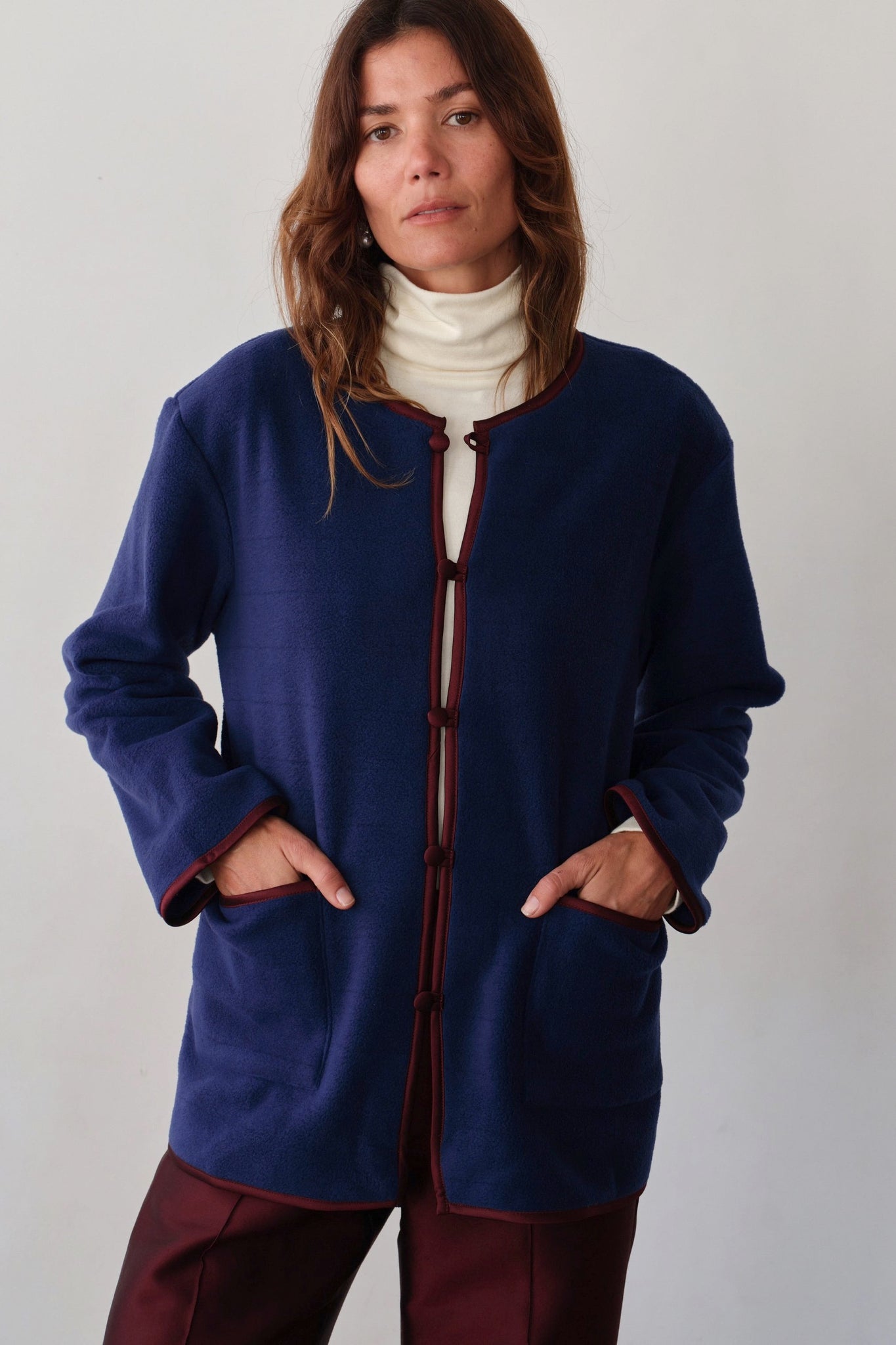 Experience warmth and style with the Navy Polar Fleece Jacket, crafted from cozy fleece for ultimate comfort. Its rich navy color is elevated by contrasting burgundy trim and buttons, perfect for chilly days ahead.