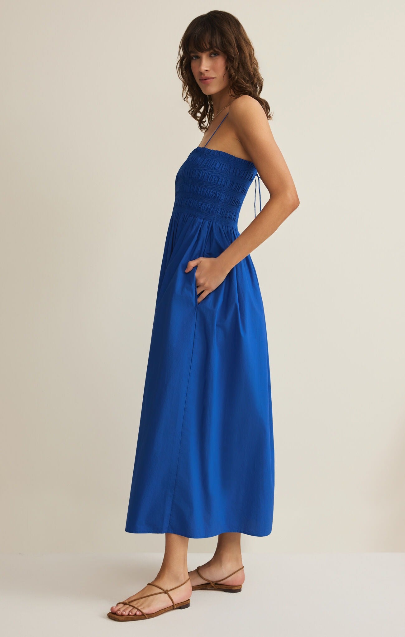Made from lightweight poplin cotton, this midi dress features a fully smocked bodice that fits close to the body before flowing into a relaxed skirt. The square neckline and side pockets make it as practical as it is pretty.