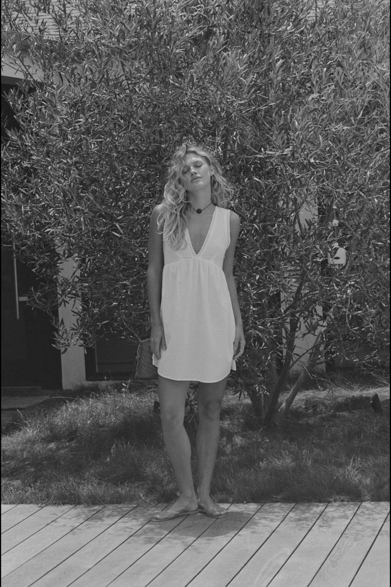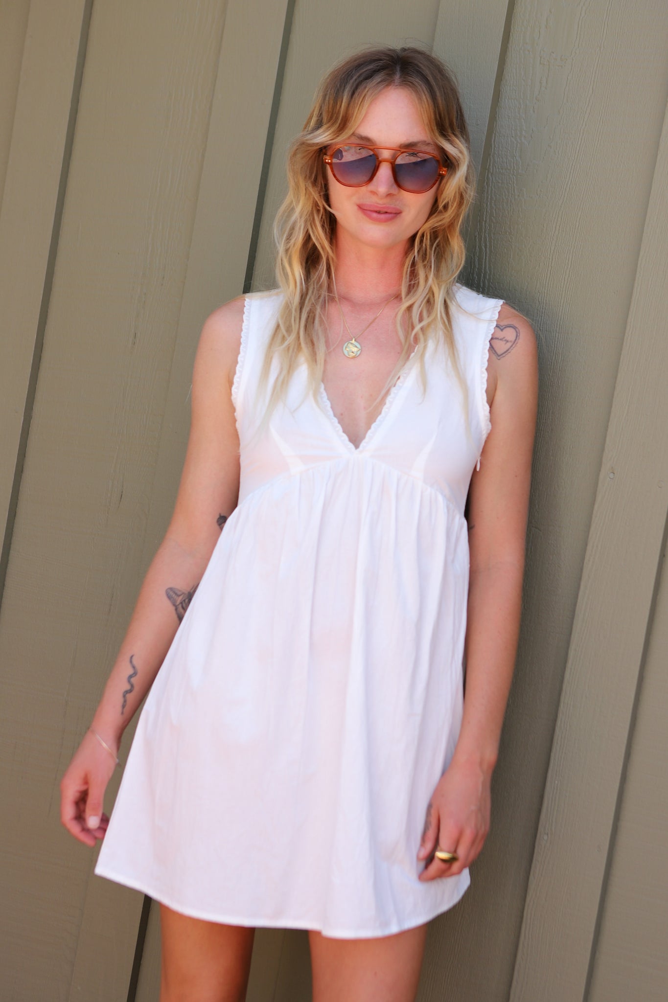 A vintage-inspired mini dress with delicate lace trims, a flattering V-neckline, and a gathered skirt. Featuring an invisible back zipper for a seamless fit.