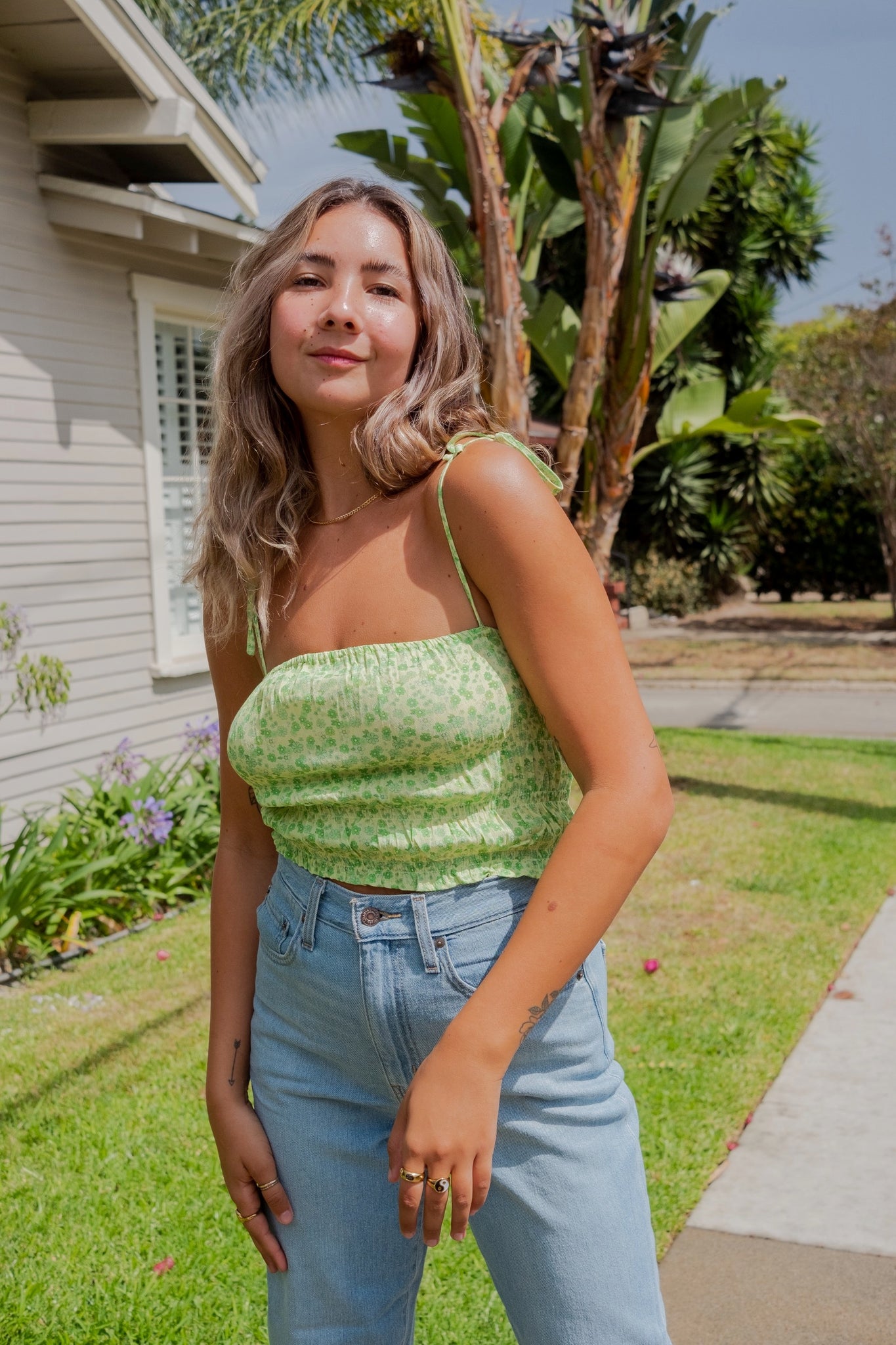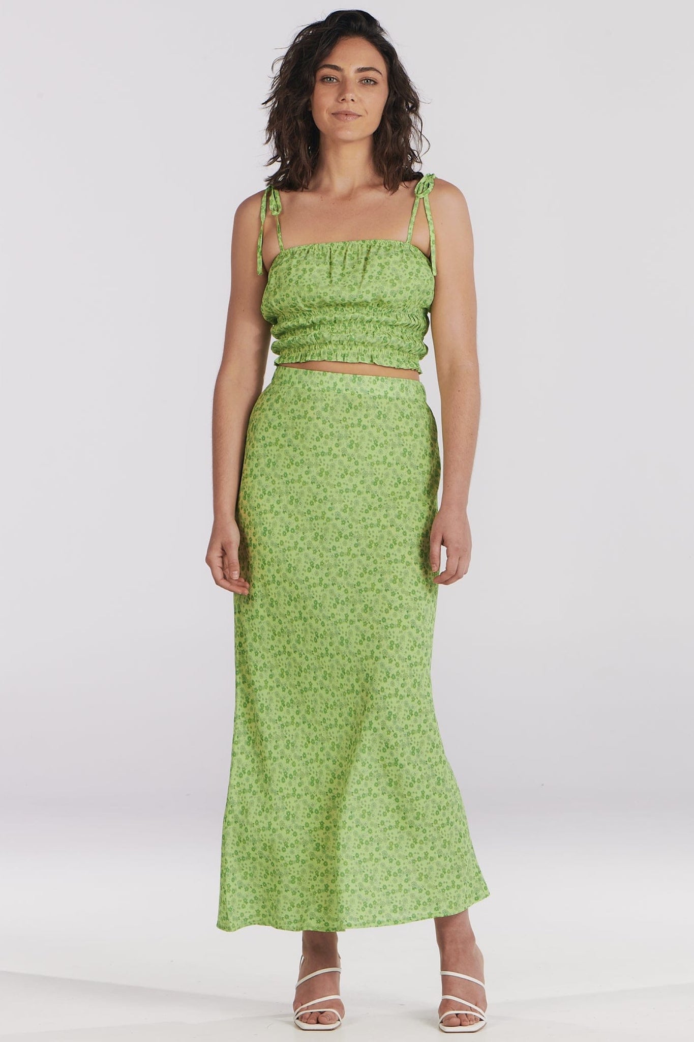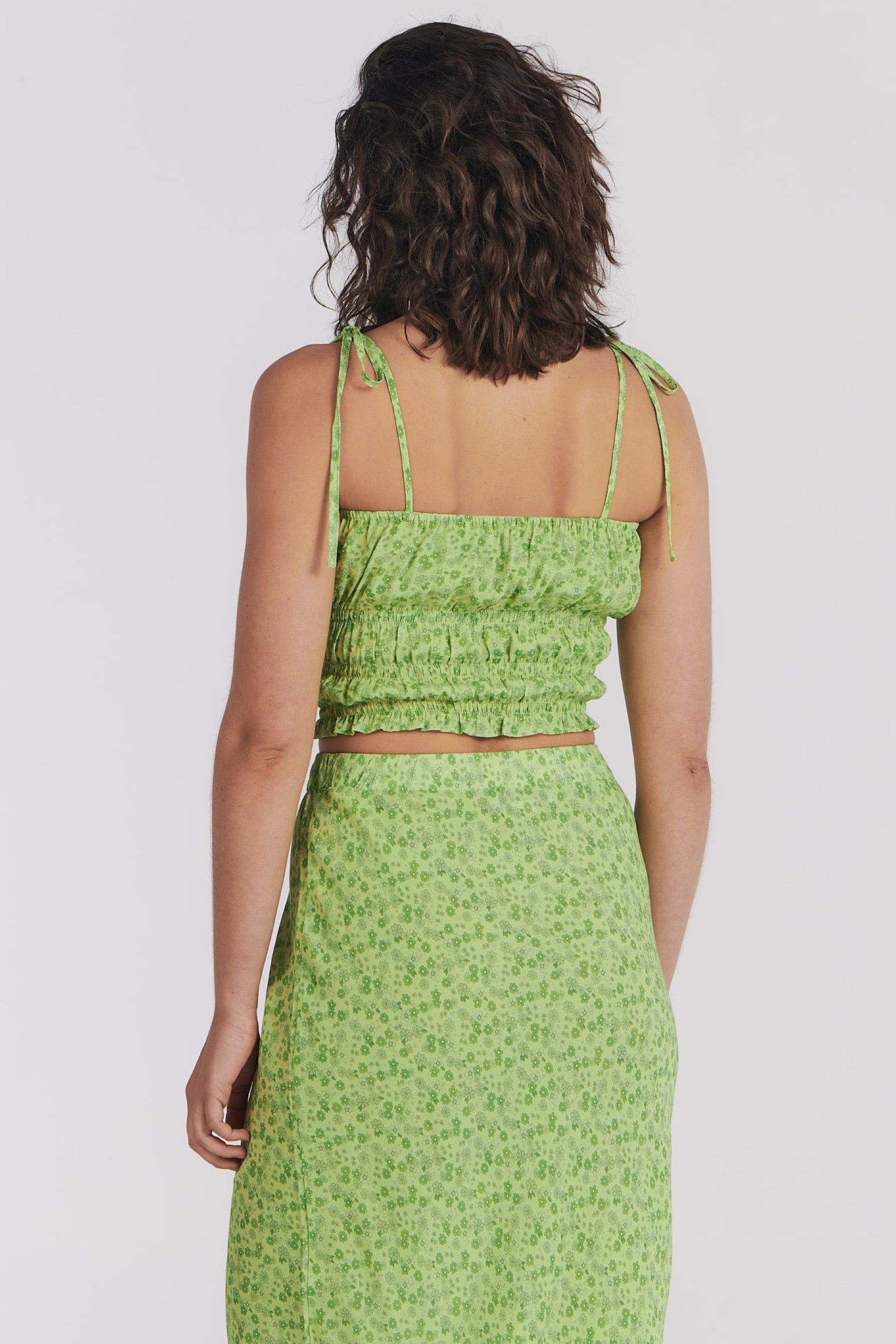 A tonal ditsy floral print gives this sweetly shirred crop a fresh new-season feel. Amazing with the Stella maxi skirt and tan heels for day or night.