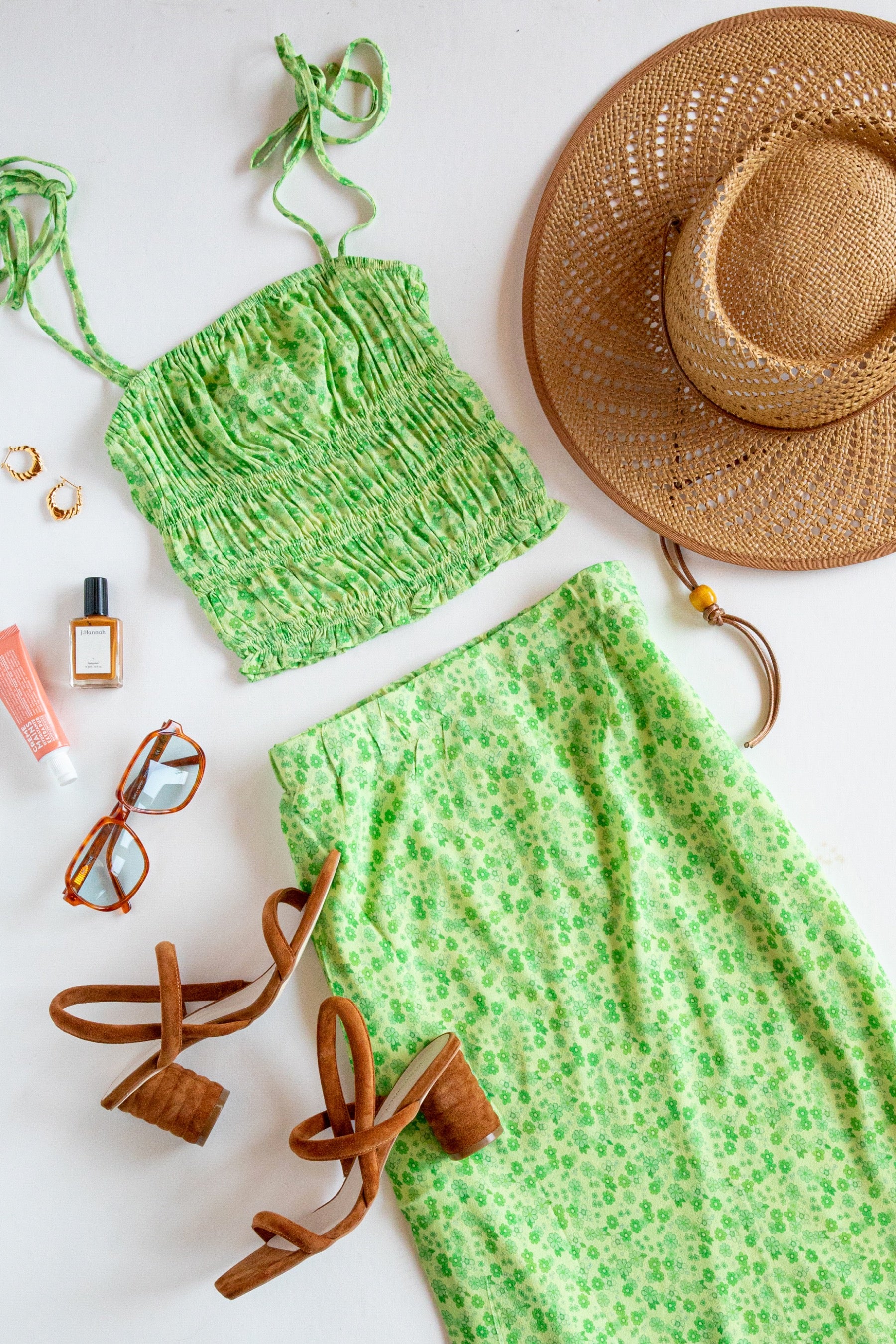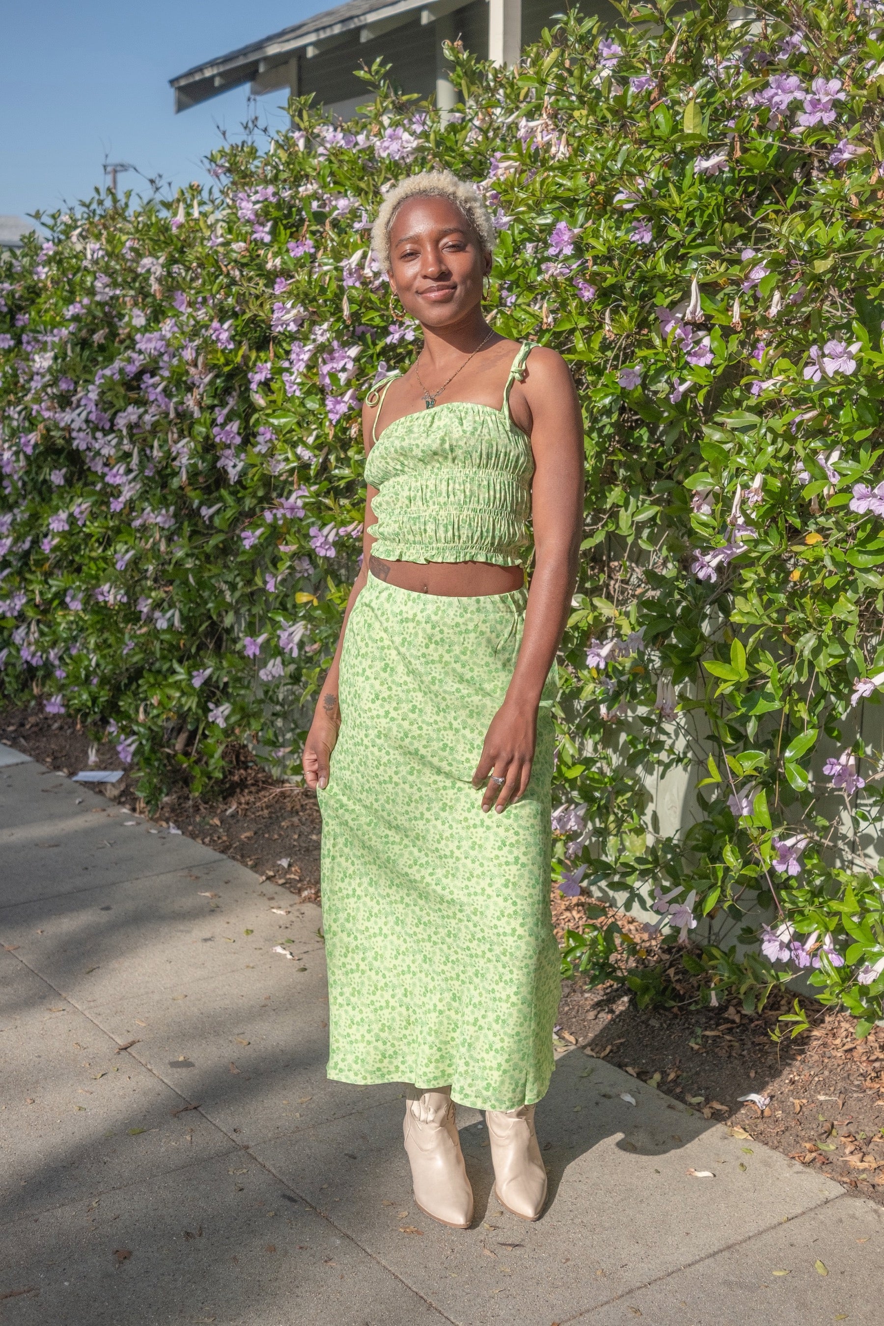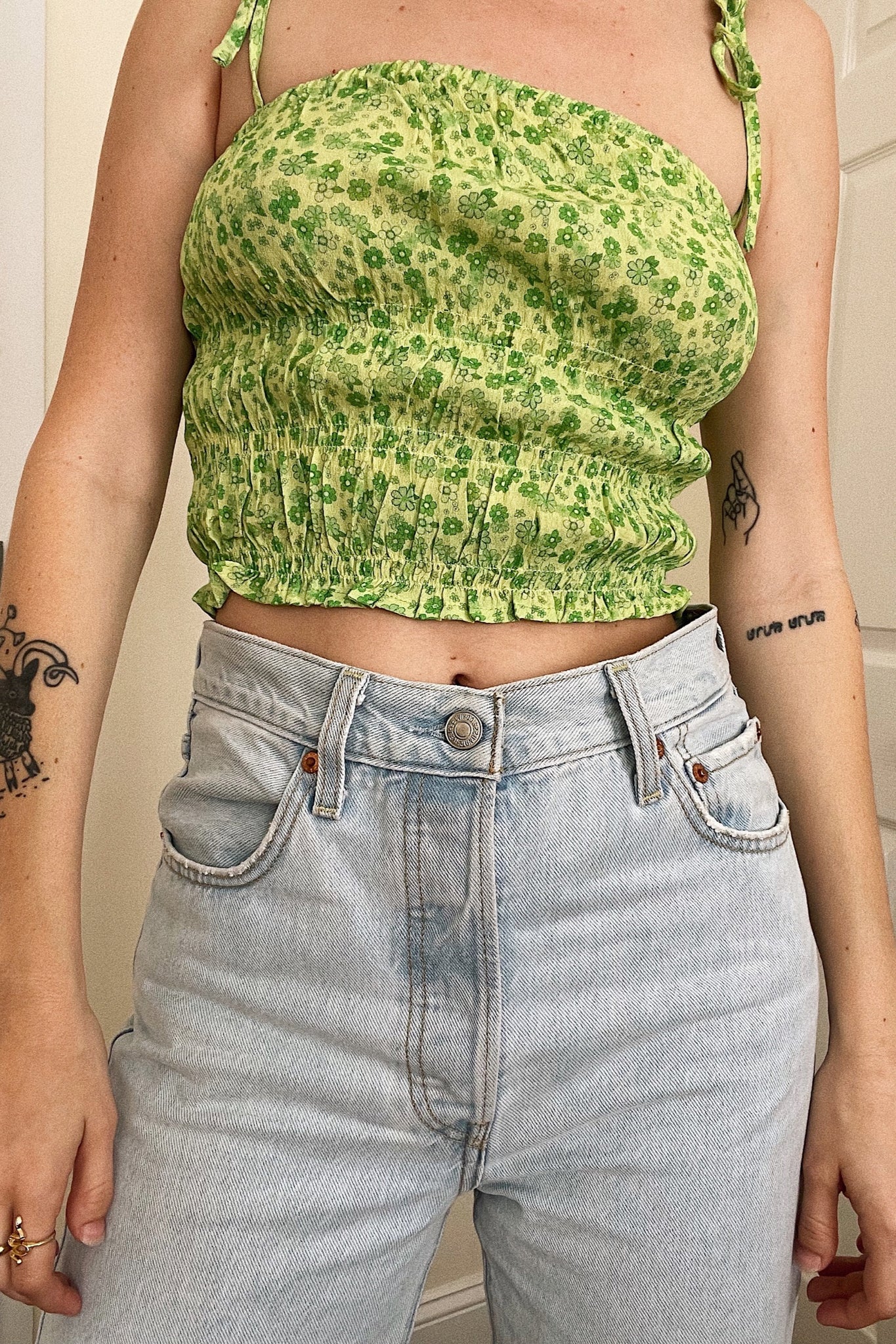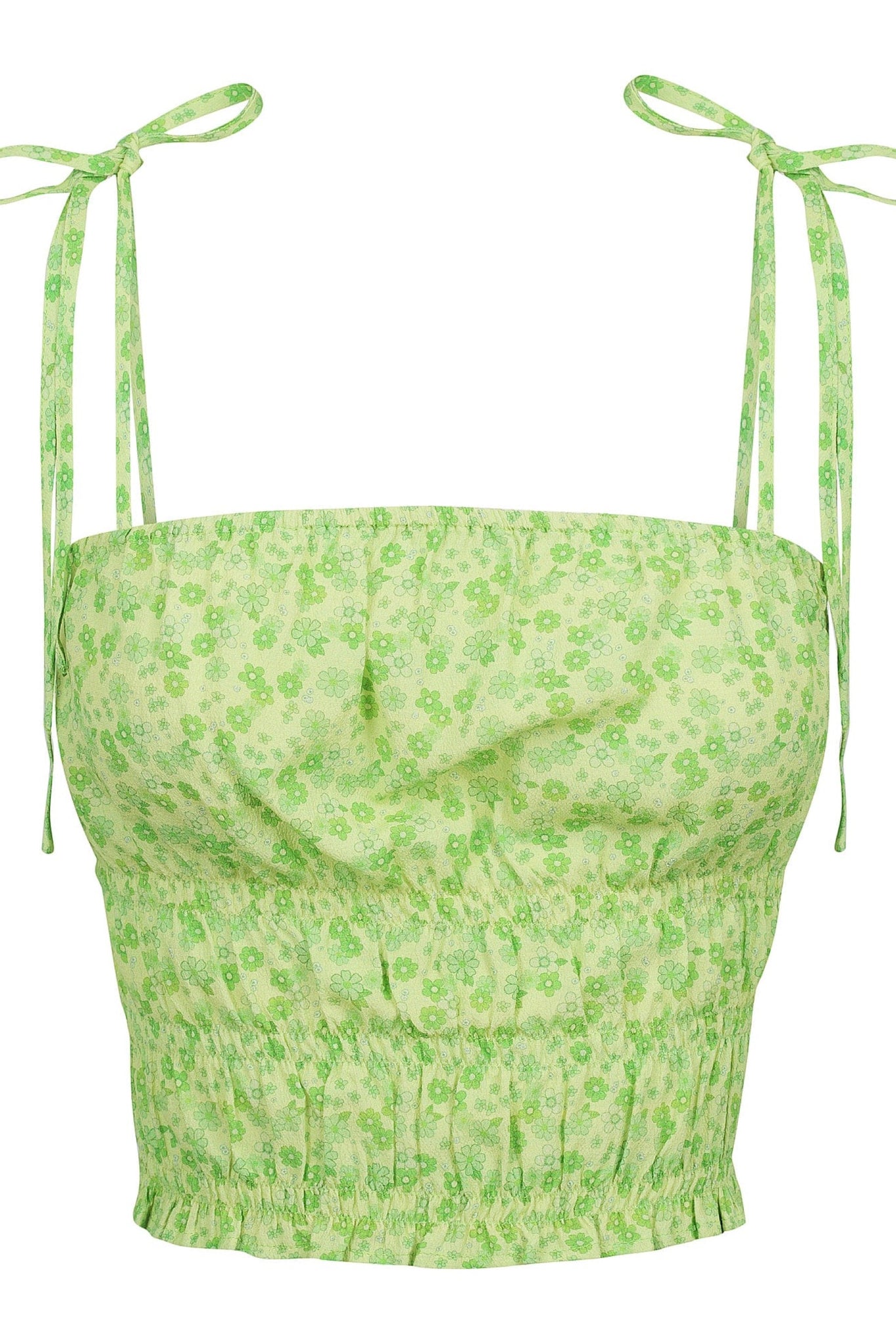 A tonal ditsy floral print gives this sweetly shirred crop a fresh new-season feel. Amazing with the Stella maxi skirt and tan heels for day or night.