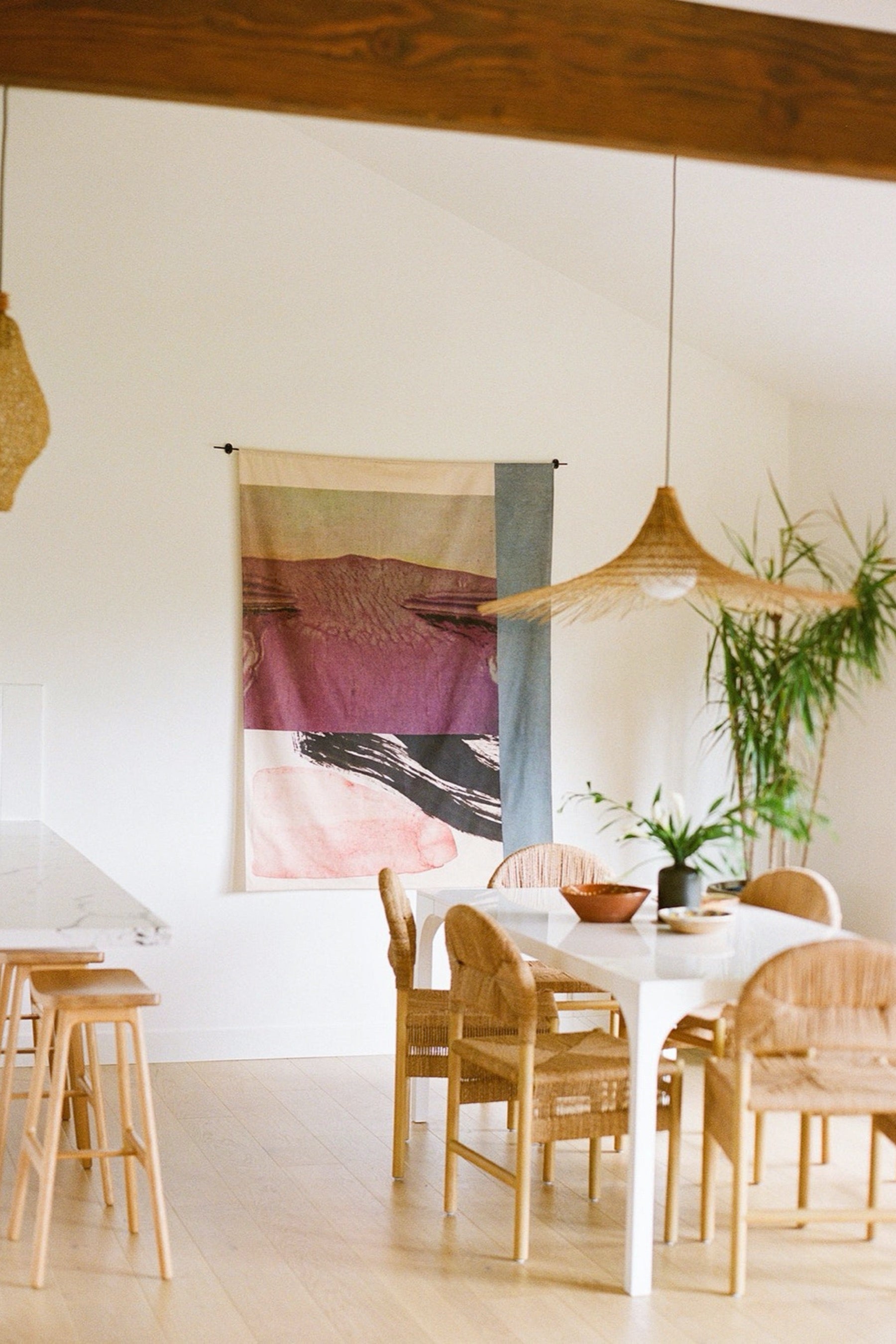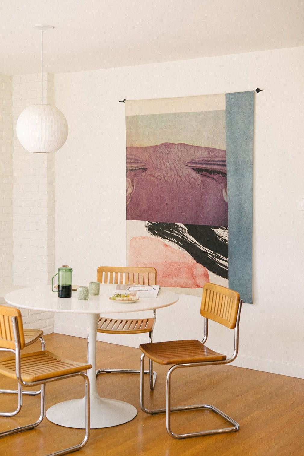 The Lomond is an original print on 100% organic cotton satin. Each print comes with a metal hanging rod and wall mounts included, which attach easily to the wall and are custom designed to allow the print to drape beautifully. Handmade in the USA.