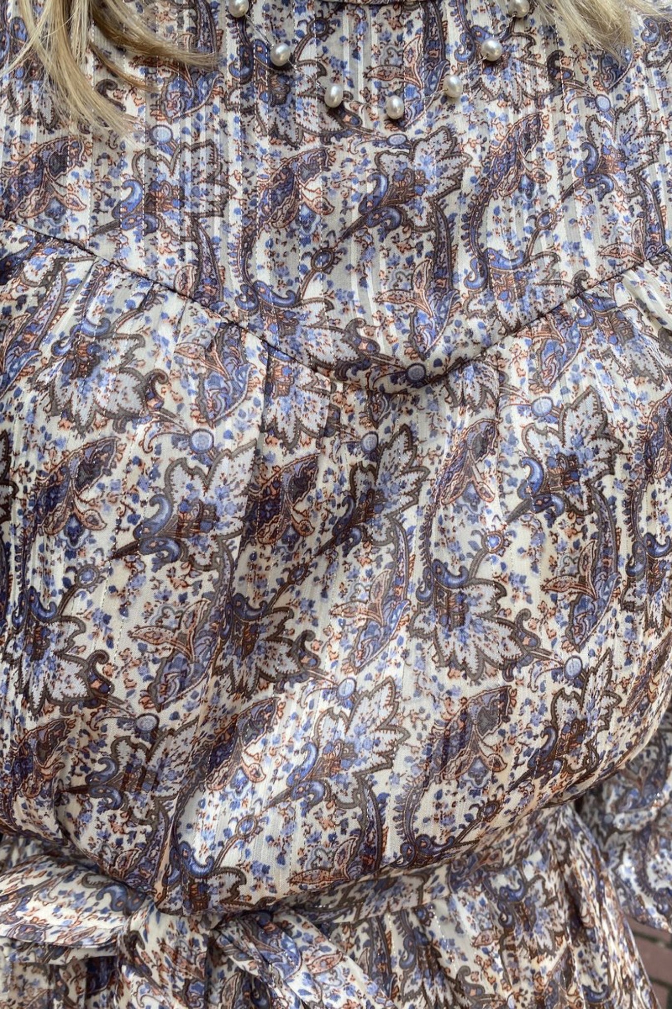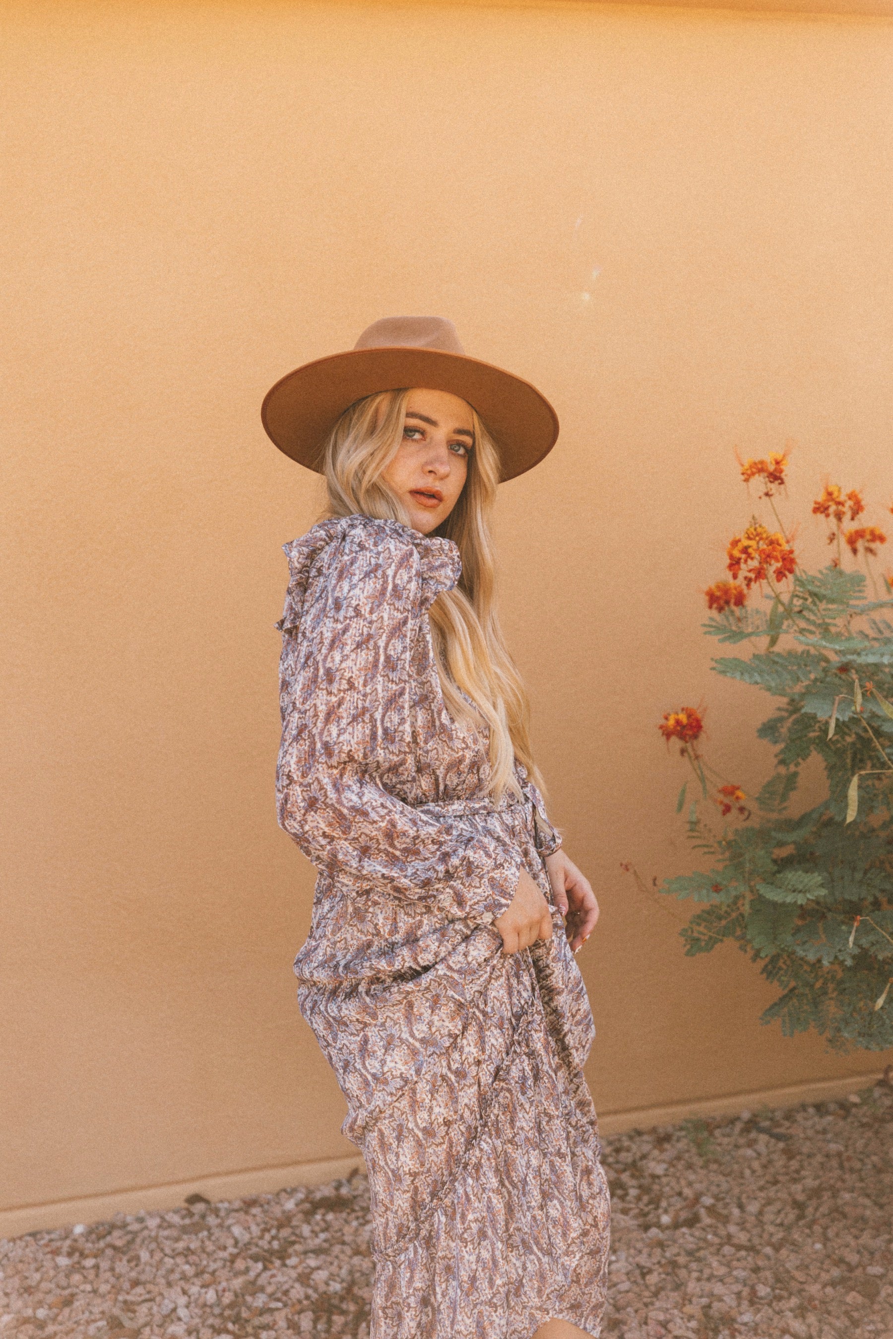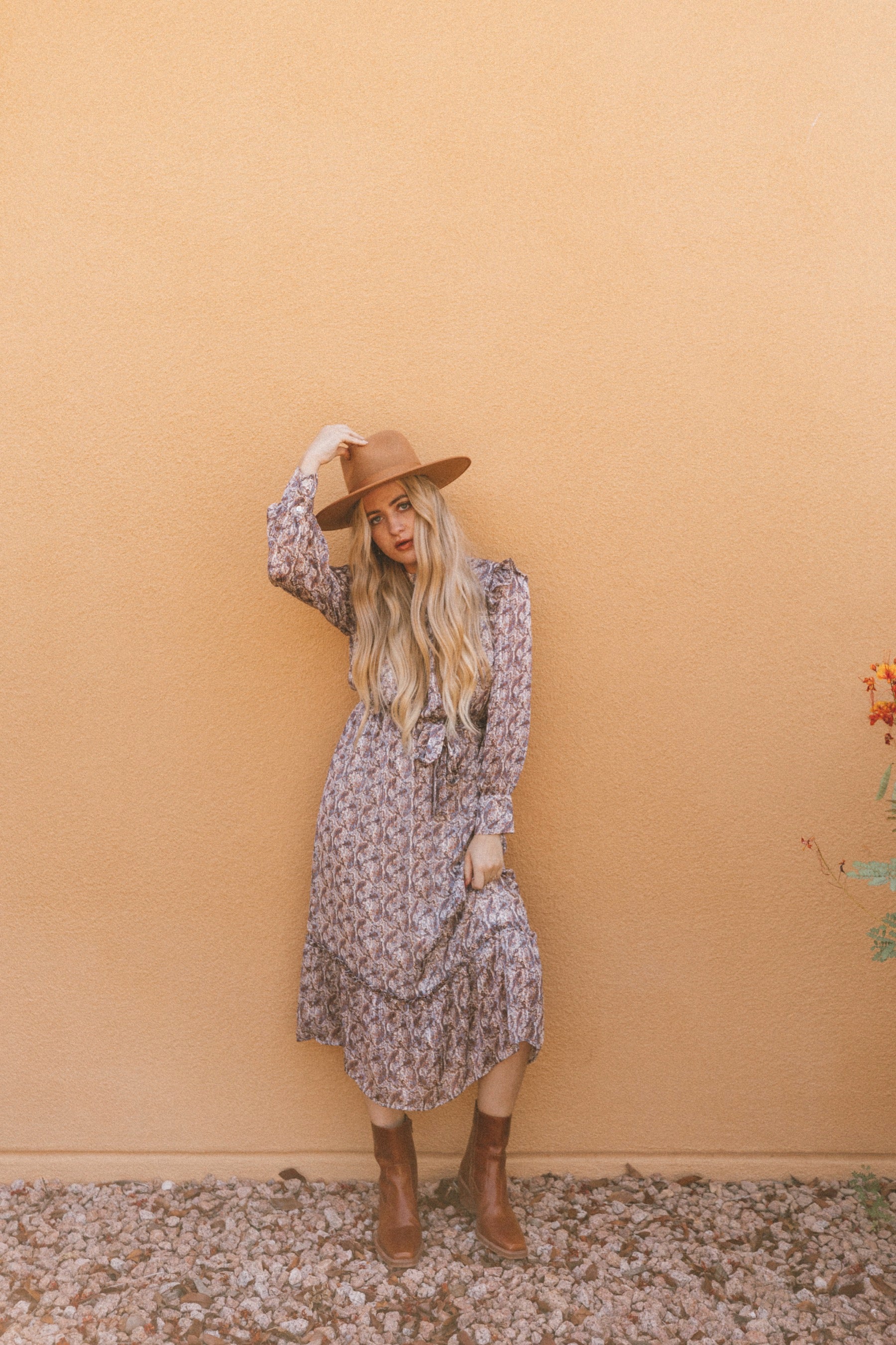 This dress is the perfect transition into fall. Lightweight with an adjustable self tie belt. Featuring semi sheer sleeves and elastic waist.