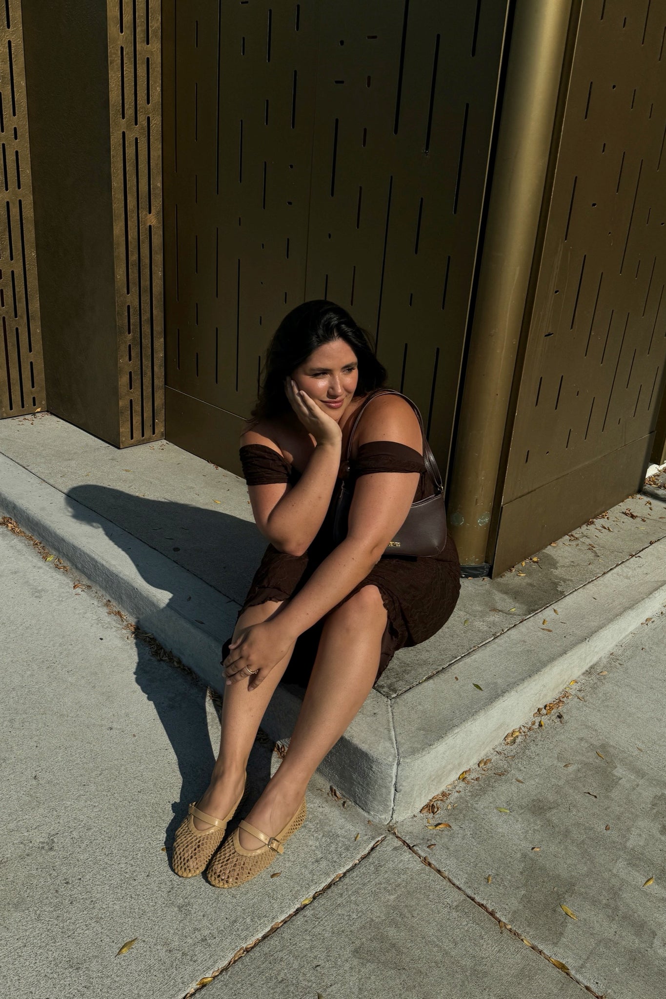Mary jane flats featuring a crochet knit upper with vegan leather straps and trim.