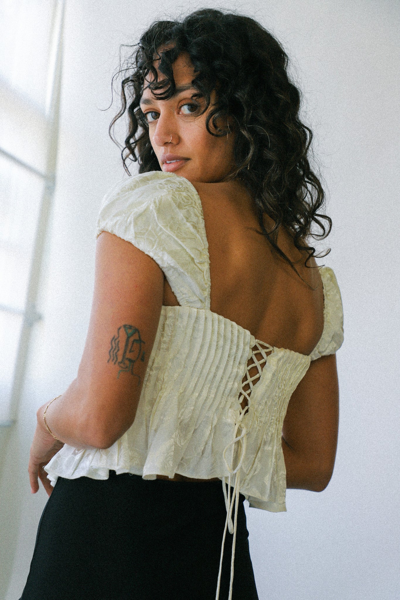 Pairs best with wine and a valentine. Rose jacquard top with short puff sleeve, lace trim along cups, pin-tucked waistline that releases into gathering at bottom edge.