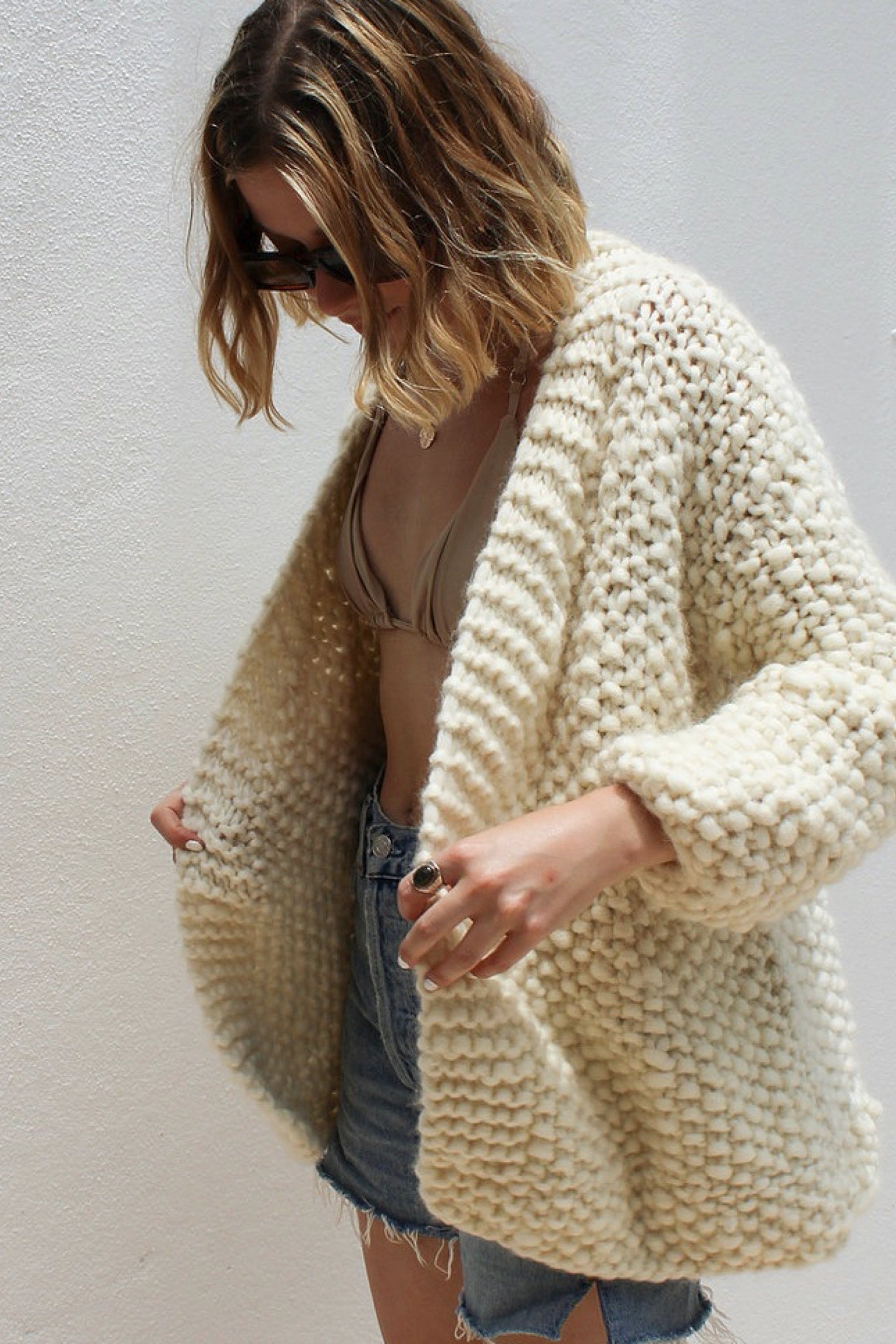 An open front cardigan with a timeless Merino weave. Hand Knitted in Villarica, Chile by Dorama a third-generation knitter who has a deep passion for creating. The sweaters are entirely pure merino wool and have no dyes in them. The white creamed color is the natural shade.