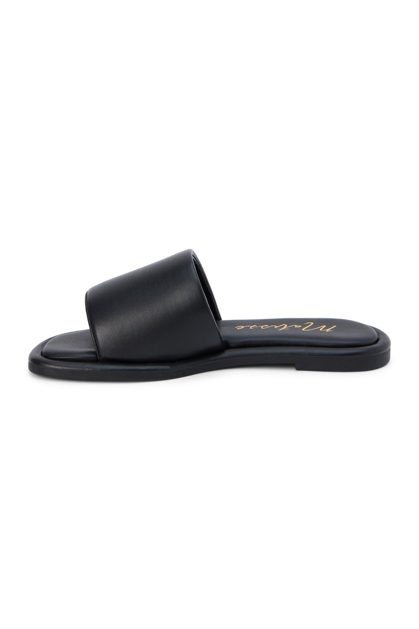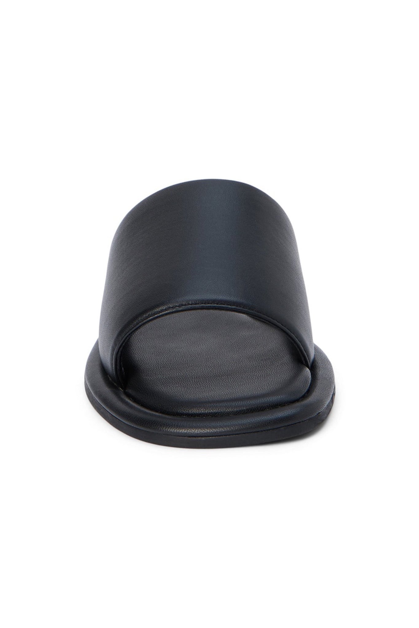 Featuring a sleek flat sole and a striking puffy one-band leather upper, this sandal blends edgy style with effortless comfort.