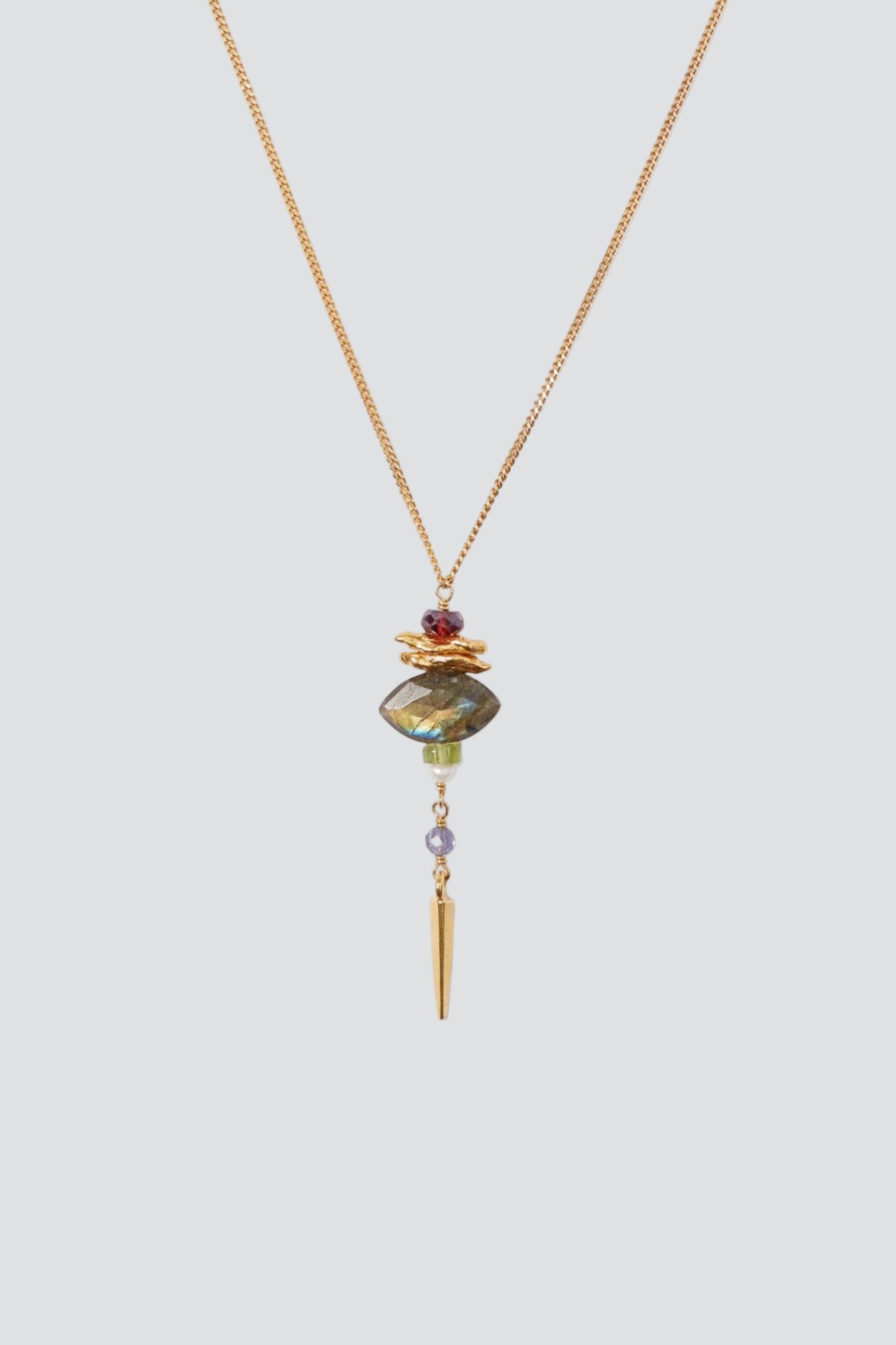 Strike a balance with this necklace featuring a stack of vibrant gemstones, freshwater pearl, gold chips and a marquise cut labradorite stone ending in a dagger point.