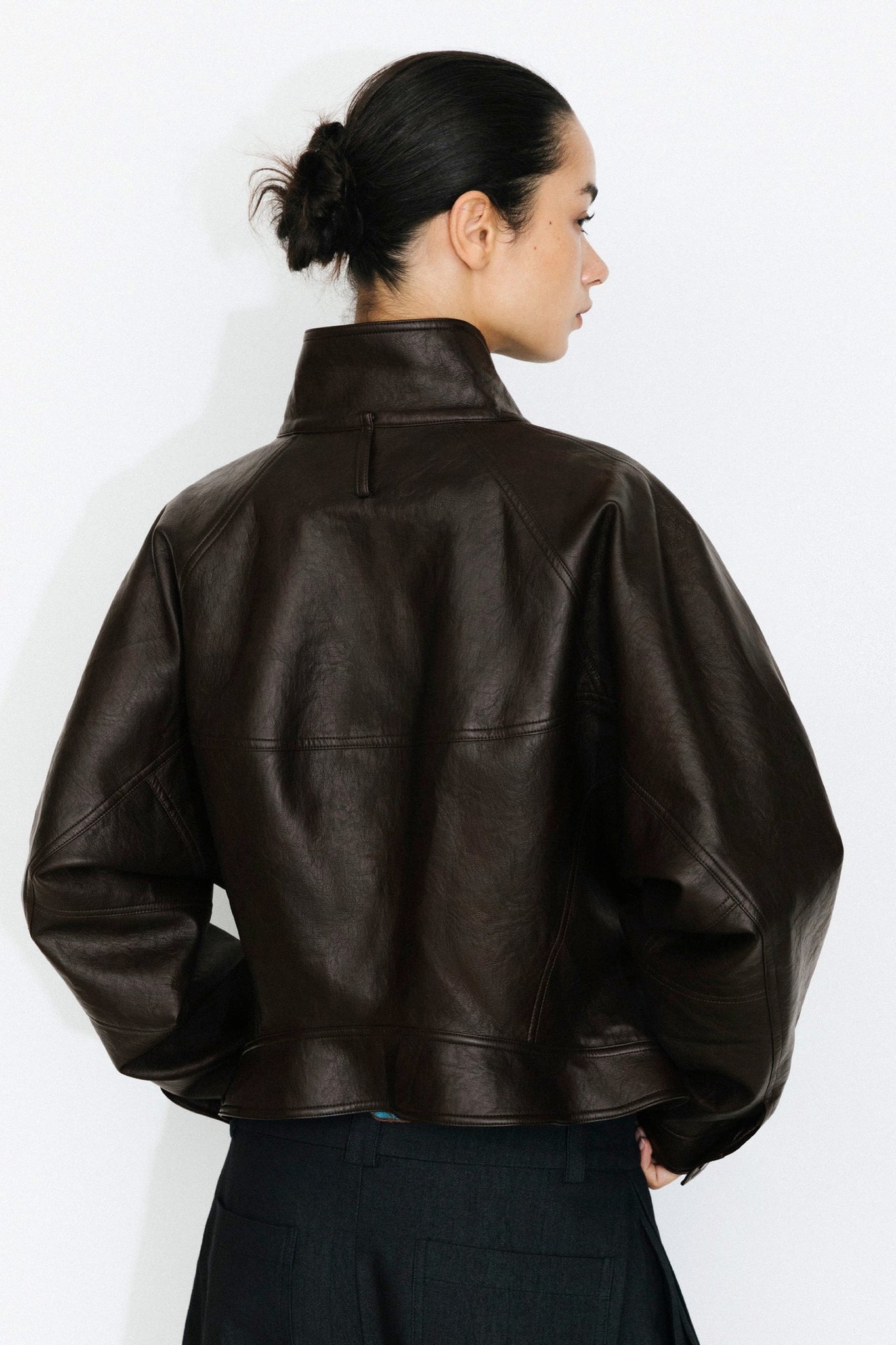 Curved sleeve faux leather jacket in brown. Crafted from supple faux leather, this jacket features a stand collar and voluminous batwing sleeves with a curved silhouette. The cinched waist and sculpted hem create a flattering shape, while the three-dimensional cut ensures a bold, structured look.