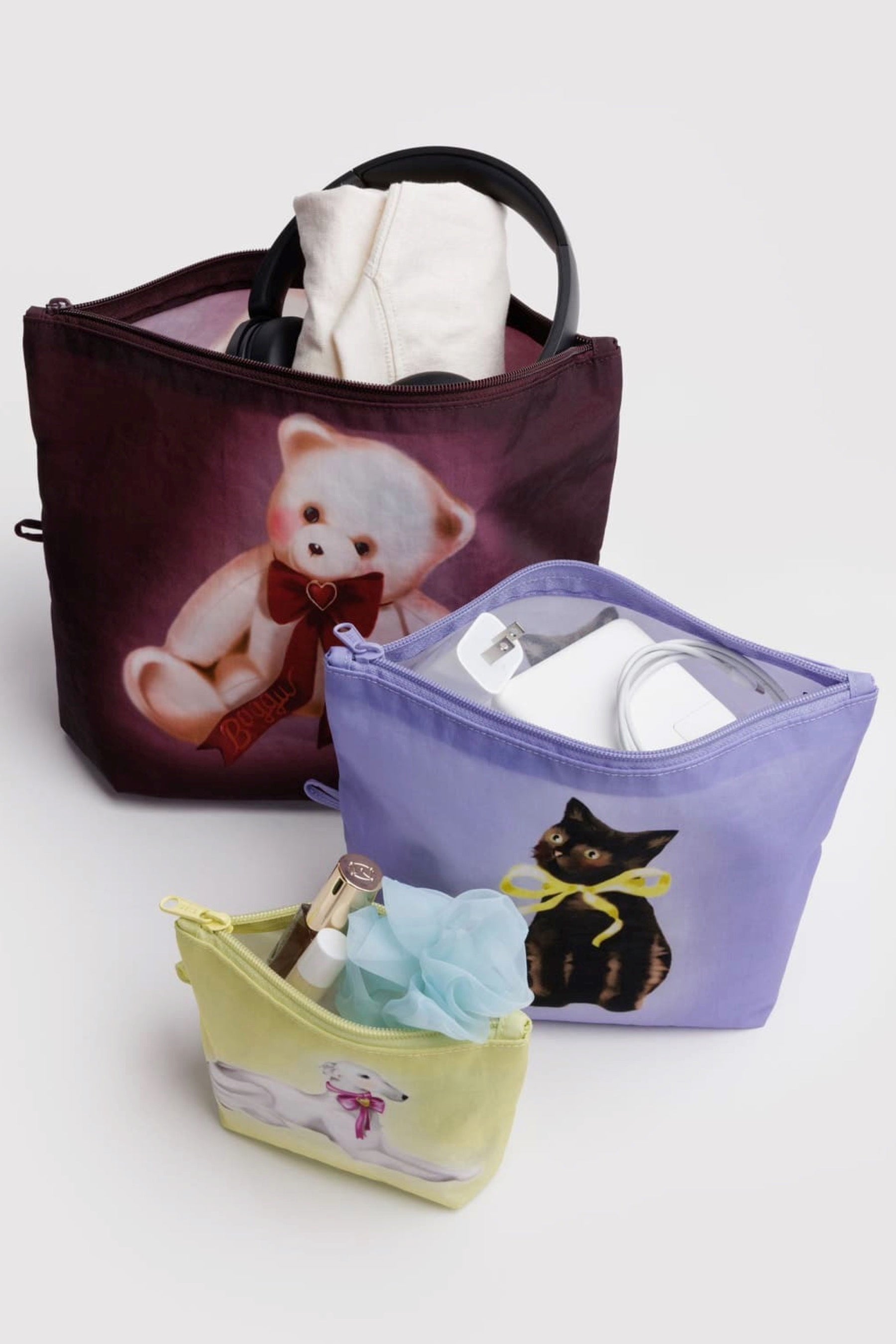 A set of three all purpose zip pouches for organization and travel. Gusseted pouches lay flat or expand to hold your daily essentials. Medium pouch holds a Kindle or an iPad mini. Large pouch holds an iPad or a 12 inch MacBook.