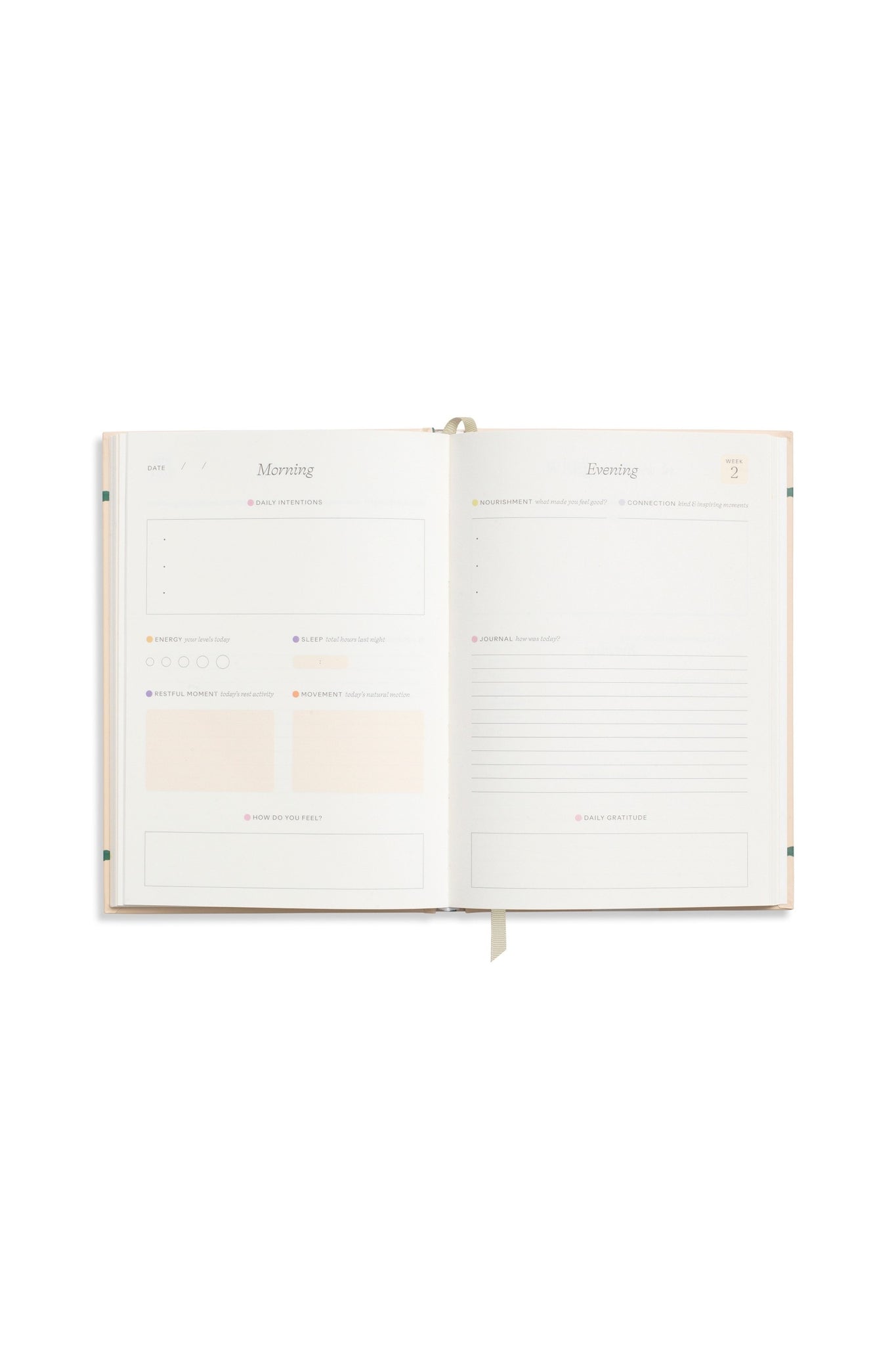 - 12 weeks worth of daily overview pages (two-page spread for each day), with space for logging intentions, sleep and energy levels in the morning and evening