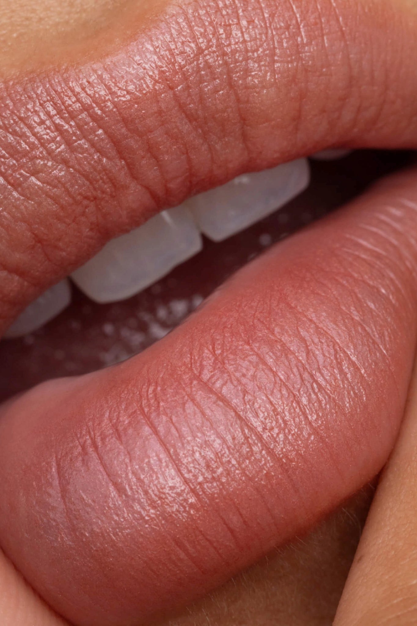 A dark peach colored lip tint. This sheer tinted lip balm features buildable color, so you can be as bold or as subtle as you wish.