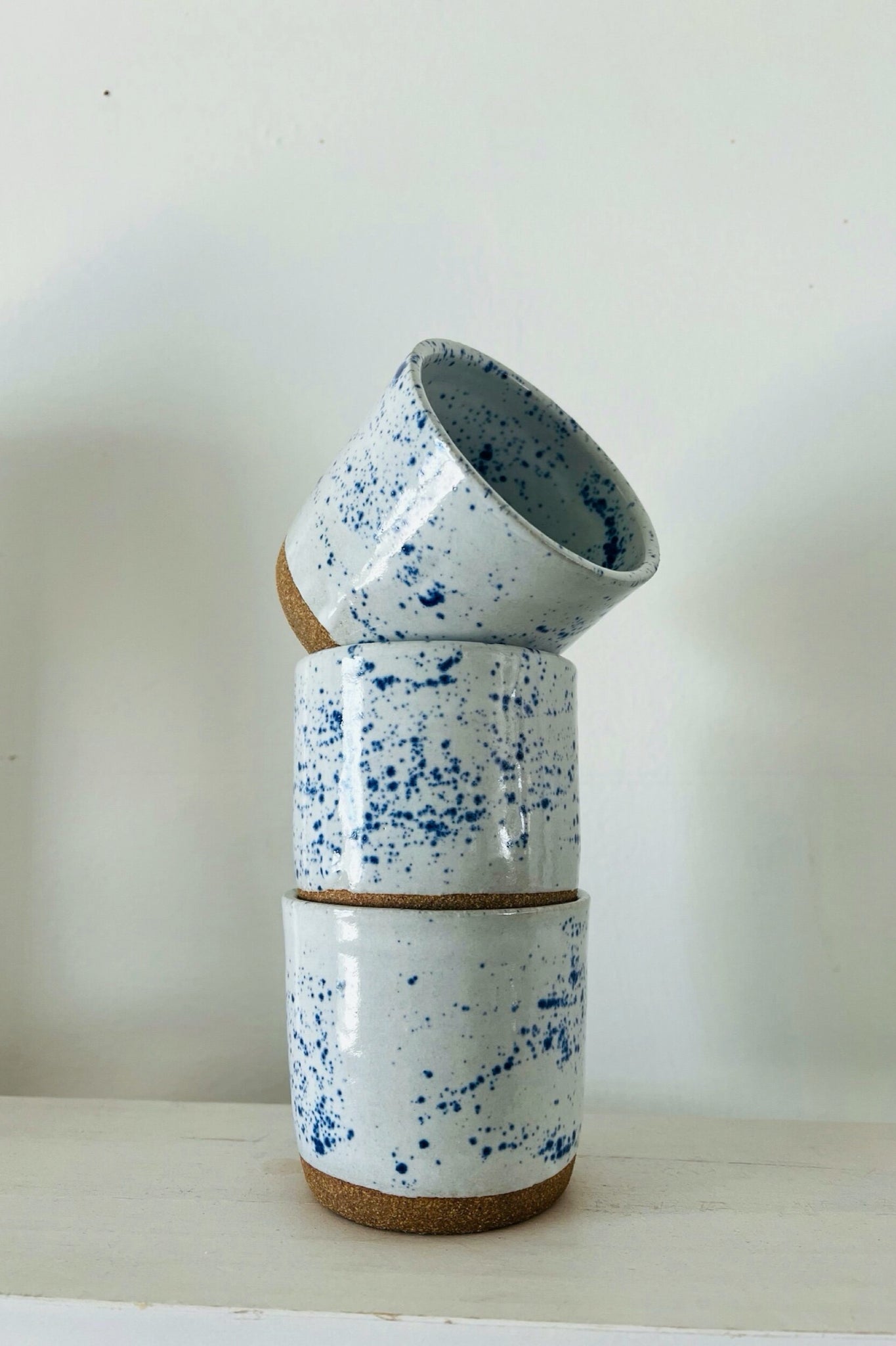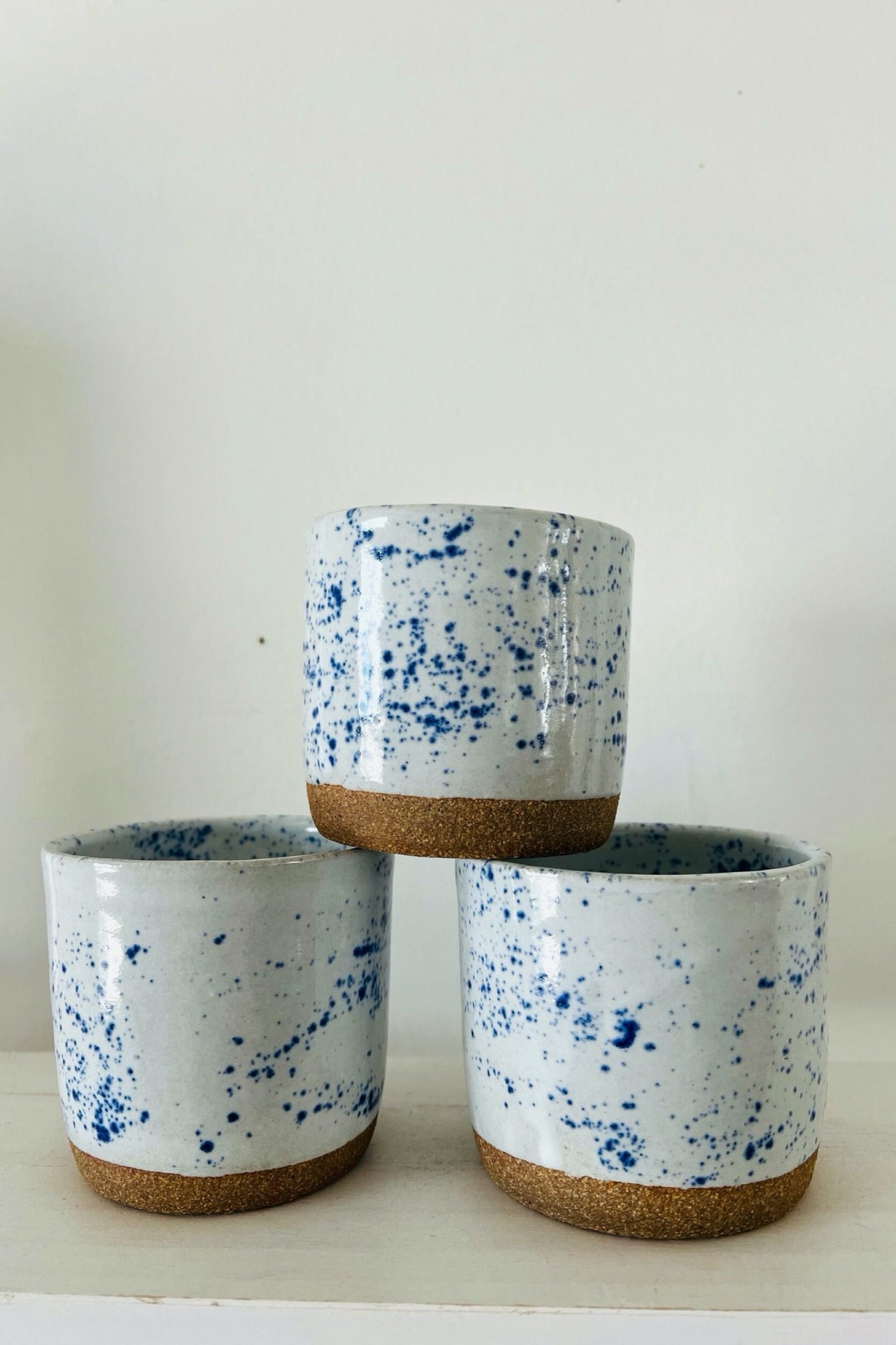 Handmade stoneware tumblers, glazed white with blue speckles. Made in Long Beach, CA. Sold individually, not as a set.
