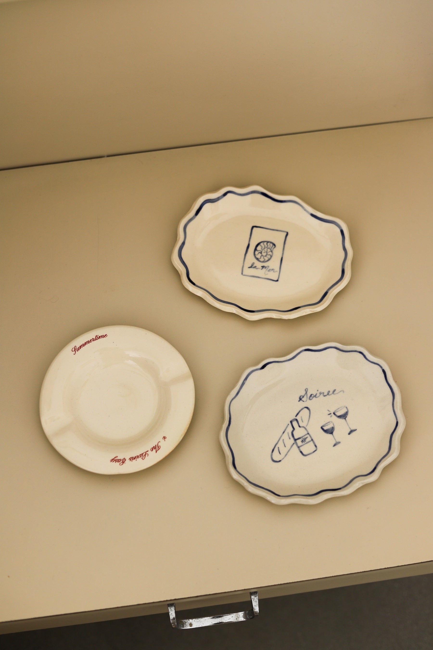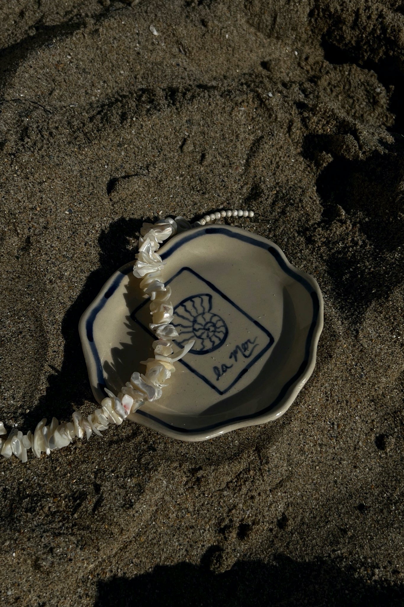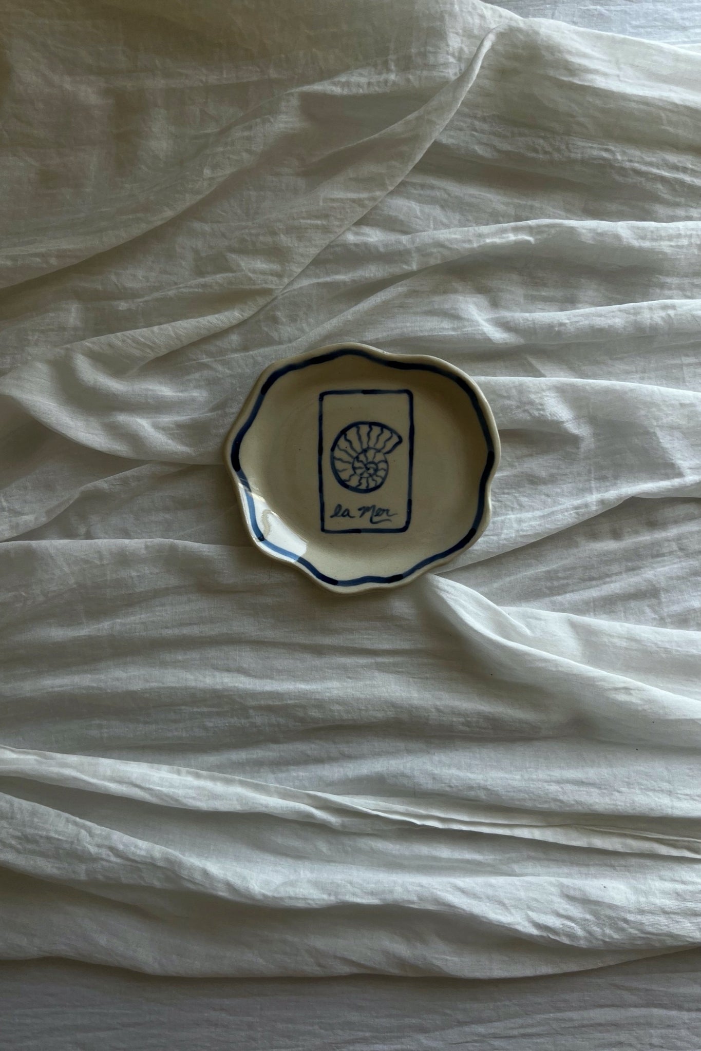 Introducing these limited edition hand-painted Florence plates. This design features freehanded seashells and the elegant inscription 'La Mer' in a signature deep blue. Crafted from stoneware with organic curves and edges, every piece is hand-sculpted, ensuring it is entirely one-of-a-kind.