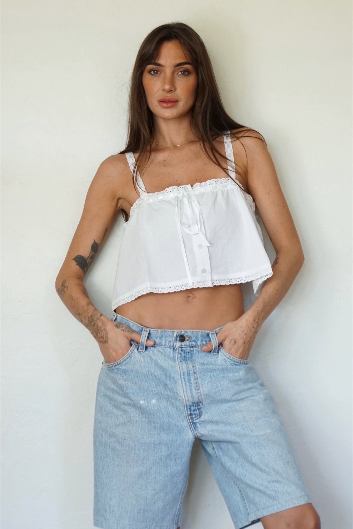 The vintage-inspired White Jardim Tank features a delicate button-up front crafted from soft cotton. Elegant lace accents and a satin tie detail add a refined touch, making it a sophisticated choice for layering or wearing on its own.