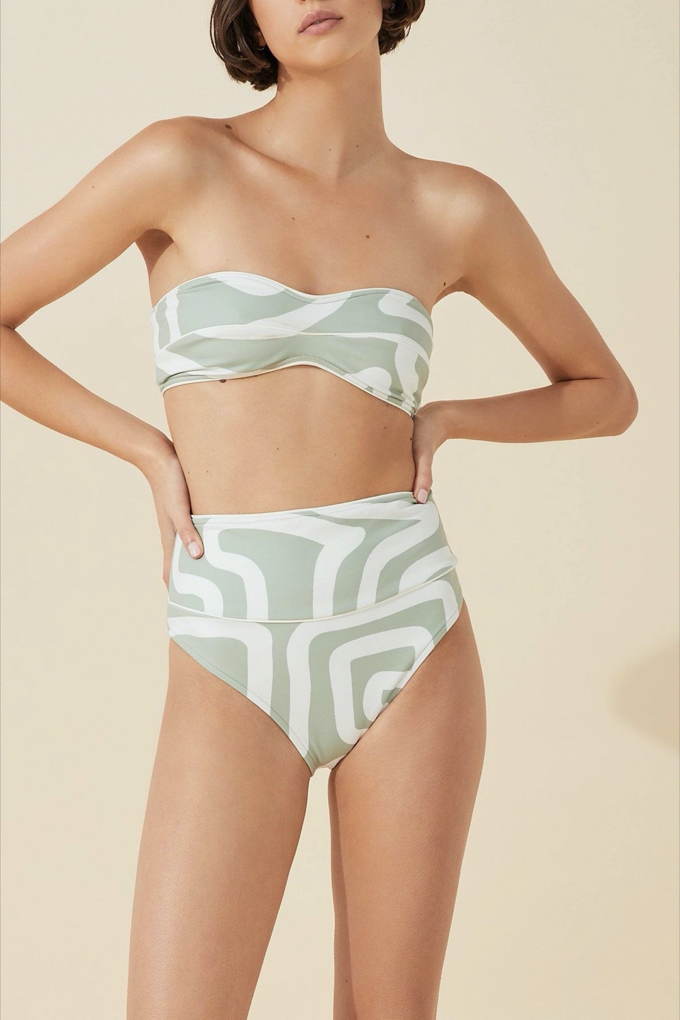 The Moss Stroke Waisted Brief is made from a softly brushed REPREVE® recycled polyester in a custom print design. Featuring a deep waistband with flattering curve panelling and piping detail. Modest coverage.