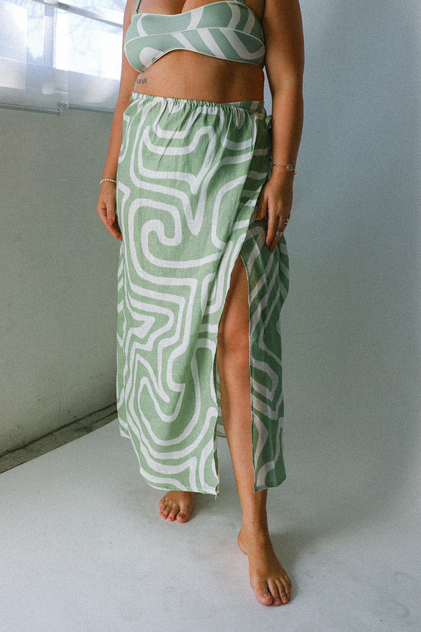 The Moss Stroke Wrap Skirtis crafted from 100% European Flax® Linen, grown without the use of fertilizers or pesticides in a custom print design. A simple wrap style with gathered detailing and tie. Style over the coordinating swim.