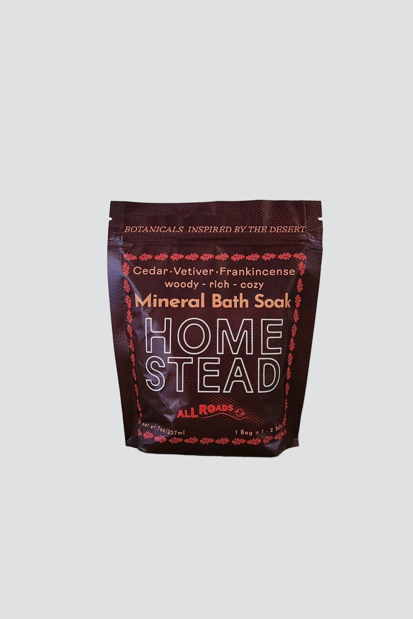 Inspired by the many abandoned wooden homestead shacks sprinkled across the Mojave Desert, our Homestead bath salts are scented with cedar, vetiver and frankincense. A woodsy scent with essential oils that are believed to have anti-inflammatory properties. One bag of soak is enough for 1-2 baths.