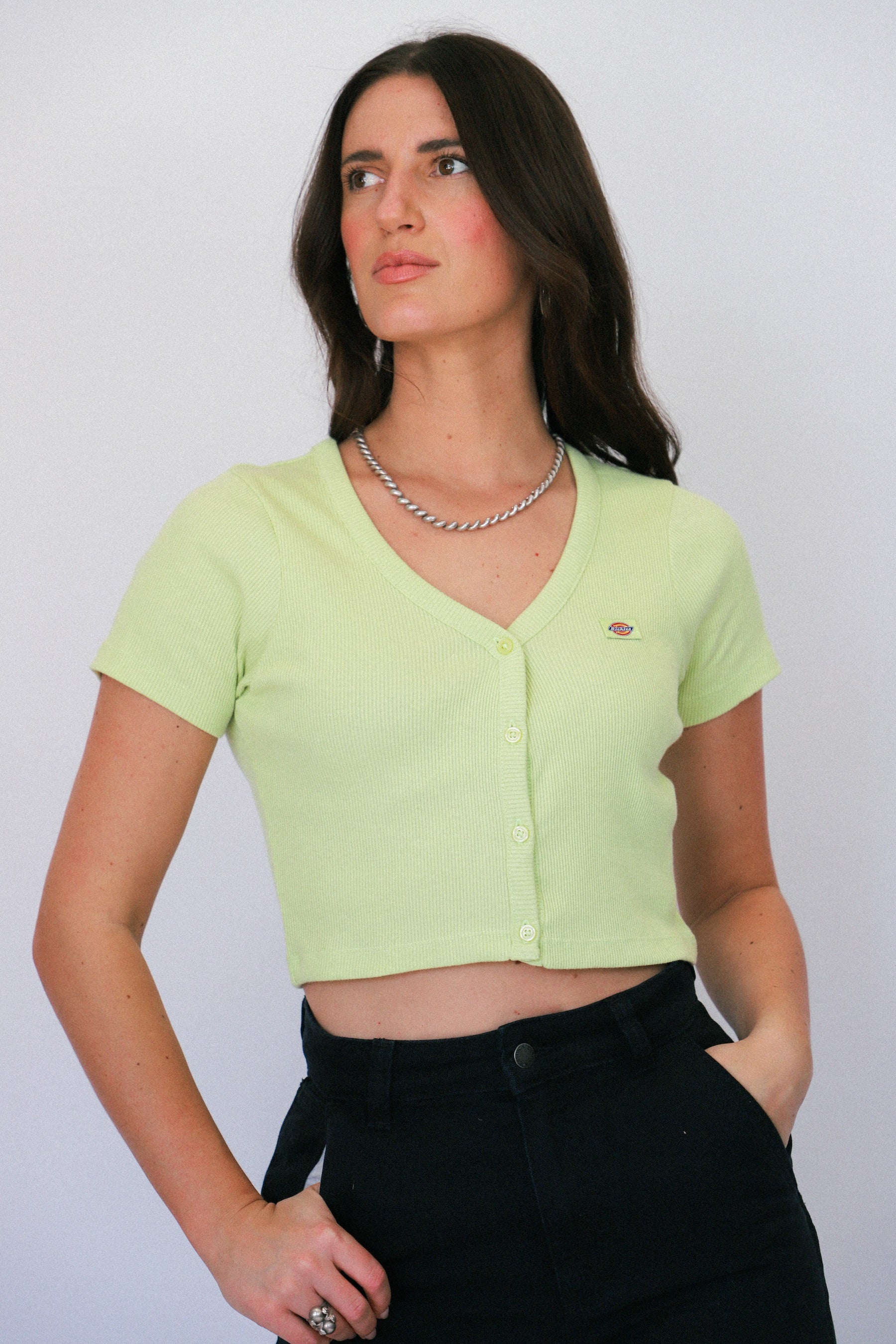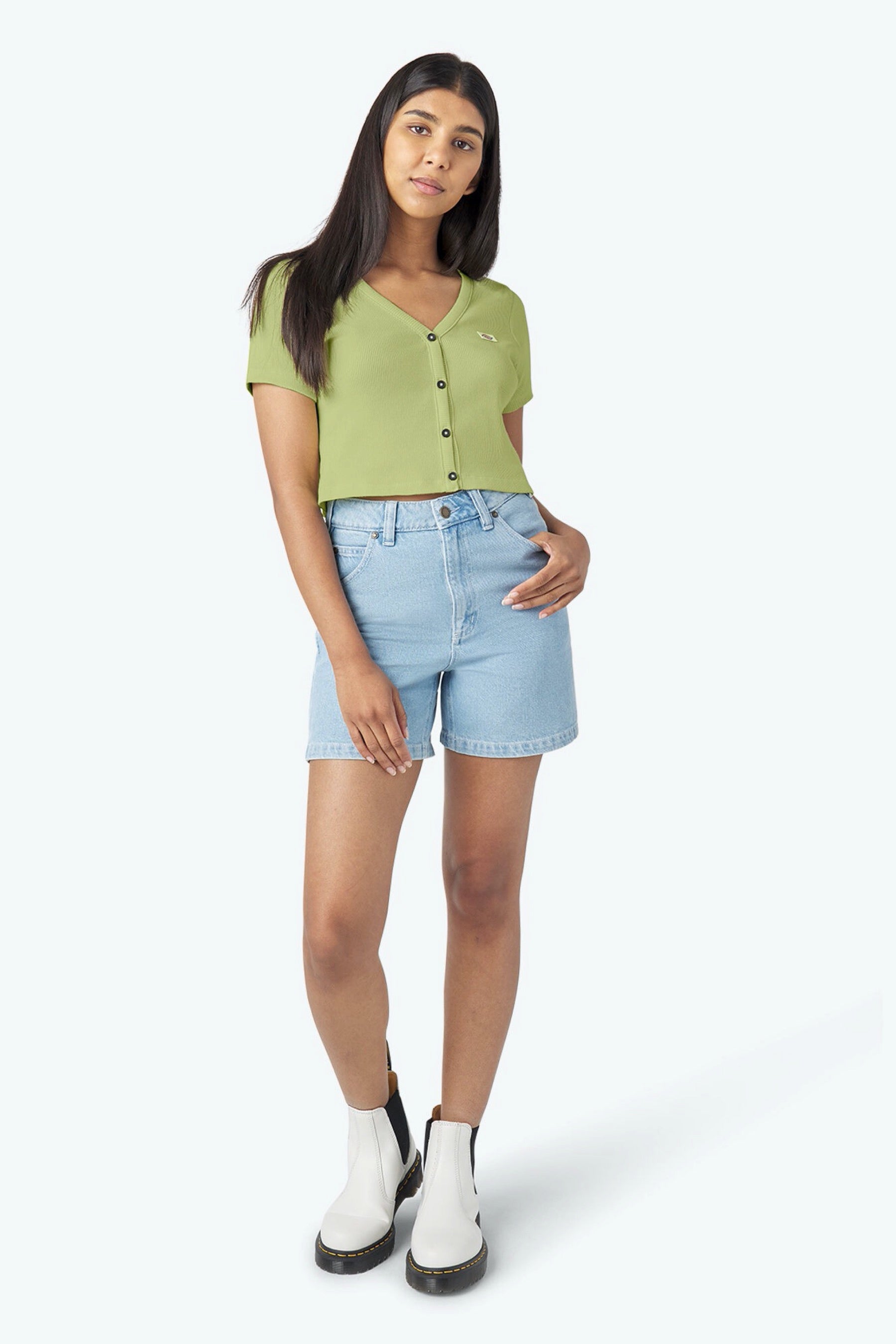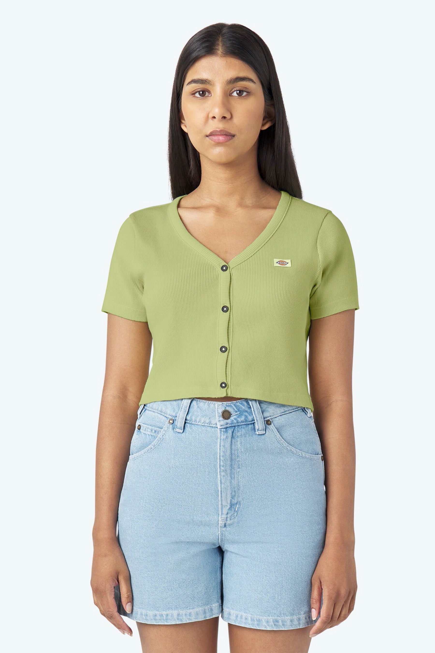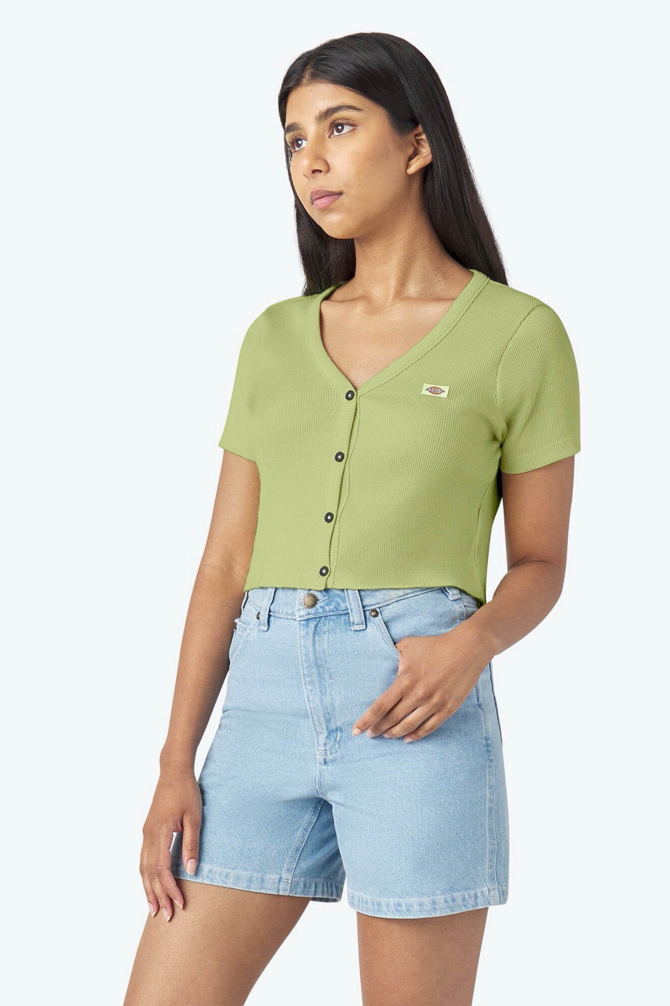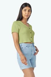 Level up your look with this casual women’s crop top. The versatile silhouette features a flattering slim fit, button front closure.