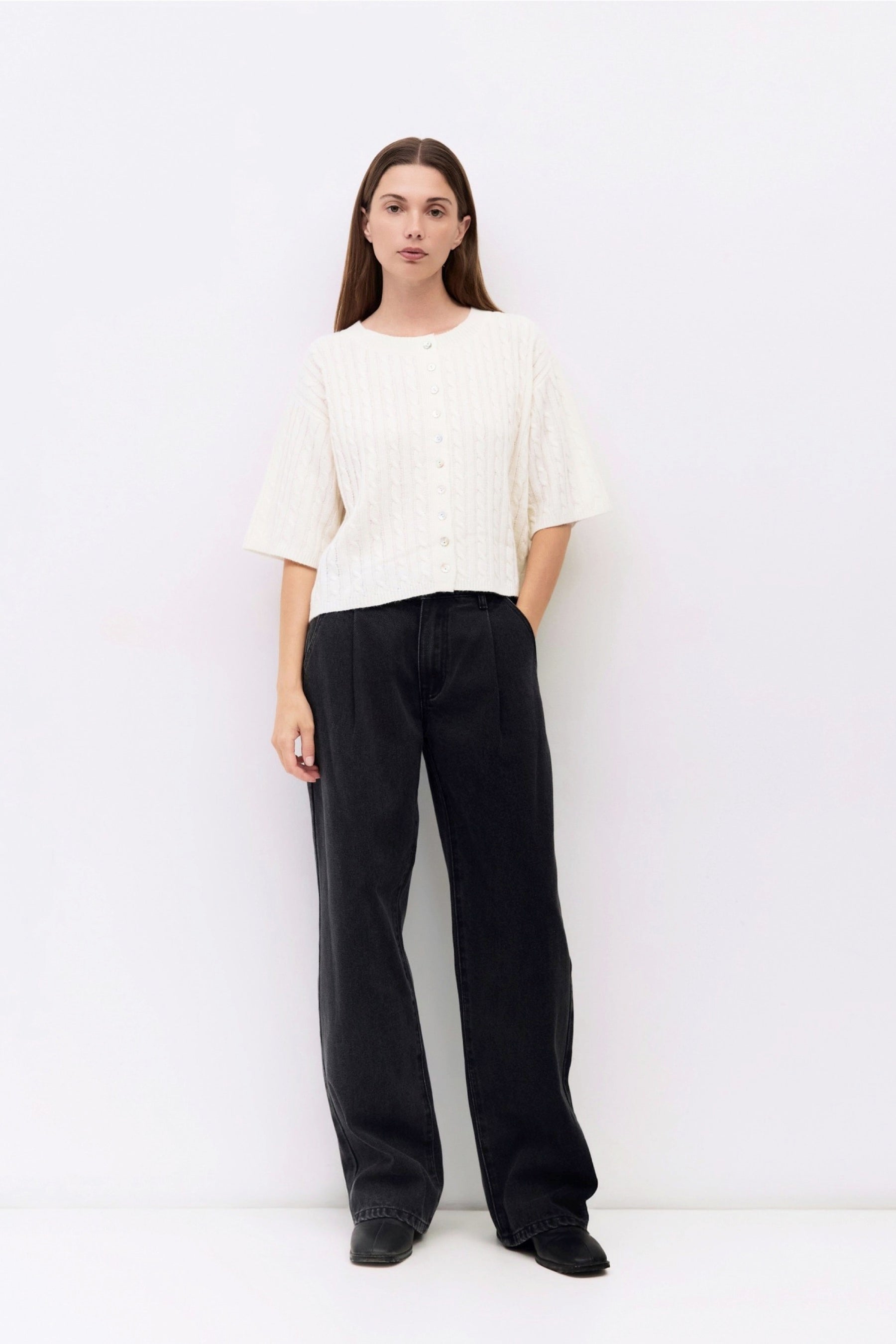The Poppy Cardigan is a relaxed-fit piece crafted from midweight cable knit, featuring elbow-length sleeves for a fresh twist on a classic. With a wide ribbed neckline and front button closure, it’s an effortless layering essential.