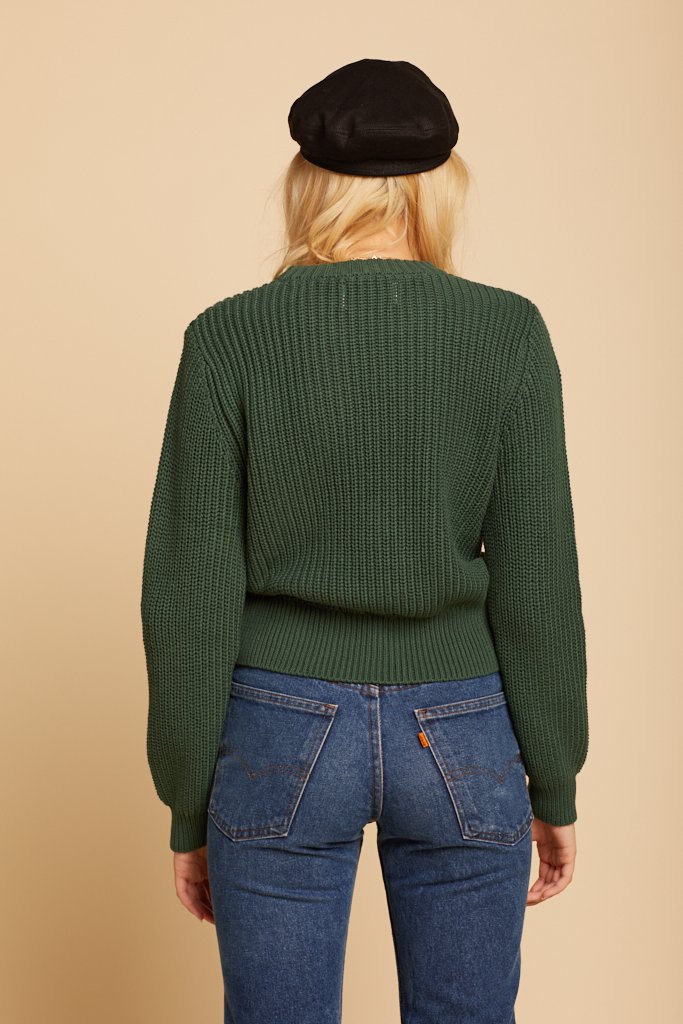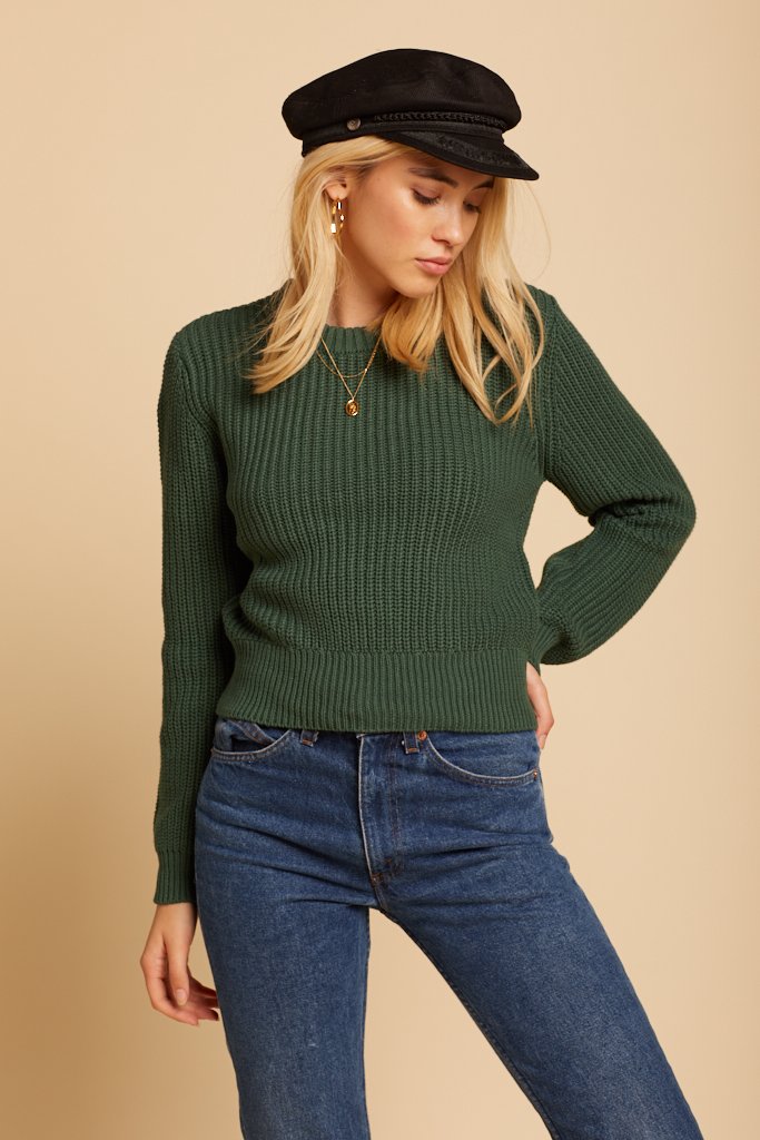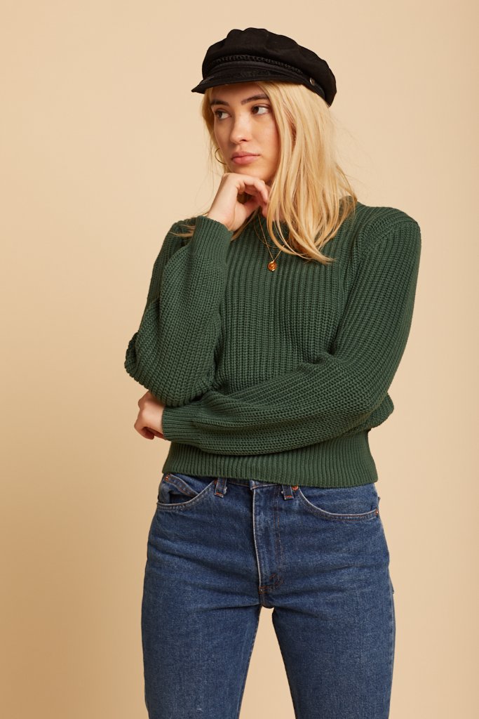 Get cozy in this forest green knitted sweater with a crew neckline.