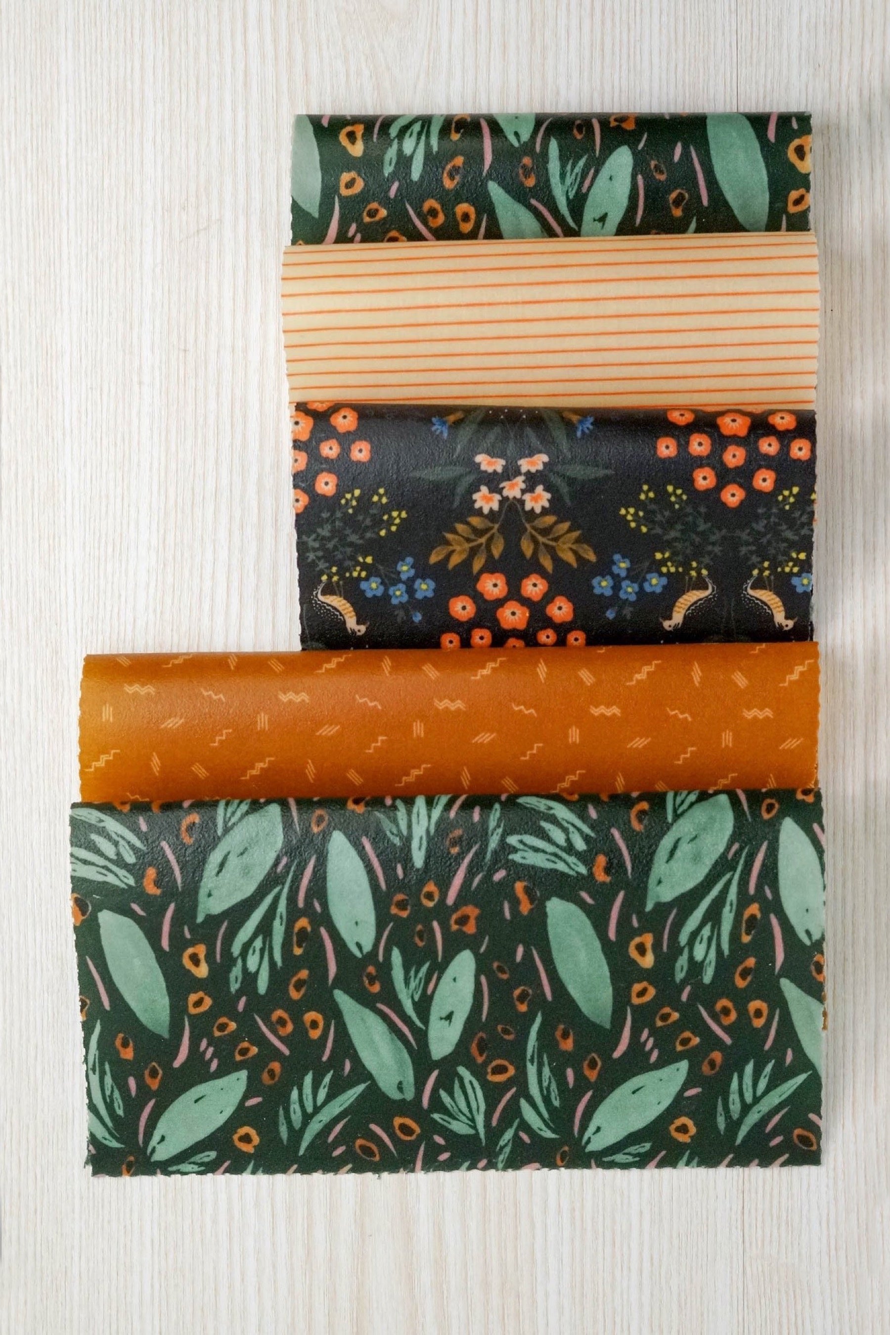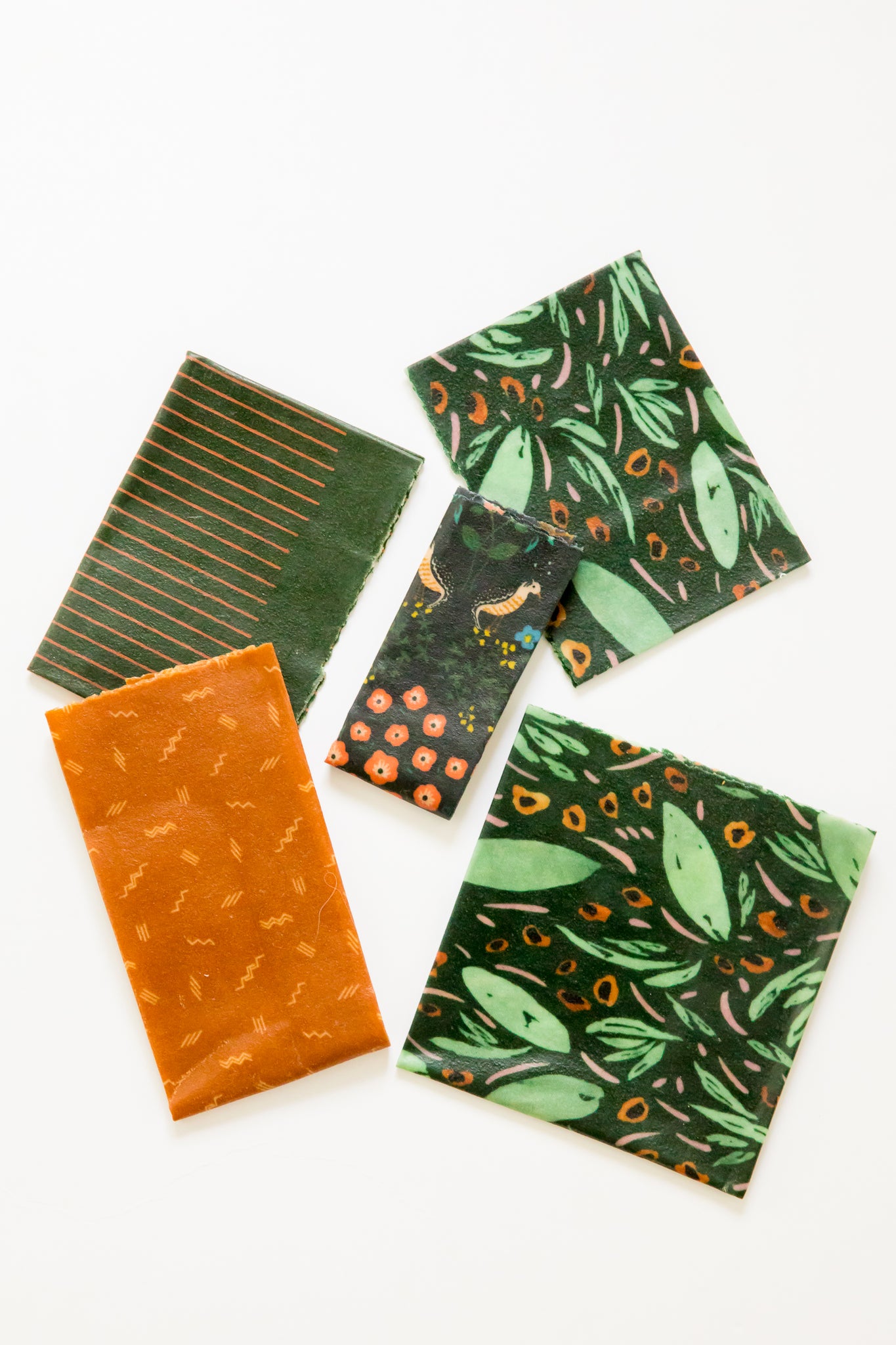 This listing is for 1 set of 5 reusable, all-natural, beeswax wraps. These small batch limited prints are made with beeswax, pine rosin, organic jojoba oil, and organic cotton cloth.