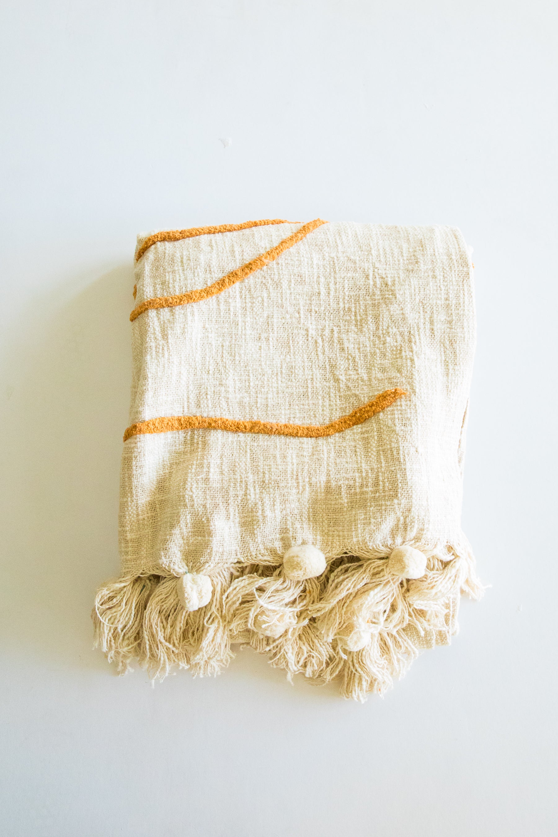 This cozy blanket with abstract embroidered stripes is perfect for a summer night on the beach or at the end of your bed!