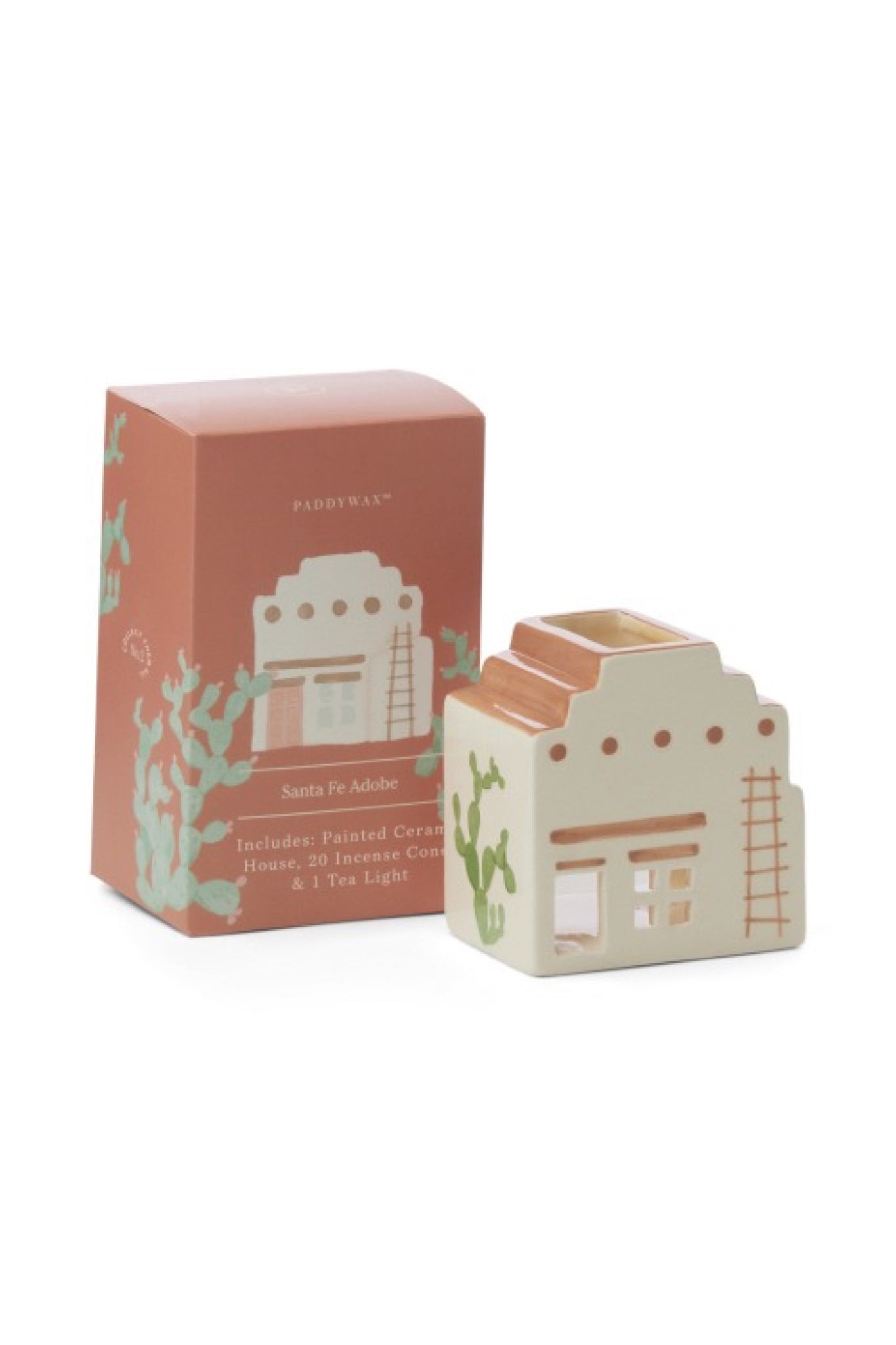 This Incense and Tea Light Holder captures the Santa Fe Adobe charm. It is intended to accommodate either an incense cone or a tea light, making it a versatile and functional decor piece. Each house is intentionally crafted for incense smoke to smolder through the chimney, and for candlelight to flicker through the windows, perfect for creating a warm and inviting atmosphere. Includes 1 Tea Light and 20 Incense Cones.