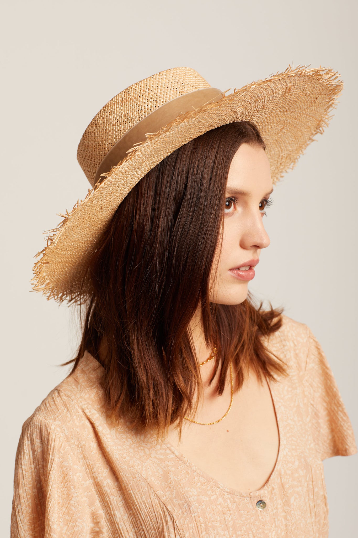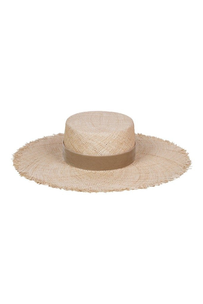 Made for the sunshine. Stay cool in this woven boater featuring a taupe velvet band and frayed edge.
