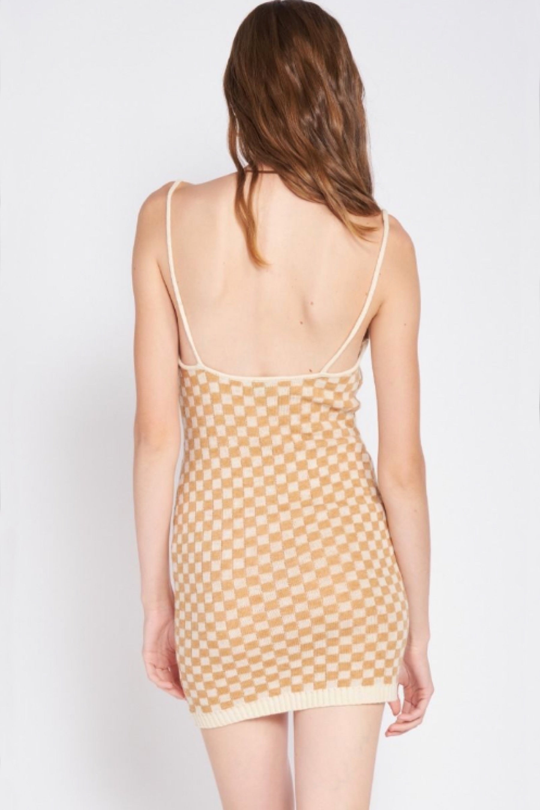 Knit mini dress featuring a checkered pattern and fitted body. Straps are not adjustable.