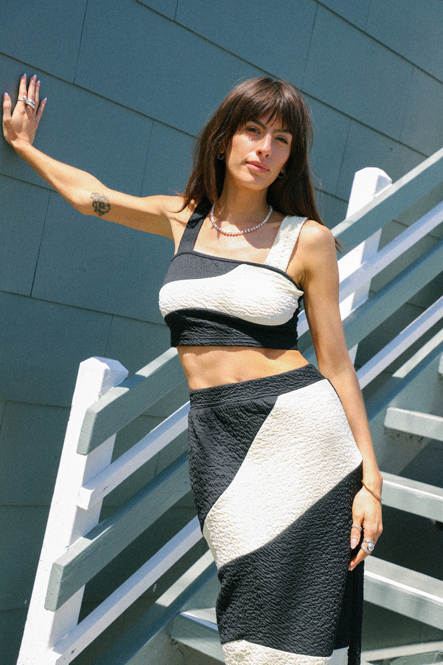 Knit bustier featuring a textured two tone pattern and made from recycled fabric. Ethically made in Portugal.