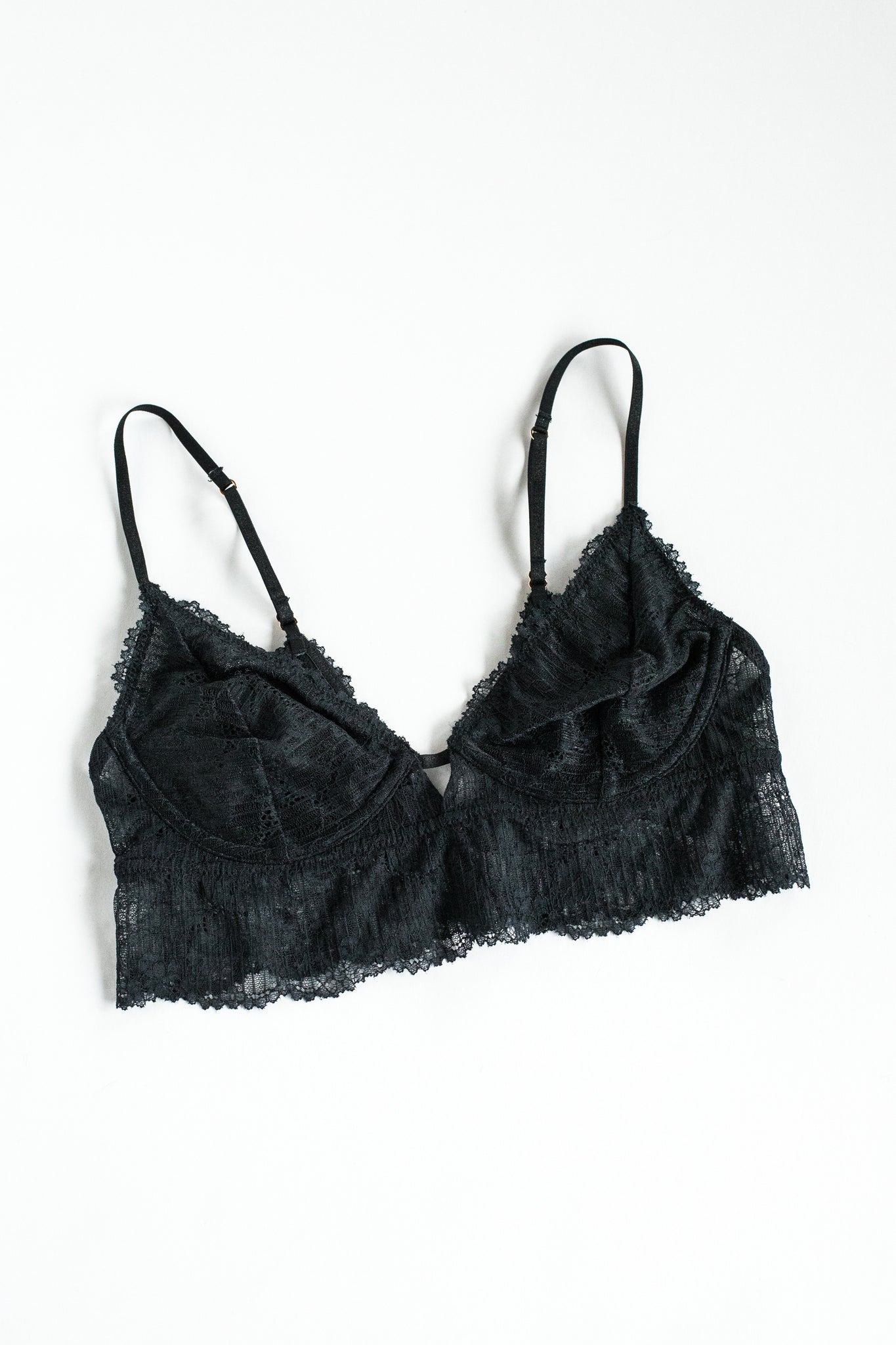 Oh so sweet black lacy bra with underwire cups, adjustable straps and hook closure.
