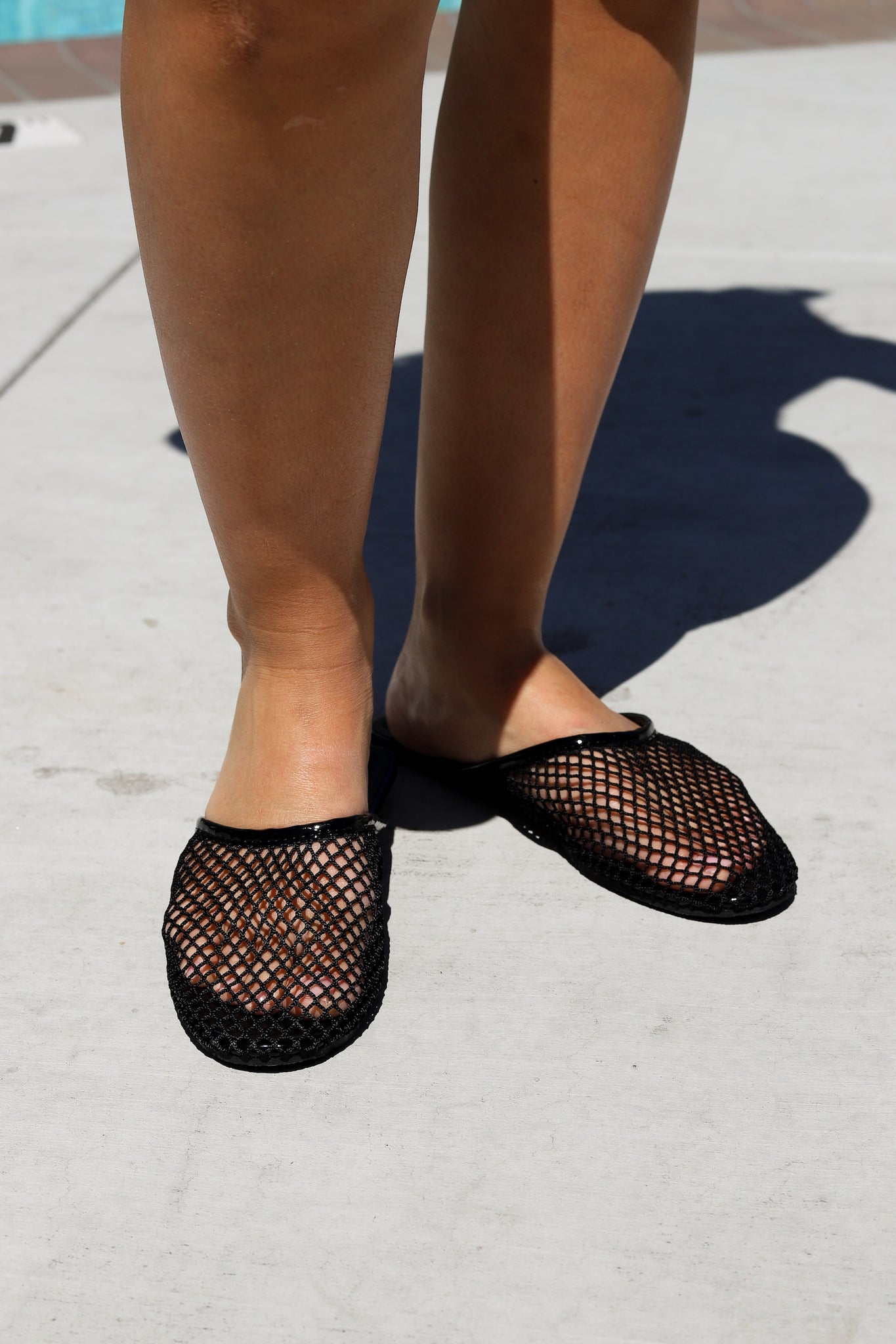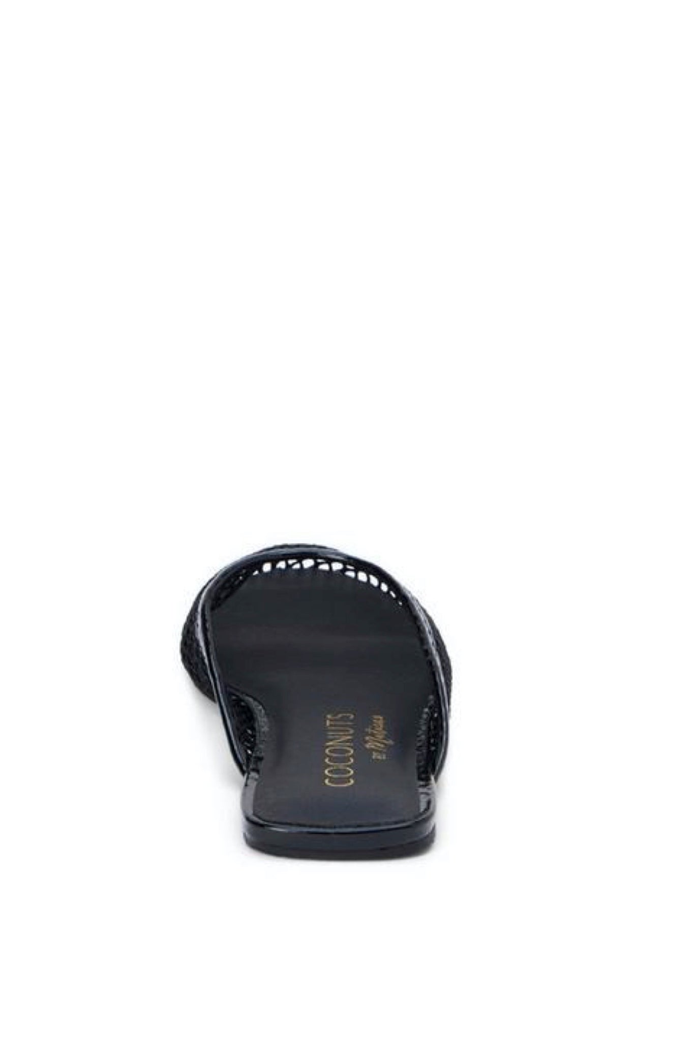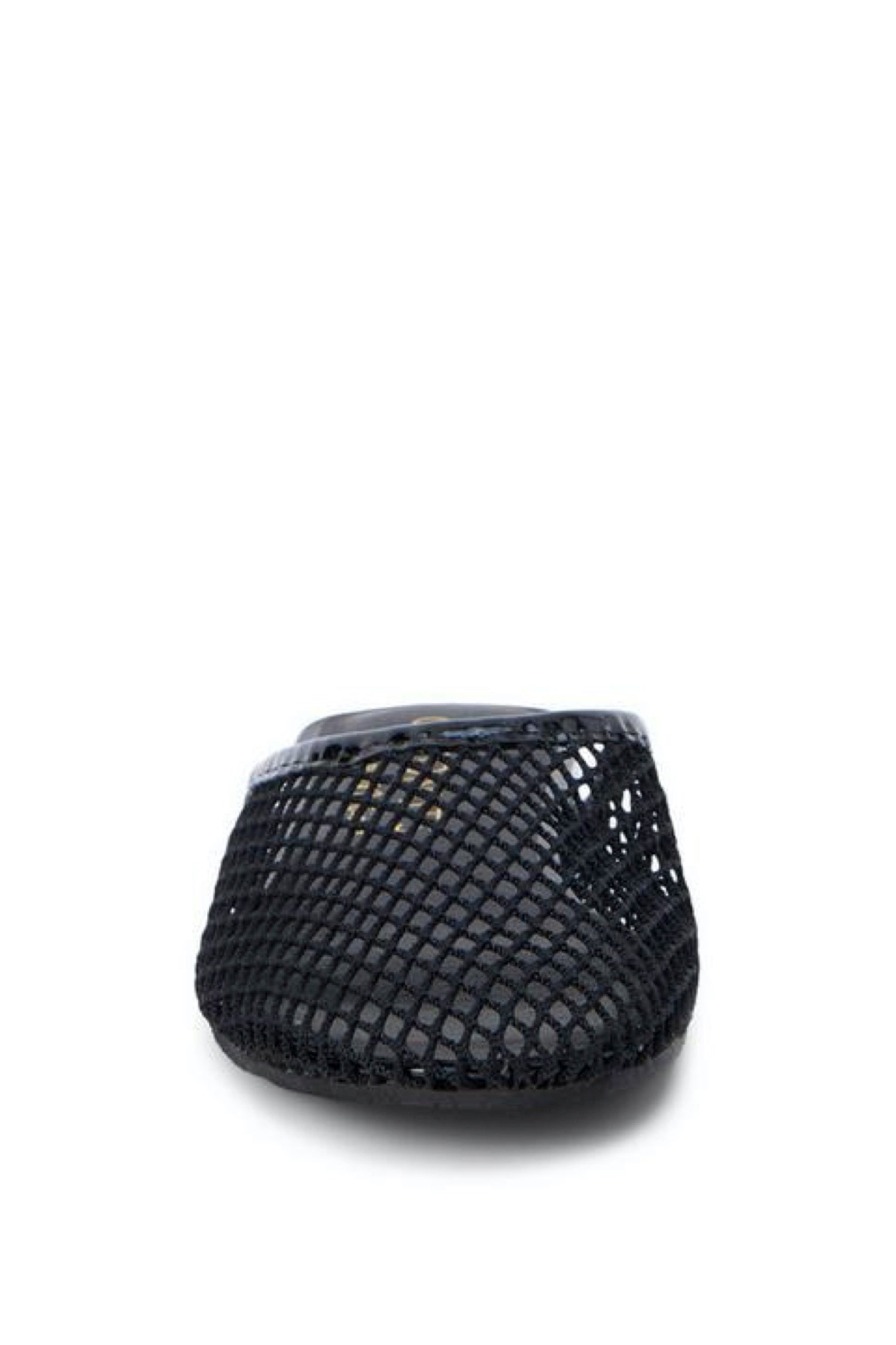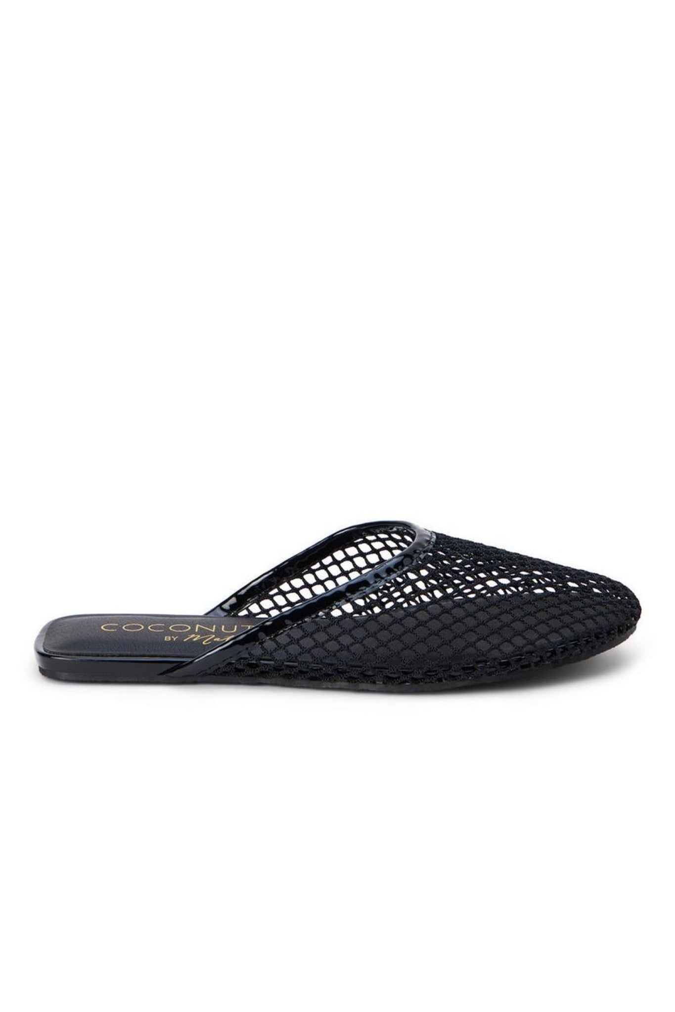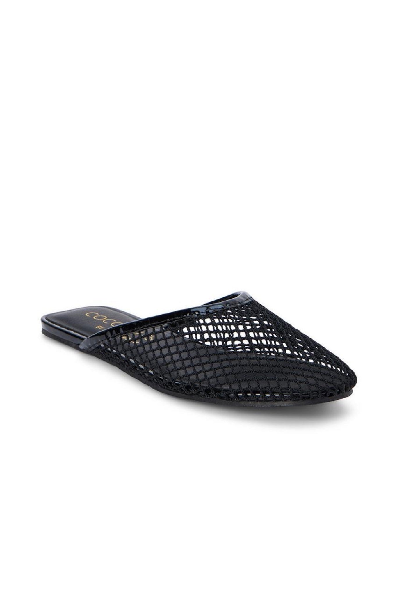 A modern mule featuring a mesh knit upper with vegan leather trim.