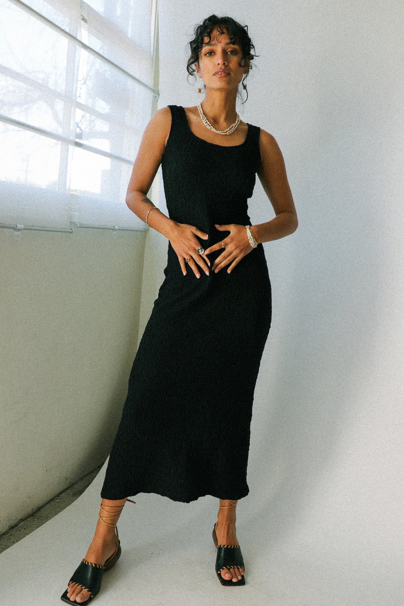 The Claudia Dress is a staple piece to add to your wardrobe. This lovely dress is cut from a soft, popcorn-textured crushed fabric and features a scooped round neck and side slit. Dress it up with a pair of heels or wear it casually with a pair of boots.