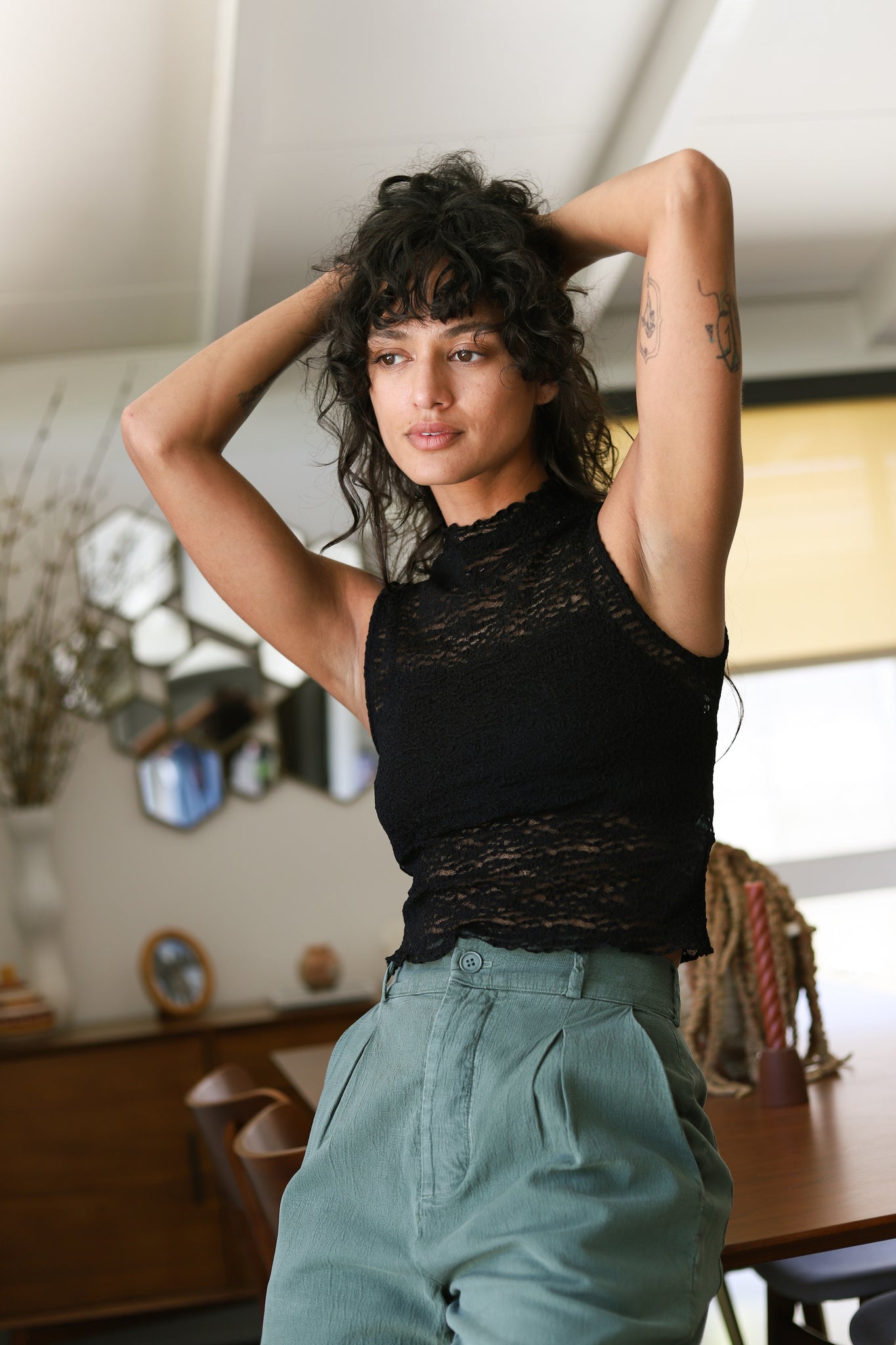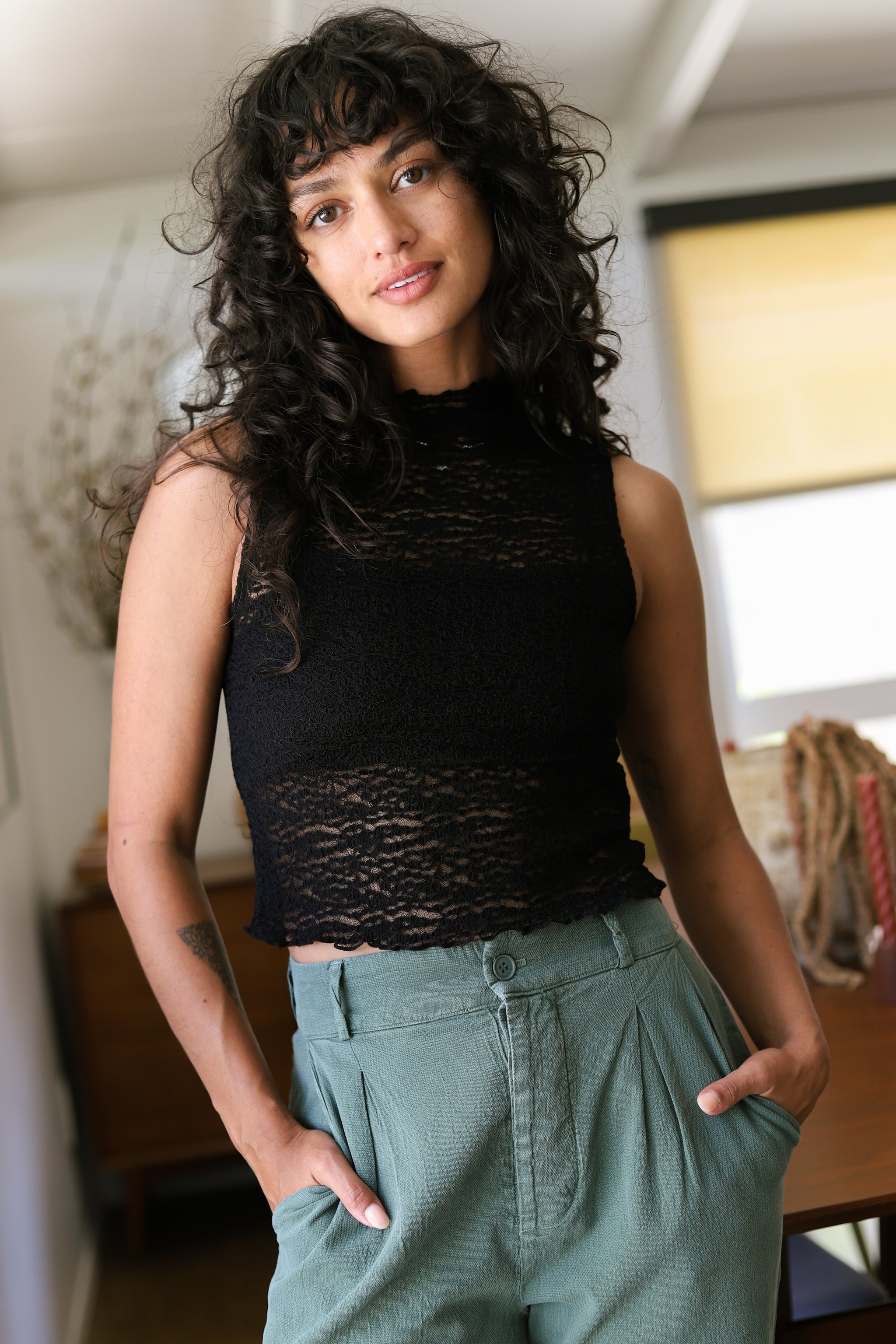 High neck tank with a cap sleeve and cropped fit for a model-off-duty look.