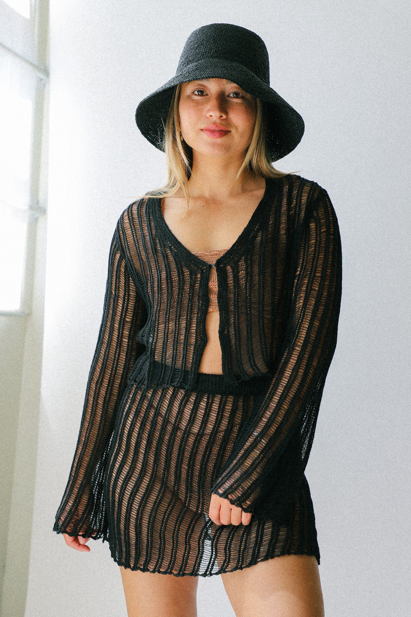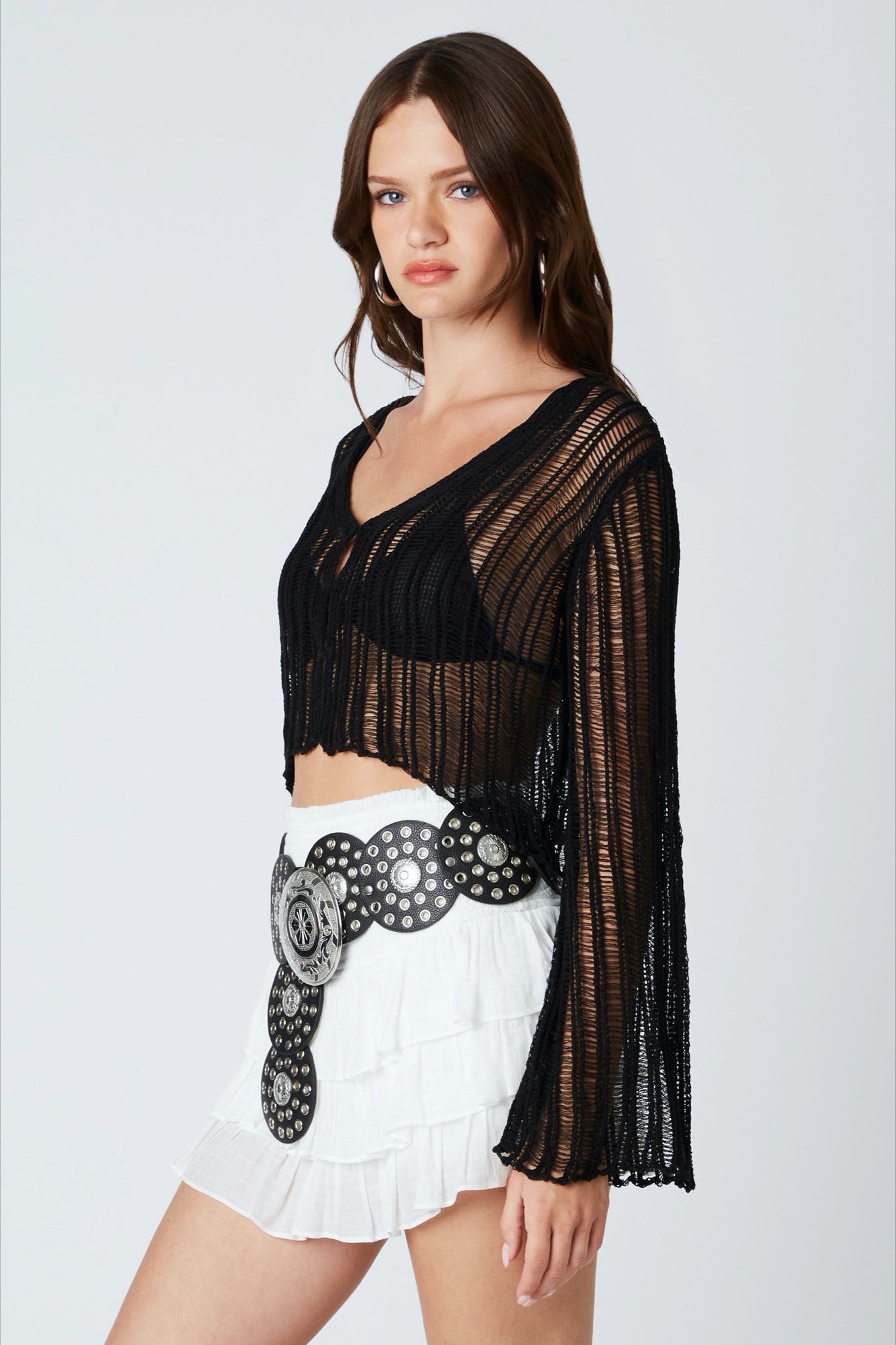 Sheer knit long sleeve top with plunging neckline and hook and eye closure at front.