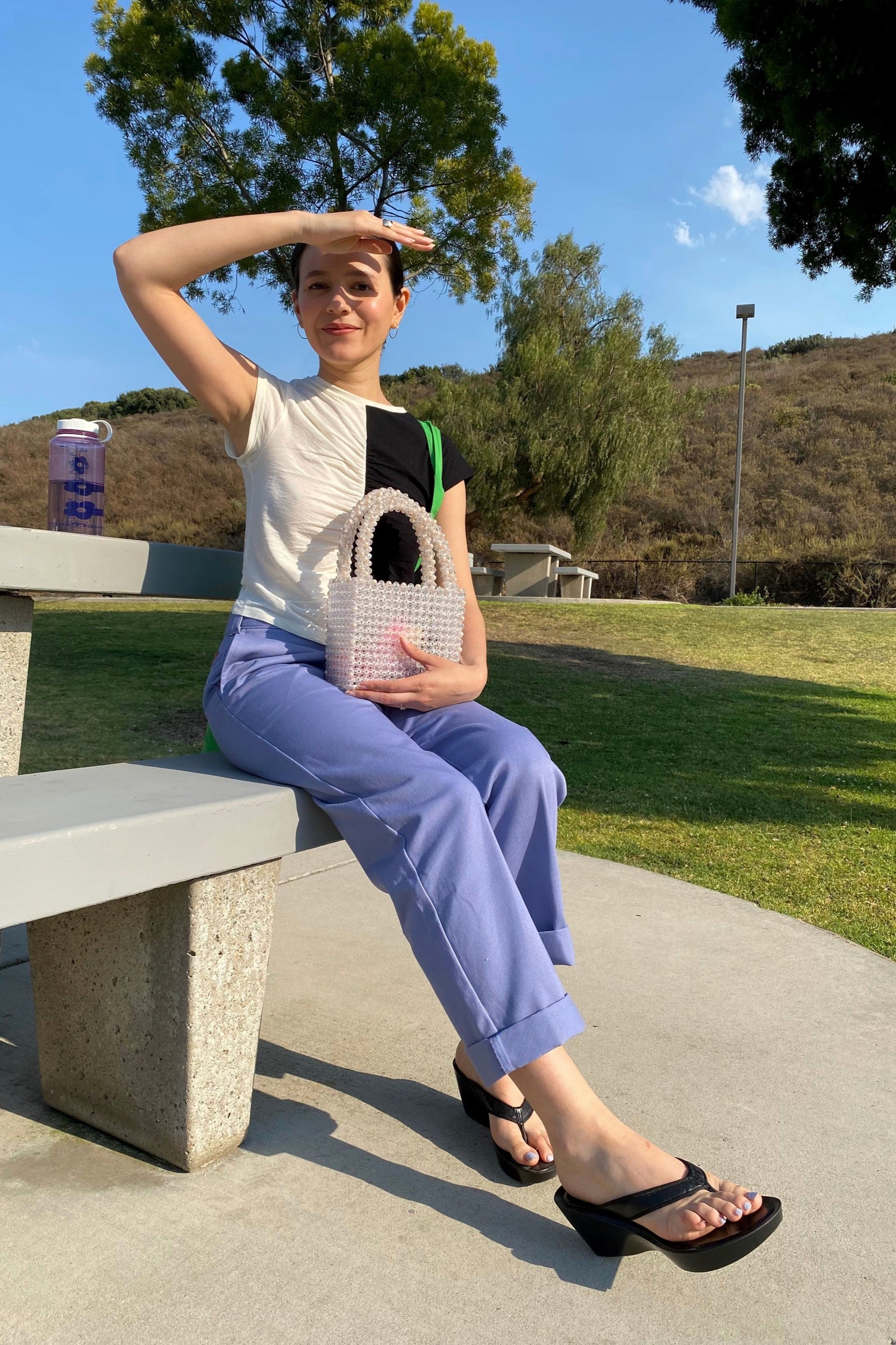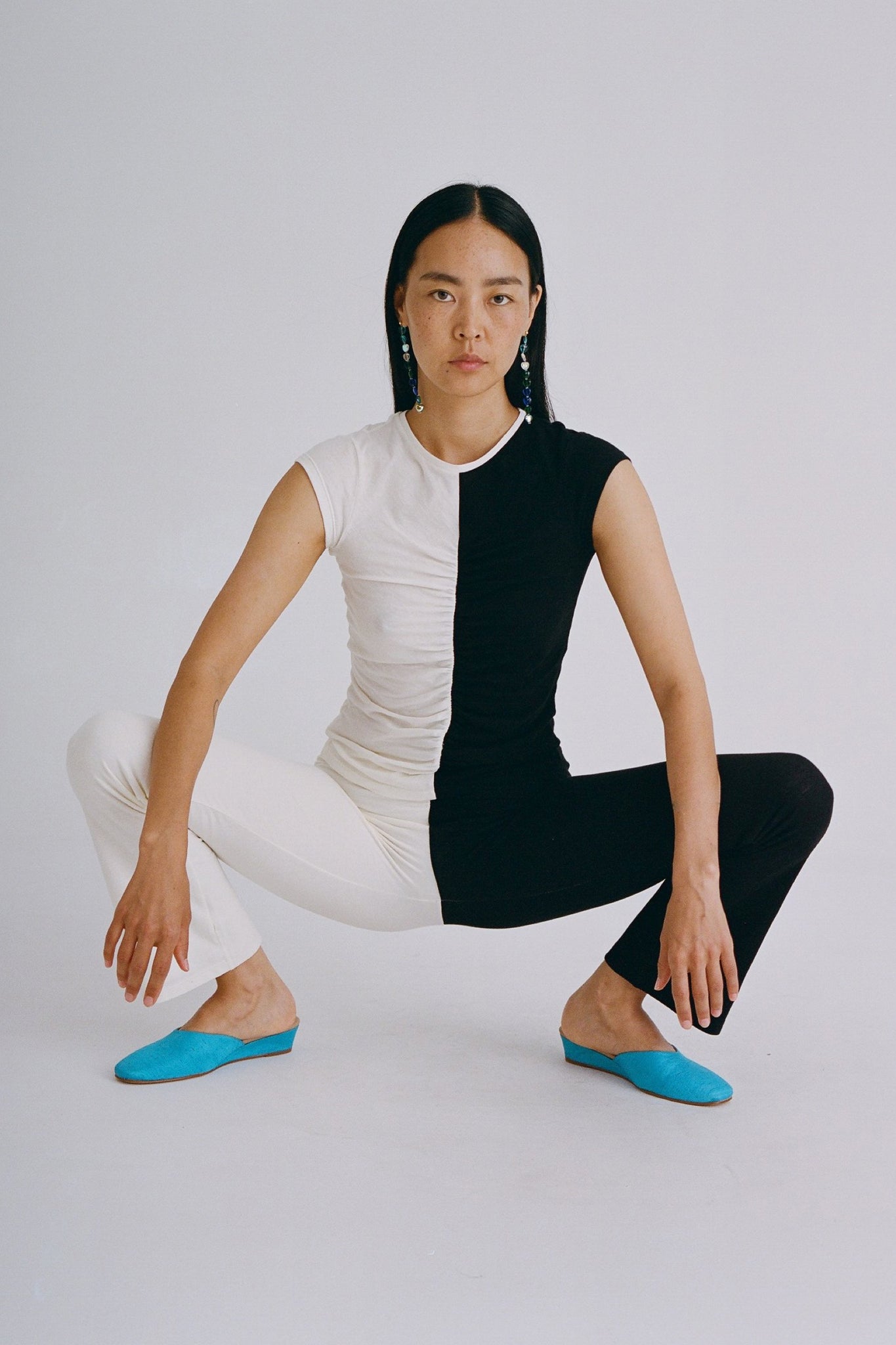 Black and white tee featuring a ruched center, cap sleeve and made with eco friendly organic cotton.