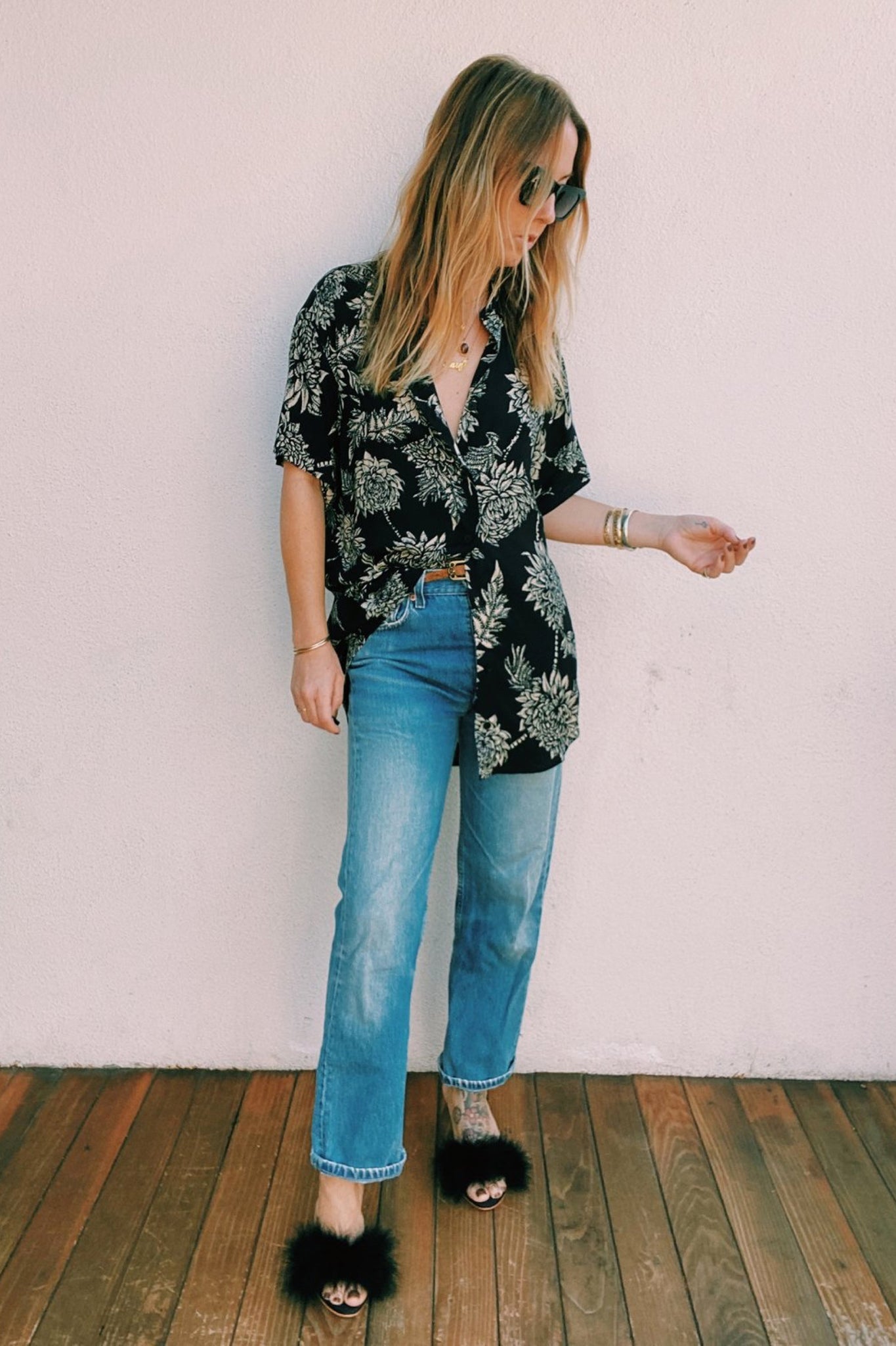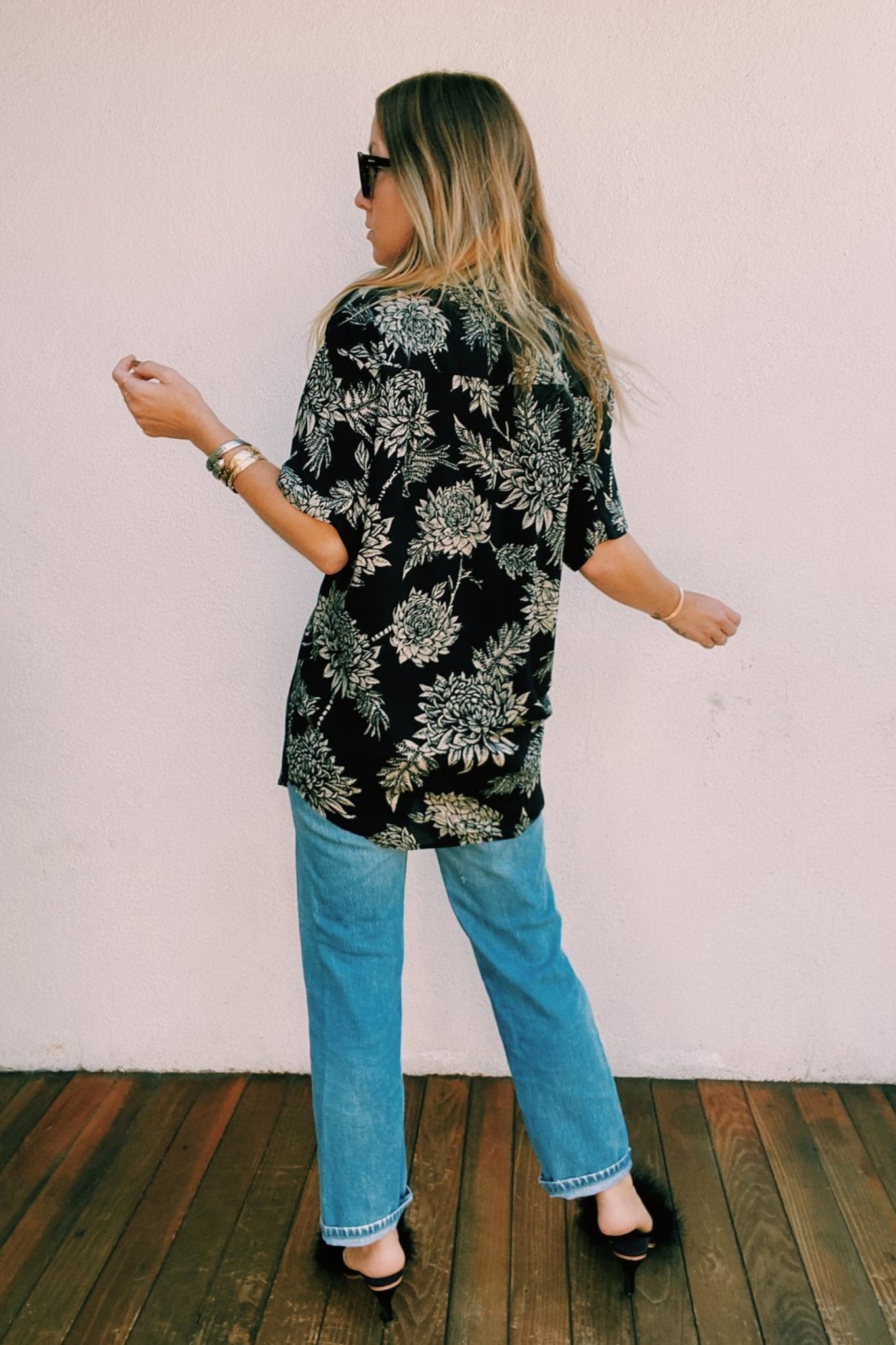 Oversized button down shirt featuring an exclusive Novella Royale print. Made in California. Mary is wearing P/S, Kingman is wearing M/L.