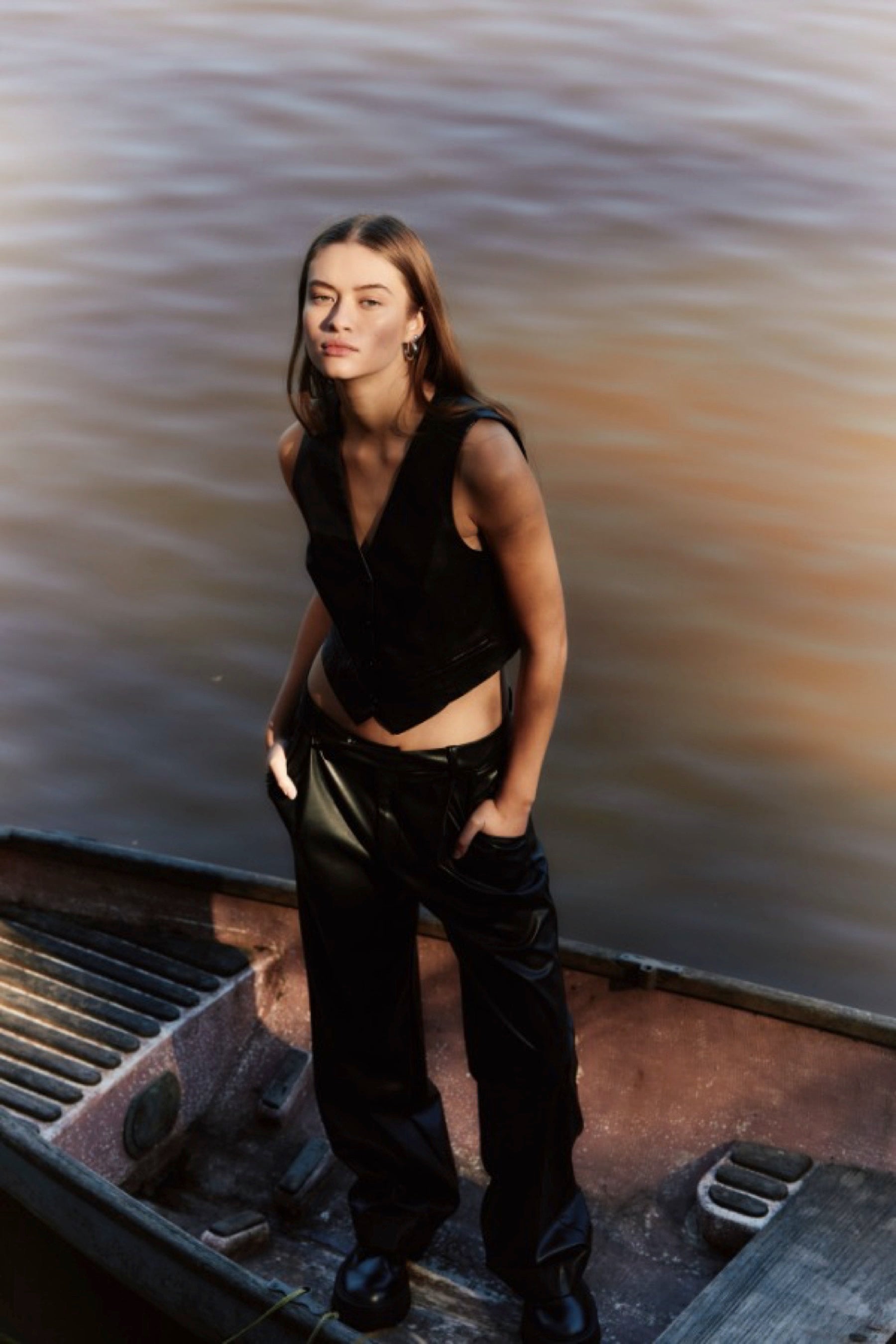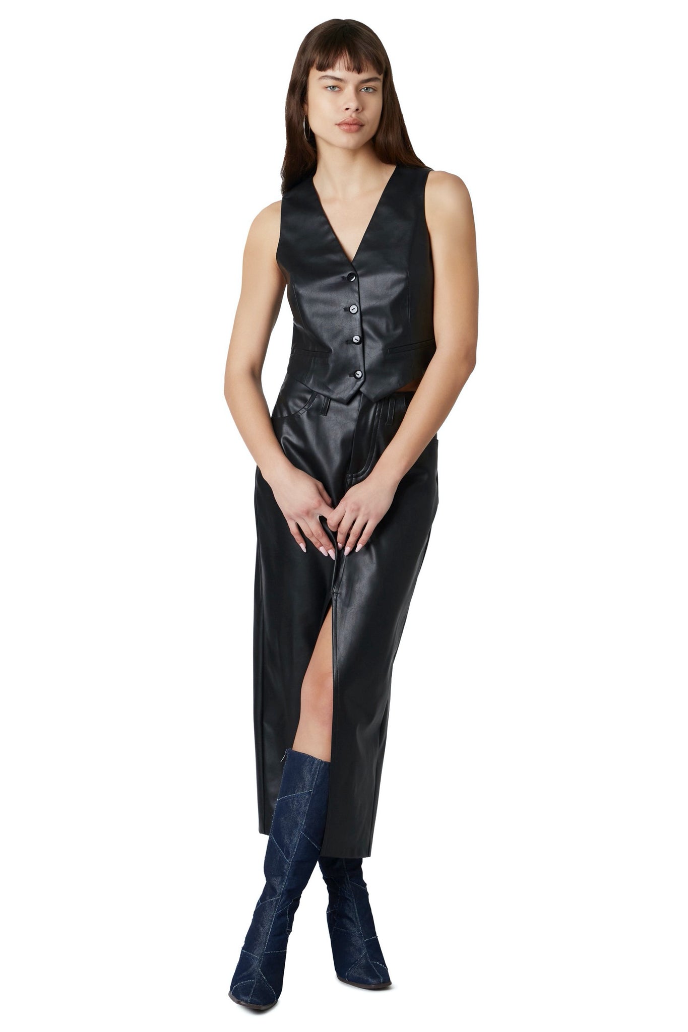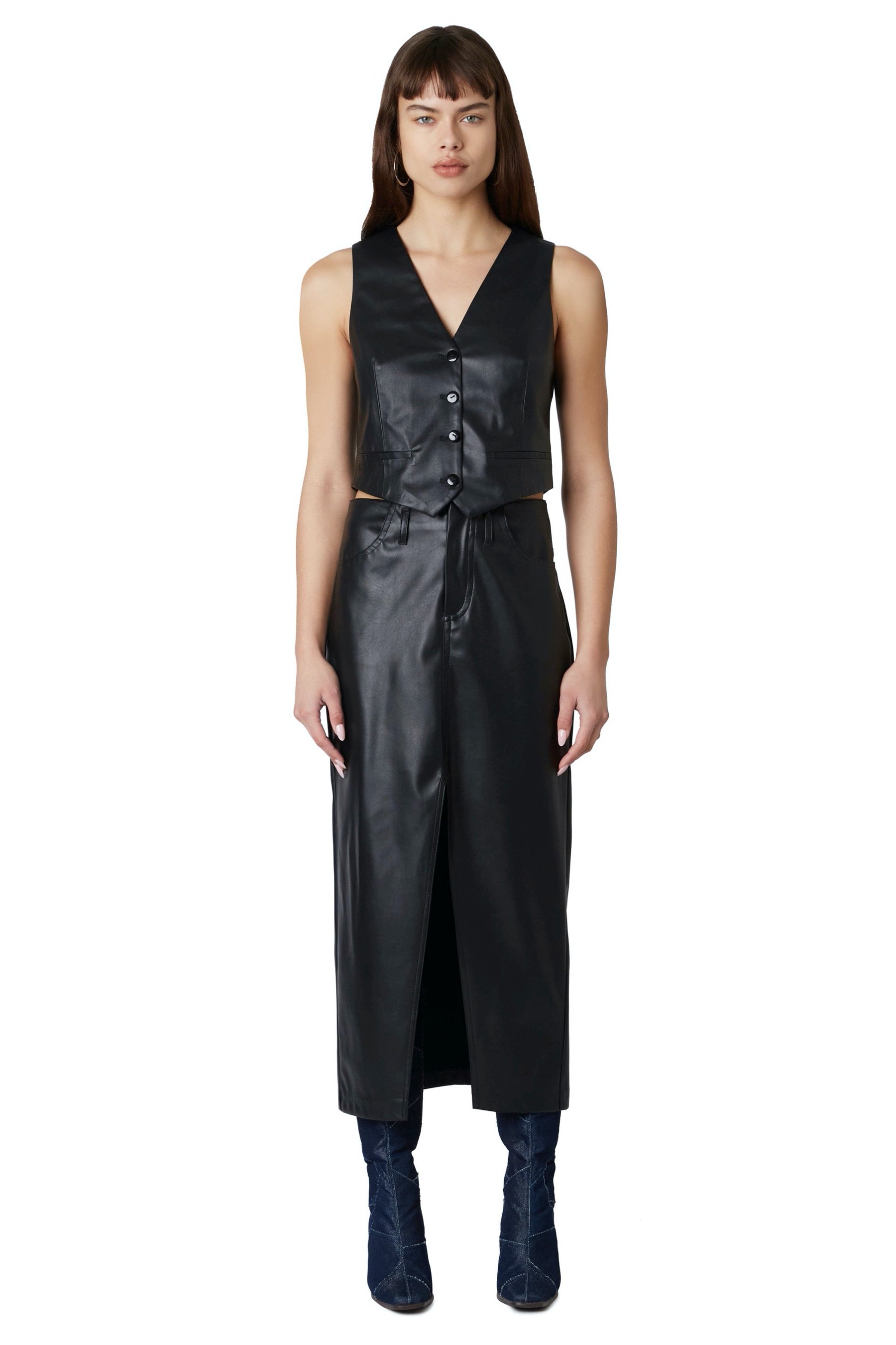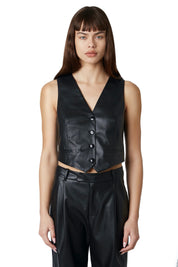 Vegan leather cropped button down vest.