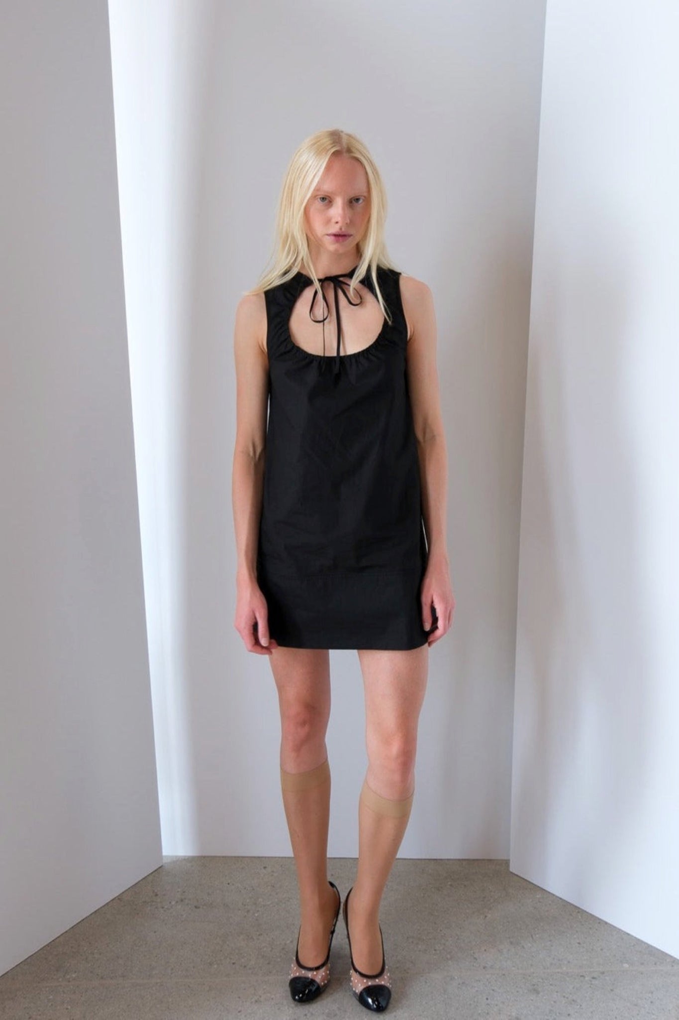 The Eloise is a sleeveless short dress with an adjustable self tie and a ruched keyhole neckline.