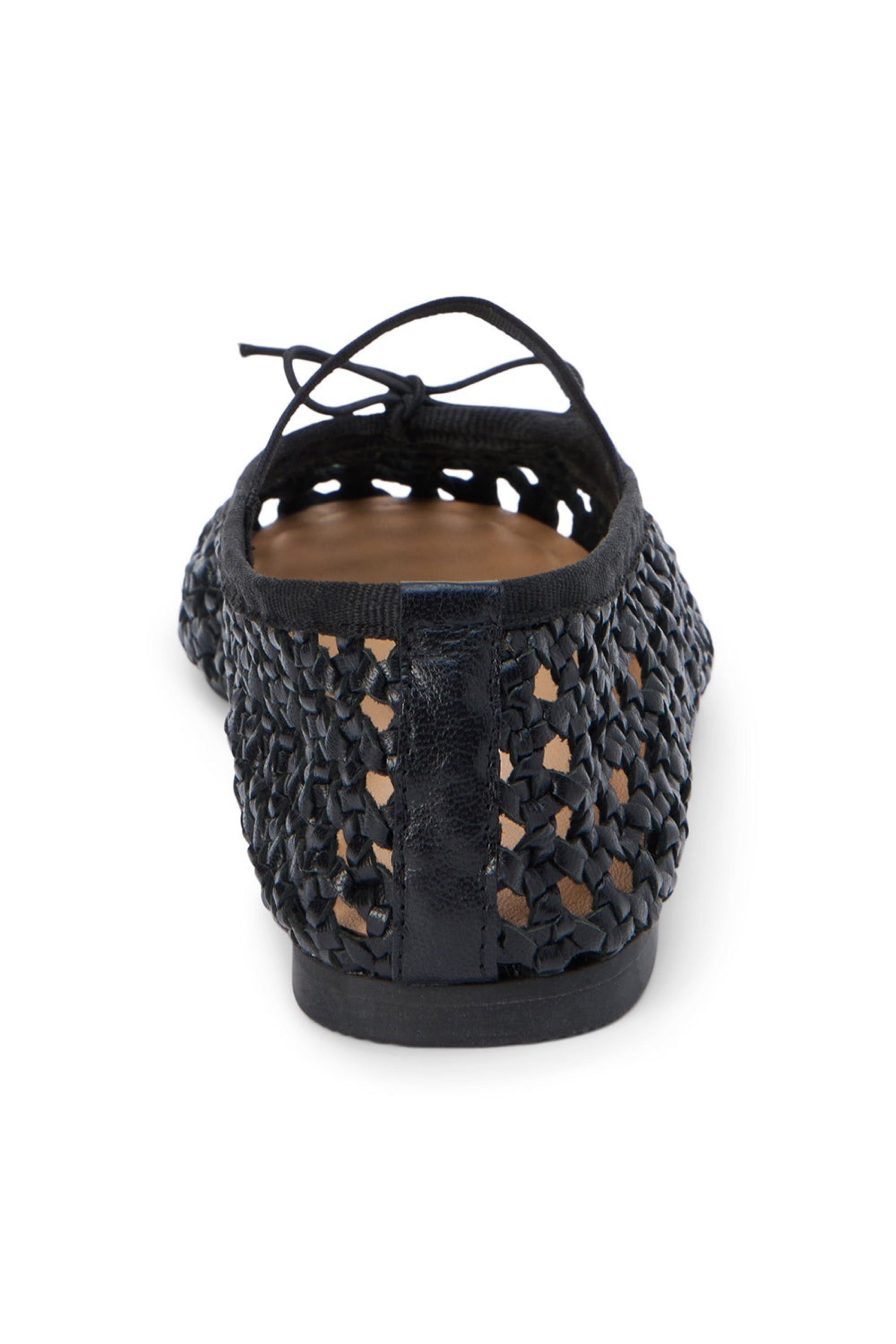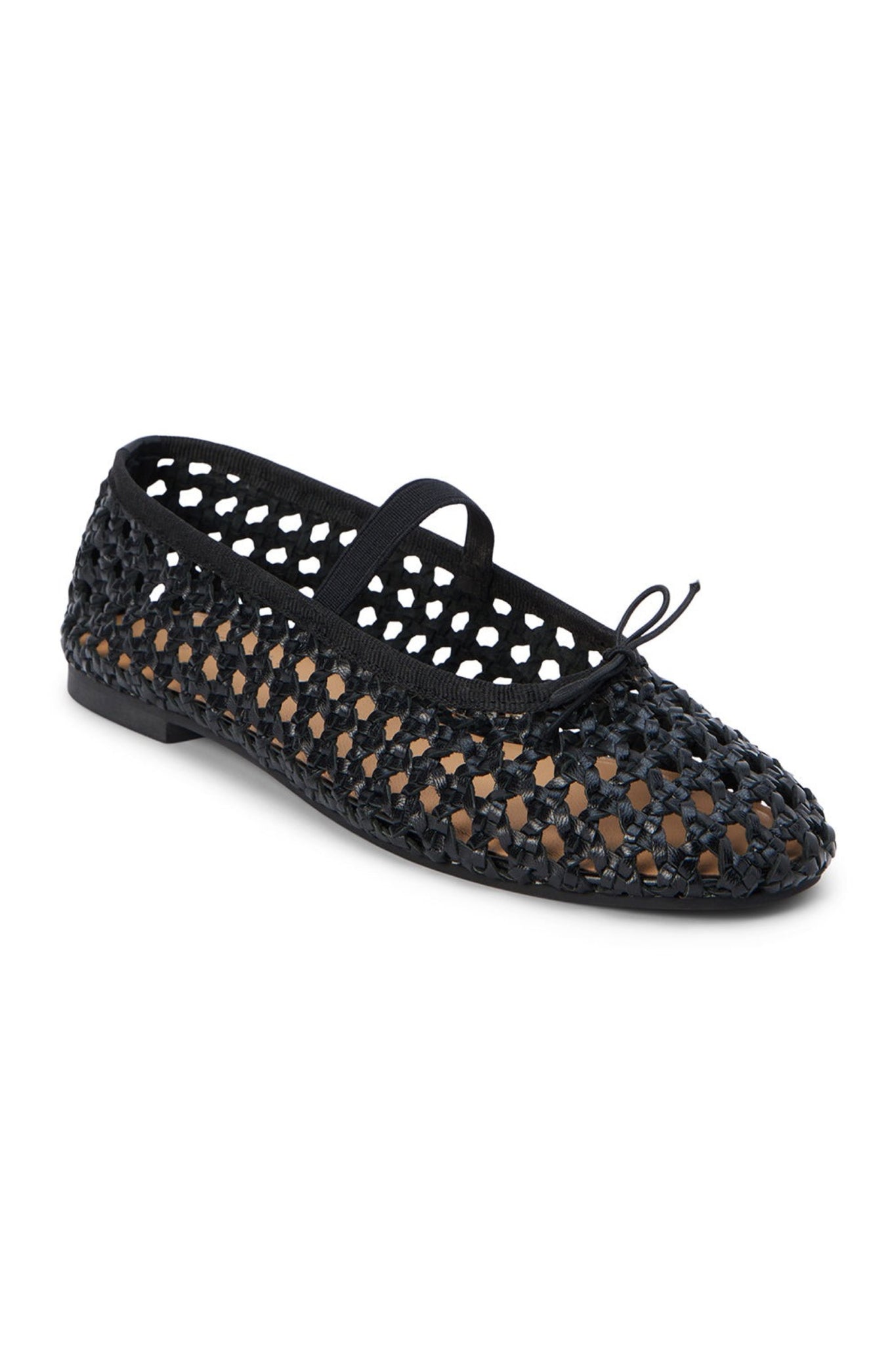 Mary jane flats featuring a woven leather upper and trim with an elastic strap.