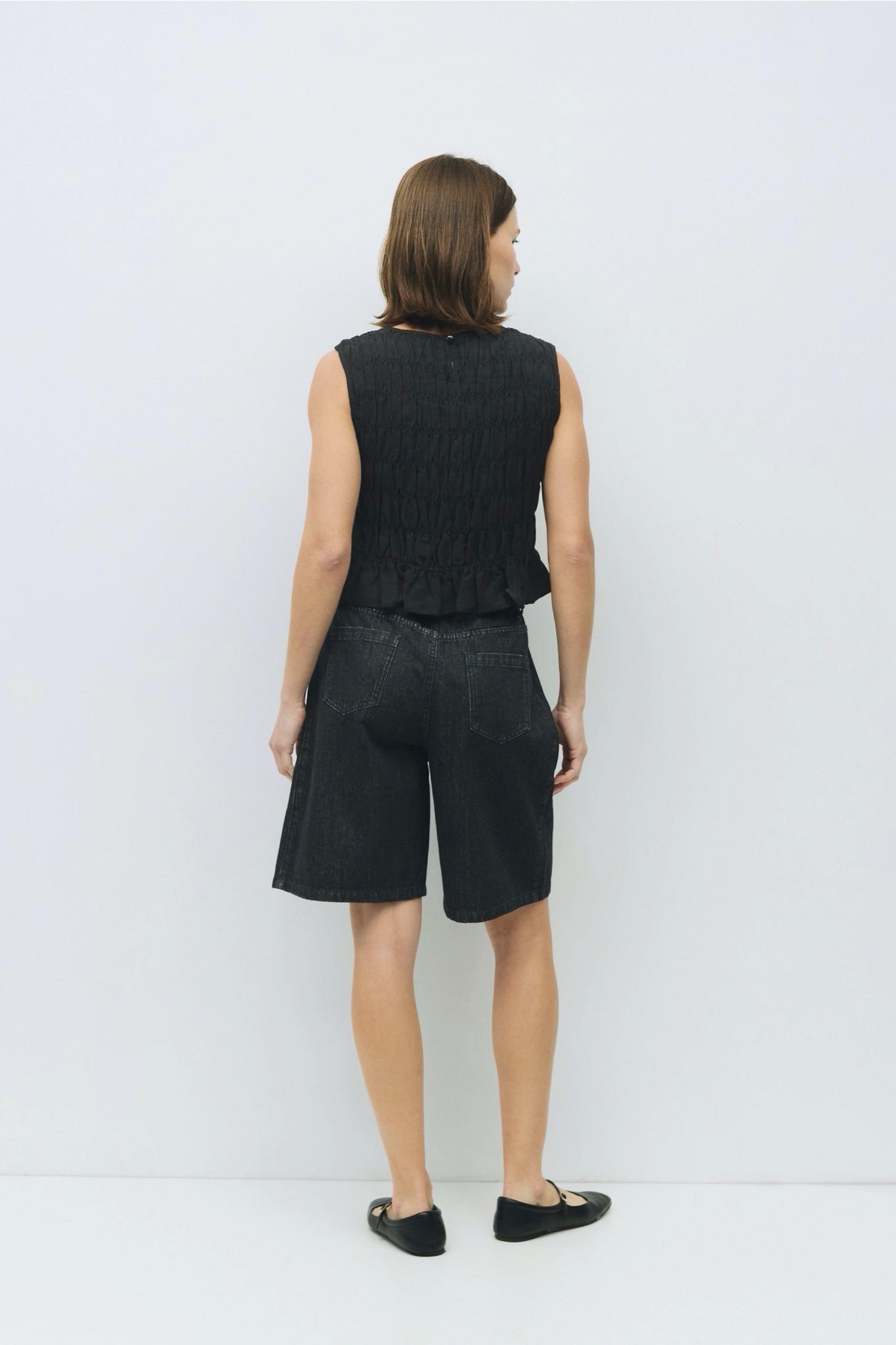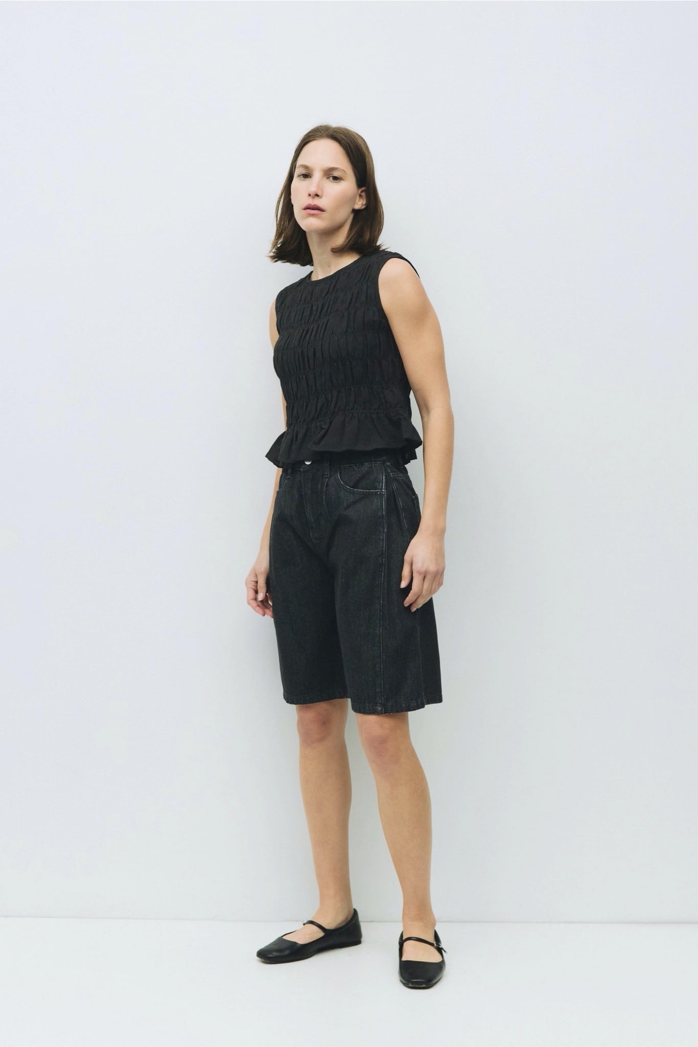 The Florencia Top is a sleeveless smocked linen piece with a high neck and a keyhole back with a button closure. Its smocked front and back, plus a playful bottom ruffle, create a relaxed, cropped fit that’s perfect for the spring and summer.