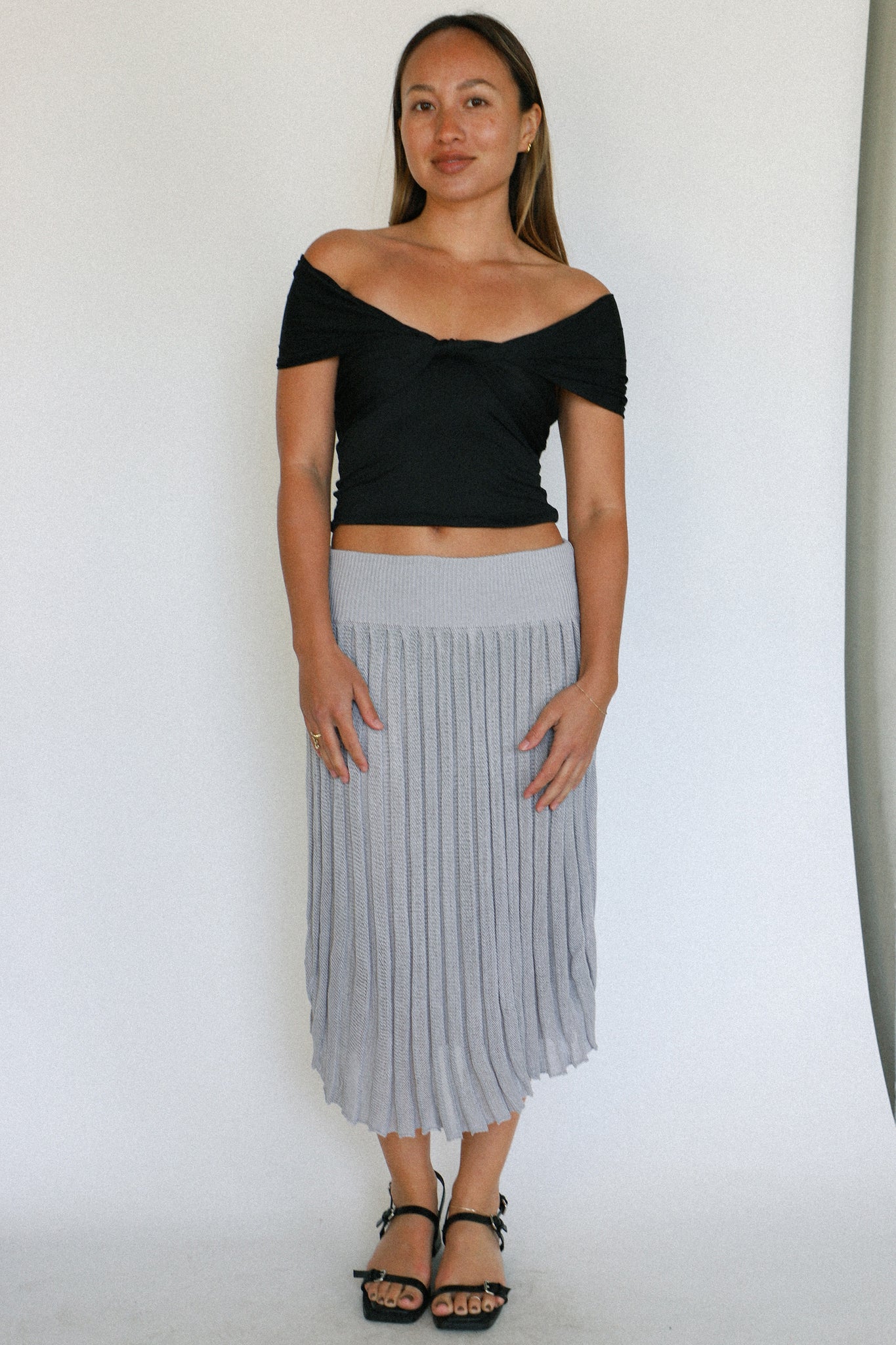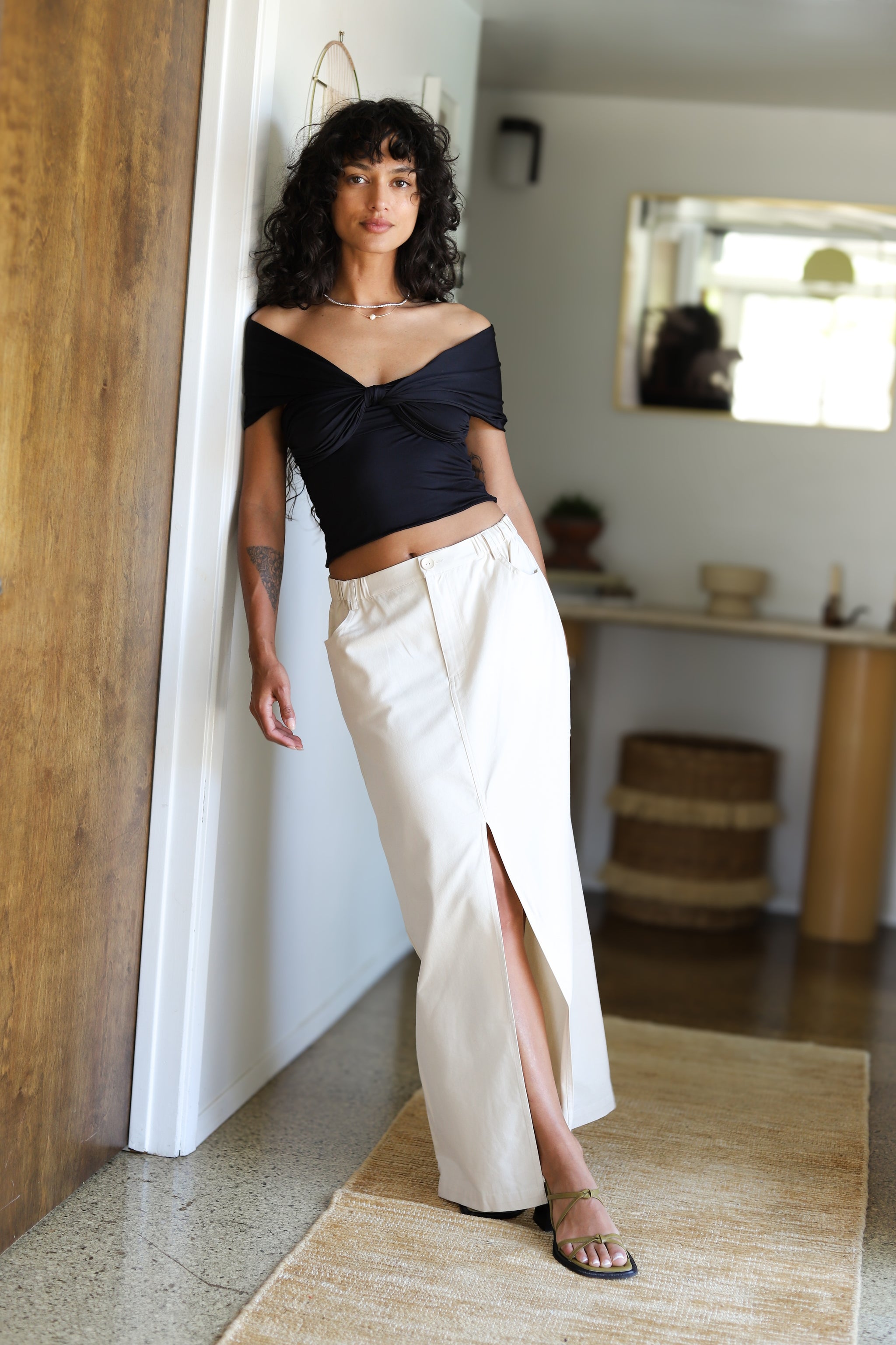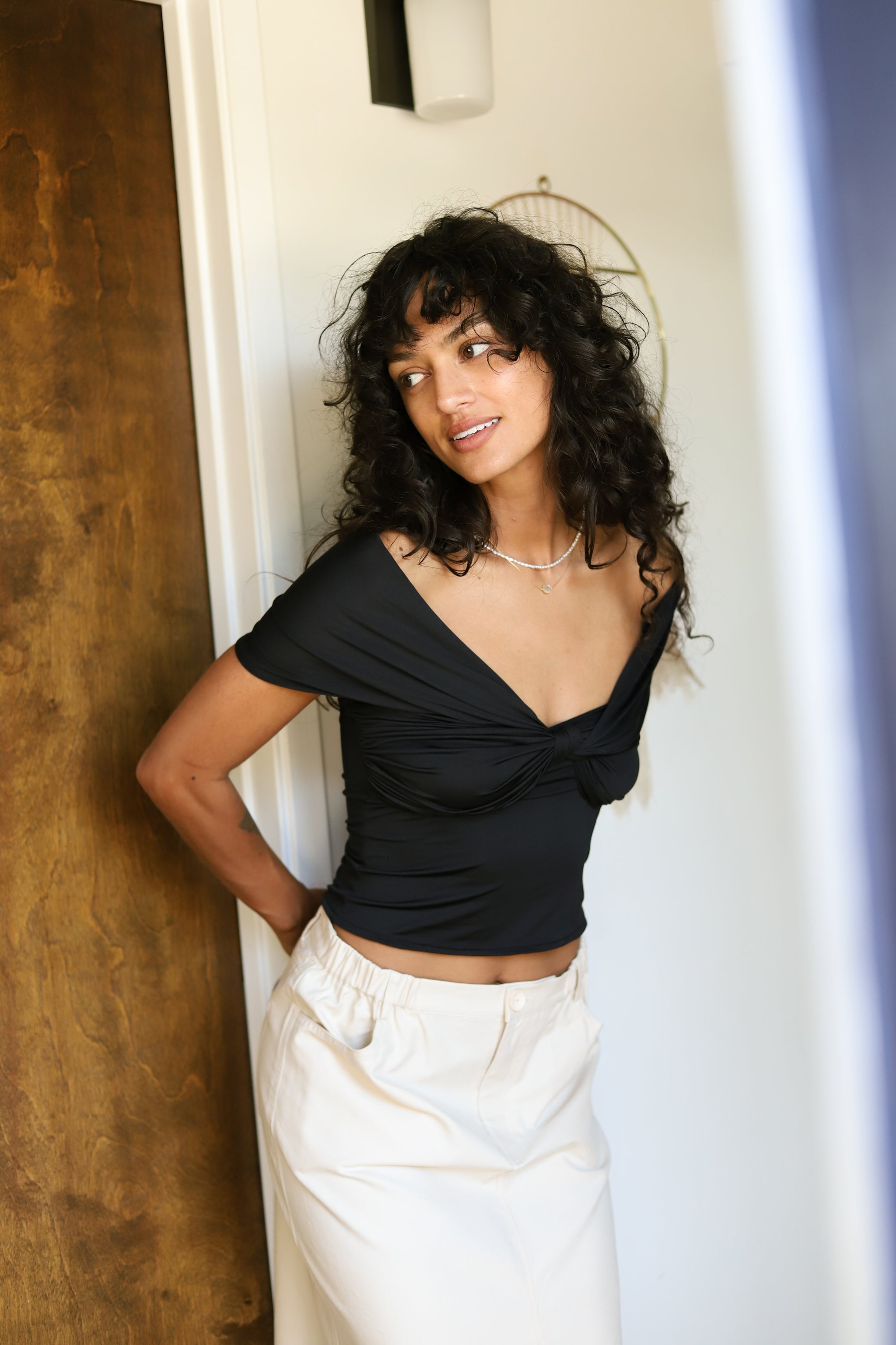 The Peony Top features an off the shoulder silhouette, twisted bandeau bust, and open-back detail.