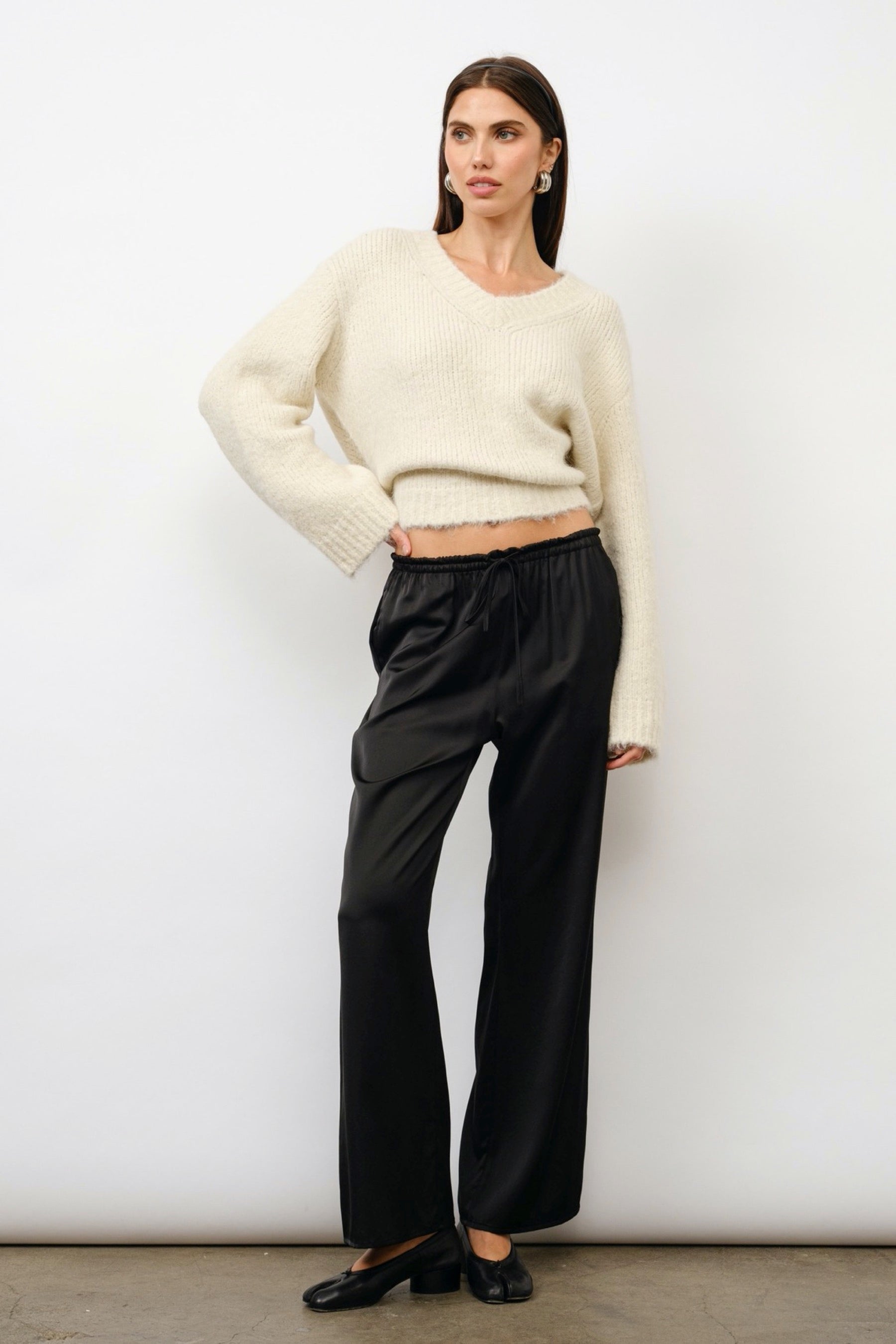 These pants are intentionally crafted for a flowy and elevated look. The drawstring waist adds a touch of casual chic, making it perfect for any occasion. Upgrade your wardrobe with these versatile and stylish pants.